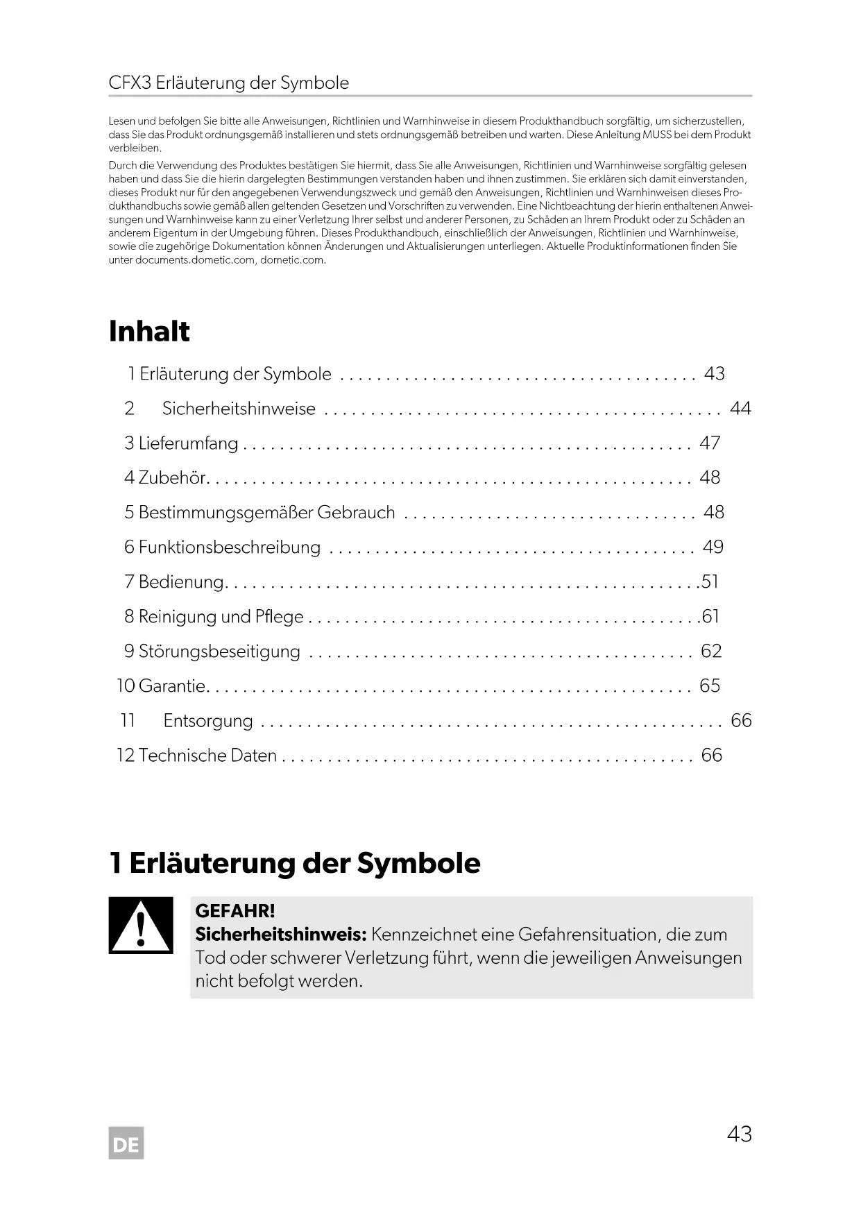 - Lesen und befolgen Sie bitte alle Anweisungen, Richtlinien und Warnhinweise in diesem Produkthandbuch sorgfältig, um sicherzustellen, dass Sie das Produkt ordnungsgemäß installieren und stets ordnungsgemäß betreiben und warten. Diese Anleitung MUSS bei dem Produkt verbleiben. Durch die Verwendung des Produktes bestätigen Sie hiermit, dass Sie alle Anweisungen, Richtlinien und Warnhinweise sorgfältig gelesen haben und dass Sie die hierin dargelegten Bestimmungen verstanden haben und ihnen zustimmen. Sie erklären sich damit einverstanden, dieses Produkt nur für den angegebenen Verwendungszweck und gemäß den Anweisungen, Richtlinien und Warnhinweisen dieses Pro- dukthandbuchs sowie gemäß allen geltenden Gesetzen und Vorschriften zu verwenden. Eine Nichtbeachtung der hierin enthaltenen Anwei- sungen und Warnhinweise kann zu einer Verletzung Ihrer selbst und anderer Personen, zu Schäden an Ihrem Produkt oder zu Schäden an anderem Eigentum in der Umgebung führen. Dieses Produkthandbuch, einschließlich der Anweisungen, Richtlinien und Warnhinweise, sowie die zugehörige Dokumentation können Änderungen und Aktualisierungen unterliegen. Aktuelle Produktinformationen finden Sie unter documents.dometic.com, dometic.com. Inhalt 1 Erläuterung der Symbole p. 43