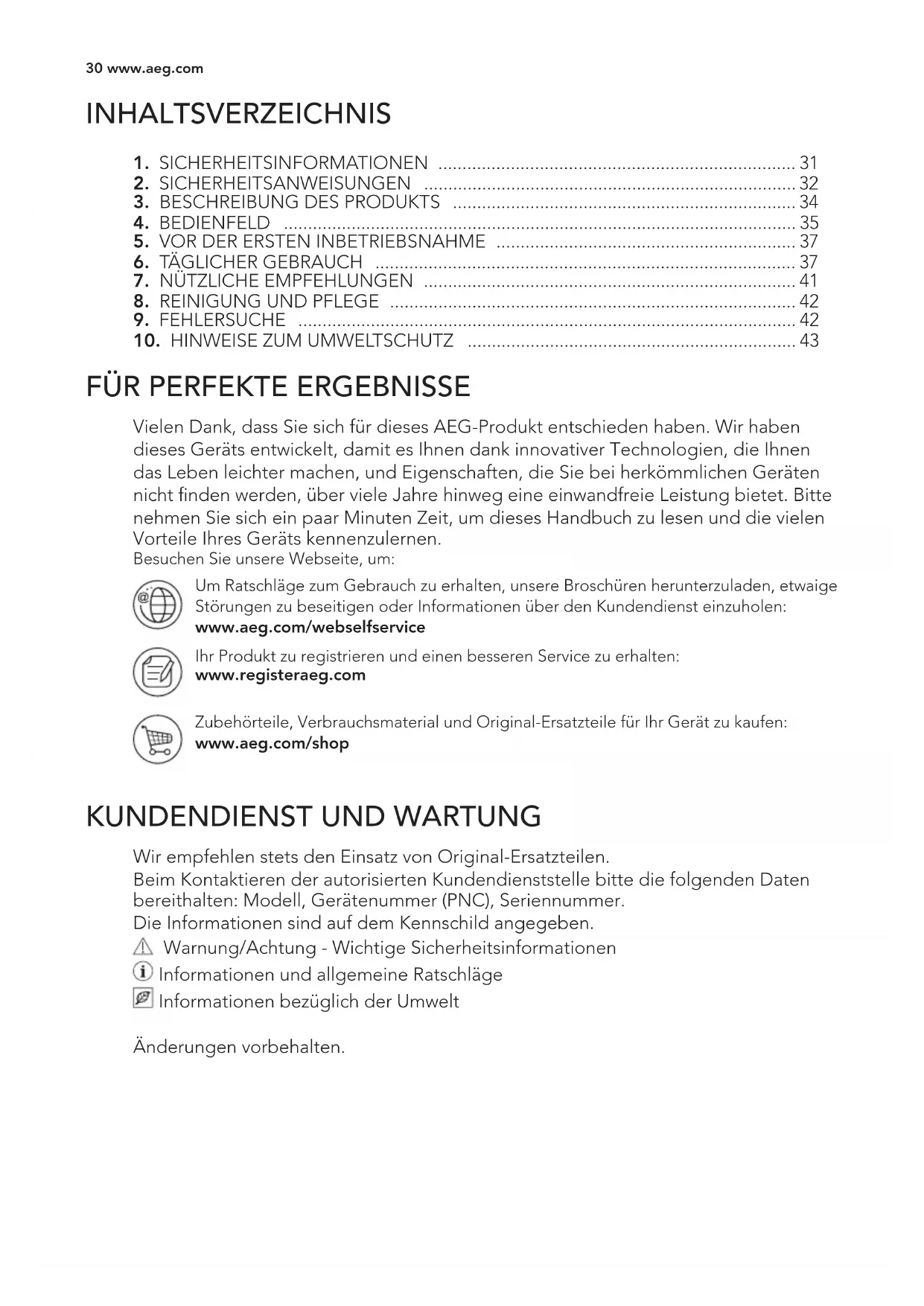 Um Ratschläge zum Gebrauch zu erhalten, unsere Broschüren herunterzuladen, etwaige Störungen zu beseitigen oder Informationen über den Kundendienst einzuholen: www.aeg.com/webselfservice Ihr Produkt zu registrieren und einen besseren Service zu erhalten: www.registeraeg.com Zubehörteile, Verbrauchsmaterial und Original-Ersatzteile für Ihr Gerät zu kaufen: www.aeg.com/shop