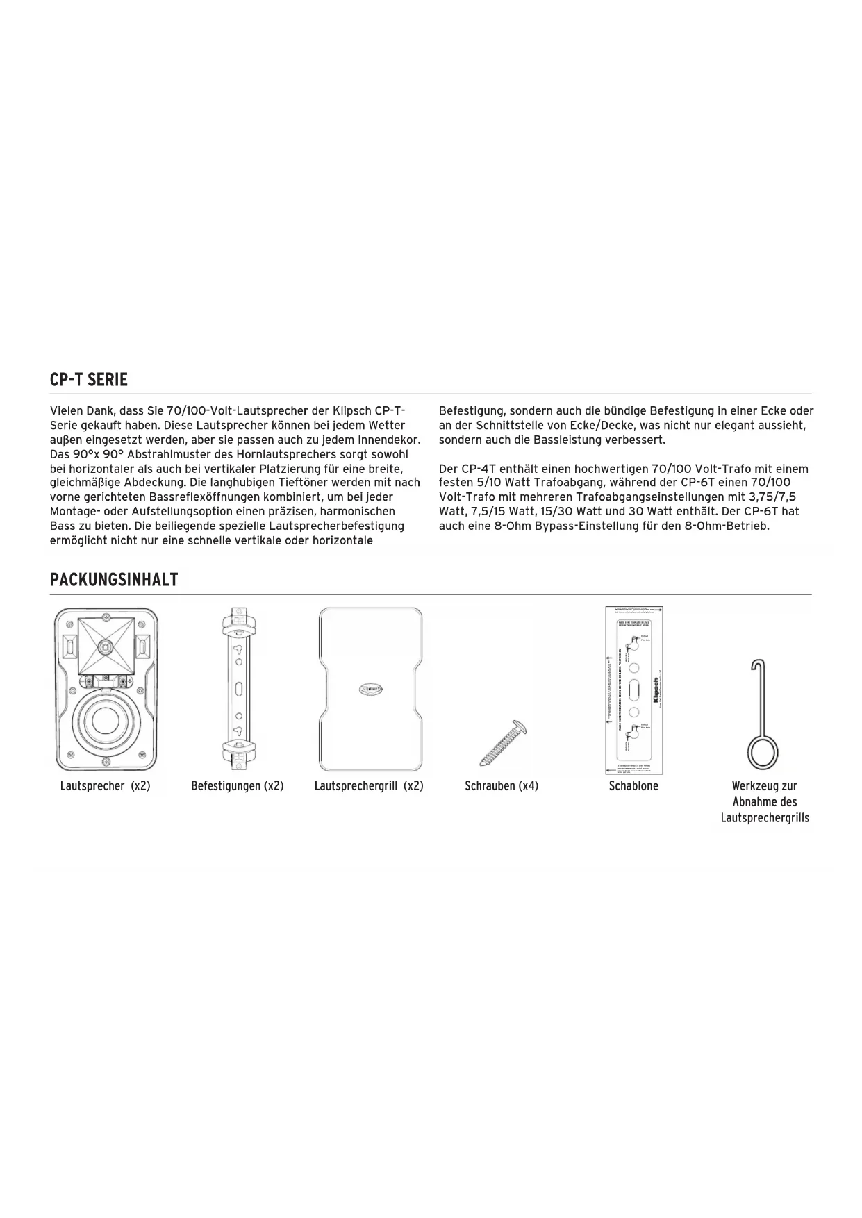 BEFORE DRILLING PILOT HOLES! To mount speaker HORIZONTALLY UP in ceiling/wall corner putting bracket on wall put THIS SIDE on wall flush against ceiling and mark horizontal pilot holes To mount speaker vertically in corner PUTTING BRACKET ON LEFT WALL against corner put THIS SIDE flush in corner on left wall and mark vertical pilot holesTo mount speaker vertically in corner PUTTING BRACKET ON RIGHT WALL against corner put THIS SIDE flush in corner on left wall and mark vertical pilot holes CP-T SERIE Vielen Dank, dass Sie 70/100-Volt-Lautsprecher der Klipsch CP-T- Serie gekauft haben. Diese Lautsprecher können bei jedem Wetter außen eingesetzt werden, aber sie passen auch zu jedem Innendekor. Das 90°x 90° Abstrahlmuster des Hornlautsprechers sorgt sowohl bei horizontaler als auch bei vertikaler Platzierung für eine breite, gleichmäßige Abdeckung. Die langhubigen Tieftöner werden mit nach vorne gerichteten Bassreflexöffnungen kombiniert, um bei jeder Montage- oder Aufstellungsoption einen präzisen, harmonischen Bass zu bieten. Die beiliegende spezielle Lautsprecherbefestigung ermöglicht nicht nur eine schnelle vertikale oder horizontale Befestigung, sondern auch die bündige Befestigung in einer Ecke oder an der Schnittstelle von Ecke/Decke, was nicht nur elegant aussieht, sondern auch die Bassleistung verbessert. Der CP-4T enthält einen hochwertigen 70/100 Volt-Trafo mit einem festen 5/10 Watt Trafoabgang, während der CP-6T einen 70/100 Volt-Trafo mit mehreren Trafoabgangseinstellungen mit 3,75/7,5 Watt, 7,5/15 Watt, 15/30 Watt und 30 Watt enthält. Der CP-6T hat auch eine 8-Ohm Bypass-Einstellung für den 8-Ohm-Betrieb. Lautsprecher (x2) Befestigungen (x2) Lautsprechergrill (x2) Schrauben (x4) Schablone Werkzeug zur Abnahme des LautsprechergrillsLAUTSPRECHERABMESSUNGEN MIT/OHNE BEILIEGENDE BEFESTIGUNGEN CP-4T CP-6T Für die Installation nötige Werkzeuge und Teile: a) Eine Wasserwaage b) Ein Bleistift c) Ein Kreuzschlitzschraubendreher (Nr. 2) oder eine Bohrmaschine AUF NIEDRIGSTER DREHMOMENTEINSTELLUNG mit einem Nr. 2 Kreuzschlitzeinsatz d) Zwei Nr. 10 oder Nr. 12 2,5-3-Zoll (6,35-7,62 cm) Flachkopfblechschrauben für jeden Lautsprecher zur Befestigung an einem Ständerprofil ODER Dübel mit einer Tragfähigkeit von mindestens 5 kg, wenn kein Ständerprofil verfügbar ist. e) (Bei Verwendung von Sicherheitskabeln) Eine 1 Zoll (2,54 cm) lange Viertelzoll-Schraube (Gewindesteigung 20/Zoll) für jeden Lautsprecher FÜR DIE INSTALLATION NÖTIGE WERKZEUGE UND TEILE 5.5” (14.0cm) 8.8” (22.4cm) 7.2” (18.3cm) 5.5” (14.0cm) 4.7” (11.9cm) 7.0” (17.8cm) 11.0” (27.9cm) 9.4” (23.9cm) 6.9” (17.5cm) 6.1” (15.5cm)1. SCHRITT ODER Wählen Sie die Montageorte und verlegen Sie die Lautsprecherkabel. Verwenden Sie die beiliegende Schablone und eine Wasserwaage, um die Löcher für die Befestigung zu markieren. Standardmäßige Wandmontage mit beiliegender Befestigung Wand-/Eckenmontage oder Decken-/Eckenmontage mit beiliegender Befestigung