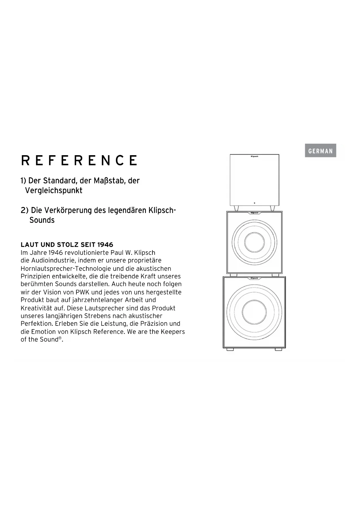 Im Jahre 1946 revolutionierte Paul W. Klipsch die Audioindustrie, indem er unsere proprietäre Hornlautsprecher-Technologie und die akustischen Prinzipien entwickelte, die die treibende Kraft unseres berühmten Sounds darstellen. Auch heute noch folgen wir der Vision von PWK und jedes von uns hergestellte Produkt baut auf jahrzehntelanger Arbeit und Kreativität auf. Diese Lautsprecher sind das Produkt unseres langjährigen Strebens nach akustischer Perfektion. Erleben Sie die Leistung, die Präzision und die Emotion von Klipsch Reference. We are the Keepers of the Sound
