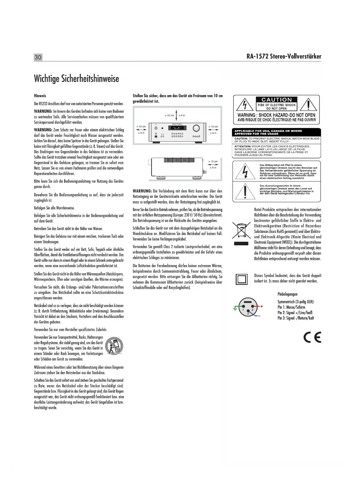 Poids (net) 13 kg, 28.66 lbs. Toutes les spécifications sont garanties exactes au moment de l’impression. Rotel se réserve le droit de les modifier sans préavis. Rotel et le logo Rotel HiFi sont des marques déposées de The Rotel Co, Ltd, Tokyo, Japon. Formats de lecture compatibles Apple USB (iPhone, iPod, iPad) Format Remarques Tout type de chier stocké sur le périphérique Apple. Tout type de chier stocké sur le périphérique Apple. Le téléphone peut le cas échéant ré-échantillonner le ux audio selon le chier. Certaines applications (Apps) peuvent être incompatibles si les formats de lecture ne sont pas supportés nativement par l’appareil source. APTX Bluetooth Format Remarques Tout type de chier supporté par le périphérique de lecture. Certaines applications (Apps) peuvent être incompatibles si les formats de lecture ne sont pas supportés nativement par l’appareil source. PC-USB Format Remarques Le format est déterminé par le Media Player/logiciel de lecture qui est utilisé. Tout type de format supporté par le logiciel de lecture Audio PCM: 44.1kHz, 48kHz, 88.2kHz, 96kHz, 176.4kHz, 192kHz 384kHz (16 bits, 24 bits et 32 bits) Audio DSD/DoP: 64 K, 128 K Coaxial/Optique Format Remarques SPDIF LPCM 44.1kHz, 48kHz, 88.2kHz, 96kHz, 176.4kHz, 192kHz 16 bits, 24 bits30 RA‑1572 Stereo‑Vollverstärker Hinweis Der RS232‑Anschluss darf nur von autorisierten Personen genutzt werden. WARNUNG: Im Innern des Gerätes befinden sich keine vom Bediener zu wartenden Teile. Alle Servicearbeiten müssen von qualifiziertem Servicepersonal durchgeführt werden. WARNUNG: Zum Schutz vor Feuer oder einem elektrischen Schlag darf das Gerät weder Feuchtigkeit noch Wasser ausgesetzt werden. Achten Sie darauf, dass keine Spritzer in das Gerät gelangen. Stellen Sie keine mit Flüssigkeit gefüllten Gegenstände (z. B. Vasen) auf das Gerät. Das Eindringen von Gegenständen in das Gehäuse ist zu vermeiden. Sollte das Gerät trotzdem einmal Feuchtigkeit ausgesetzt sein oder ein Gegenstand in das Gehäuse gelangen, so trennen Sie es sofort vom Netz. Lassen Sie es von einem Fachmann prüfen und die notwendigen Reparaturarbeiten durchführen. Bitte lesen Sie sich die Bedienungsanleitung vor Nutzung des Gerätes genau durch. Bewahren Sie die Bedienungsanleitung so auf, dass sie jederzeit zugänglich ist. Befolgen Sie alle Warnhinweise. Befolgen Sie alle Sicherheitshinweise in der Bedienungsanleitung und auf dem Gerät. Betreiben Sie das Gerät nicht in der Nähe von Wasser. Reinigen Sie das Gehäuse nur mit einem weichen, trockenen Tuch oder einem Staubsauger. Stellen Sie das Gerät weder auf ein Bett, Sofa, Teppich oder ähnliche Oberflächen, damit die Ventilationsöffnungen nicht verdeckt werden. Das Gerät sollte nur dann in einem Regal oder in einem Schrank untergebracht werden, wenn eine ausreichende Luftzirkulation gewährleistet ist. Stellen Sie das Gerät nicht in die Nähe von Wärmequellen (Heizkörpern, Wärmespeichern, Öfen oder sonstigen Quellen, die Wärme erzeugen). Versuchen Sie nicht, die Erdungs‑ und/oder Polarisationsvorschriften zu umgehen. Das Netzkabel sollte an eine Schutzkontaktsteckdose angeschlossen werden. Netzkabel sind so zu verlegen, dass sie nicht beschädigt werden können (z. B. durch Trittbelastung, Möbelstücke oder Erwärmung). Besondere Vorsicht ist dabei an den Steckern, Verteilern und den Anschlussstellen des Gerätes geboten. Verwenden Sie nur vom Hersteller spezifiziertes Zubehör. Verwenden Sie nur Transportmittel, Racks, Halterungen oder Regalsysteme, die stabil genug sind, um das Gerät zu tragen. Seien Sie vorsichtig, wenn Sie das Gerät in einem Ständer oder Rack bewegen, um Verletzungen oder Schäden am Gerät zu vermeiden. Während eines Gewitters oder bei Nichtbenutzung über einen längeren Zeitraum ziehen Sie den Netzstecker aus der Steckdose. Schalten Sie das Gerät sofort aus und ziehen Sie geschultes Fachpersonal zu Rate, wenn: das Netzkabel oder der Stecker beschädigt sind; Gegenstände bzw. Flüssigkeit in das Gerät gelangt sind; das Gerät Regen ausgesetzt war, das Gerät nicht ordnungsgemäß funktioniert bzw. eine deutliche Leistungsminderung aufweist; das Gerät hingefallen ist bzw. beschädigt wurde. Das Blitzsymbol mit Pfeil in einem gleichseitigen Dreieck macht den Benutzer auf das Vorhandensein gefährlicher Spannung im Gehäuse aufmerksam. Diese ist so groß, dass sie für eine Gefährdung von Personen durch einen elektrischen Schlag ausreicht.Das Ausrufungszeichen in einem gleichseitigen Dreieck weist den Leser auf wichtige Betriebs- und Wartungshinweise in der dem Gerät beiliegenden Literatur hin. Rotel‑Produkte entsprechen den internationalen Richtlinien über die Beschränkung der Verwendung bestimmter gefährlicher Stoffe in Elektro‑ und Elektronikgeräten (Restriction of Hazardous Substances (kurz RoHS genannt)) und über Elektro‑ und Elektronik‑Altgeräte (Waste Electrical and Electronic Equipment (WEEE)). Die durchgestrichene Mülltonne steht für deren Einhaltung und besagt, dass die Produkte ordnungsgemäß recycelt oder diesen Richtlinien entsprechend entsorgt werden müssen. Dieses Symbol bedeutet, dass das Gerät doppelt isoliert ist. Es muss daher nicht geerdet werden. Wichtige Sicherheitshinweise Stellen Sie sicher, dass um das Gerät ein Freiraum von 10cm gewährleistet ist. WARNUNG: Die Verbindung mit dem Netz kann nur über den Netzeingang an der Geräterückseite unterbrochen werden. Das Gerät muss so aufgestellt werden, dass der Netzeingang frei zugänglich ist. Bevor Sie das Gerät in Betrieb nehmen, prüfen Sie, ob die Betriebsspannung mit der örtlichen Netzspannung (Europa: 230 V/ 50 Hz) übereinstimmt. Die Betriebsspannung ist an der Rückseite des Gerätes angegeben. Schließen Sie das Gerät nur mit dem dazugehörigen Netzkabel an die Wandsteckdose an. Modifizieren Sie das Netzkabel auf keinen Fall. Verwenden Sie keine Verlängerungskabel. Verwenden Sie gemäß Class 2 isol