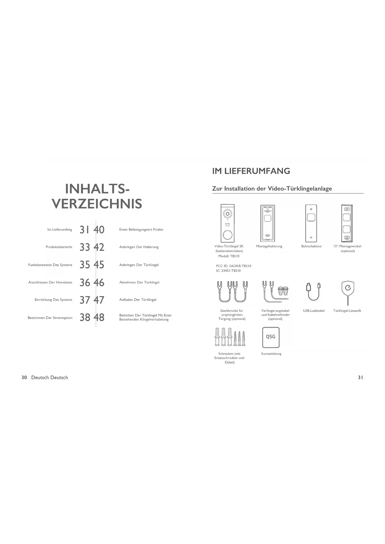 IM LIEFERUMFANG Zur Installation der Video-Türklingelanlage QSG Video-Türklingel 2K (batteriebetrieben)Modell: T8210Steckbrücke für ursprünglichen Türgong (optional)Schrauben (mit Ersatzschrauben und Dübel)KurzanleitungBohrschabloneTürklingel-Lösestift15°-Montagewinkel (optional)MontagehalterungVerlängerungskabel und Kabelverbinder (optional)FCC ID: 2AOKB-T8210IC: 23451-T8210USB-Ladekabel INHALTS- VERZEICHNIS Im Lieferumfang Einen Befestigungsort FindenProduktübersicht Anbringen Der HalterungFunktionsweise Des Systems Anbringen Der TürklingelAnschliessen Der Homebase Abnehmen Der TürklingelEinrichtung Des Systems Auaden Der TürklingelBestimmen Der Stromoption Betreiben Der Türklingel Mit Einer Bestehenden Klingelverkabelung32 Deutsch Deutsch