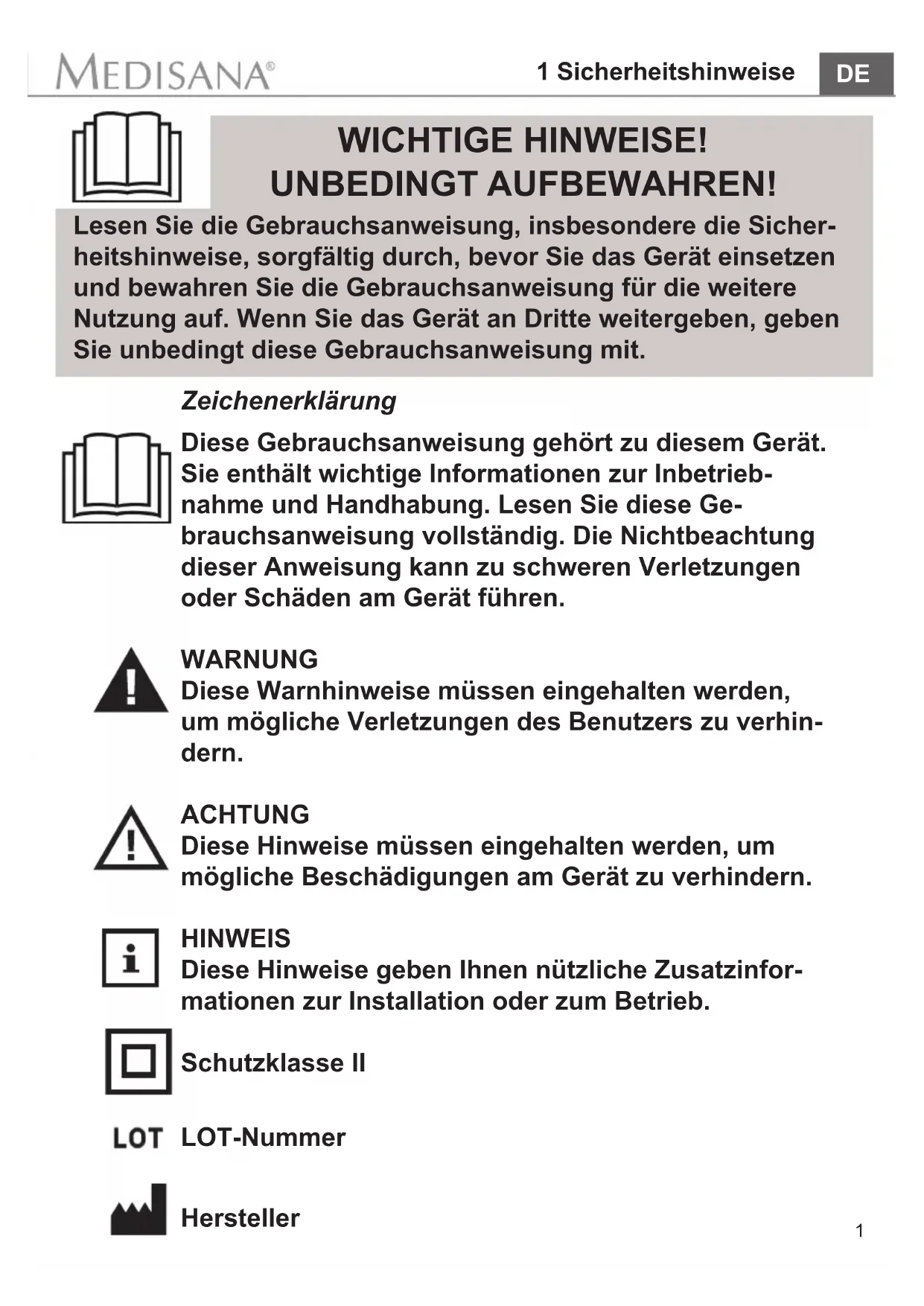 Zeichenerklärung Diese Gebrauchsanweisung gehört zu diesem Gerät. Sie enthält wichtige Informationen zur Inbetrieb- nahme und Handhabung. Lesen Sie diese Ge- brauchsanweisung vollständig. Die Nichtbeachtung dieser Anweisung kann zu schweren Verletzungen oder Schäden am Gerät führen. WARNUNG Diese Warnhinweise müssen eingehalten werden, um mögliche Verletzungen des Benutzers zu verhin- dern. ACHTUNG Diese Hinweise müssen eingehalten werden, um mögliche Beschädigungen am Gerät zu verhindern. HINWEIS Diese Hinweise geben Ihnen nützliche Zusatzinfor- mationen zur Installation oder zum Betrieb. Schutzklasse II LOT-Nummer Hersteller WICHTIGE HINWEISE! UNBEDINGT AUFBEWAHREN! Lesen Sie die Gebrauchsanweisung, insbesondere die Sicher- heitshinweise, sorgfältig durch, bevor Sie das Gerät einsetzen und bewahren Sie die Gebrauchsanweisung für die weitere Nutzung auf. Wenn Sie das Gerät an Dritte weitergeben, geben Sie unbedingt diese Gebrauchsanweisung mit.2 1 Sicherheitshinweise