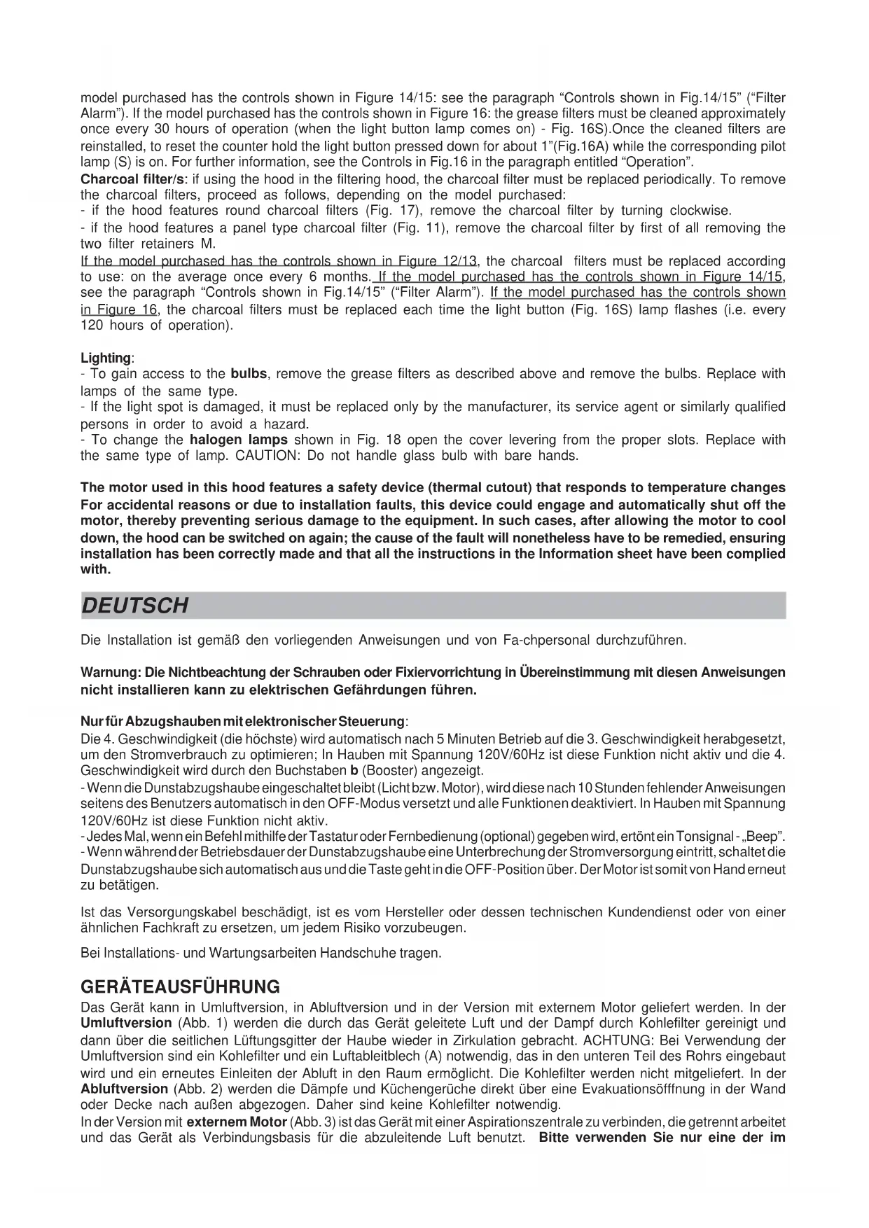 Vor den Montageoperationen muß/müssen zur leichteren Handhabung des Geräts die Fettfilter entfernt werden: Den Festhalter in der Nähe des Griffs nach innen drücken und den Filter nach unten ziehen (Abb. 4). Befestigung an der Wand (Abb. 5): Benutzen Sie die Bohrschablone, um die Dübel in der Wand anzubringen, wobei der Abstand zwischen der Haube und dem Kochfeld mindestens 65 cm betragen muß. Nun kann das Gerät mit den Schlüssellochöffnungen in der Geräterückwand in die Schrauben eingehängt werden (die Oeffnungen A benutzen; wenn in der Haube die Oeffnungen A und C vorhanden sind, dann muessen nur die Oeffnungen C benutzt werden). Zusätzlich wird das Gerät durch die Sicherungslöcher fest mit der Wand verschraubt (B). Um das Gerät nicht zu beschädigen, dürfen nur die vom Hersteller vorgesehenen Bohrungen benutzt werden. Befestigung der Teleskoprohre: Mindestanforderungen für die Montage: – Stromversorgungsanschluß innerhalb der Außenabmessungen des Teleksoprohres vornehmen. – Wird ein Gerät in Abluftversion oder in der Version mit externem Motor installiert, ist eine Luftaustrittsöffnung vorzusehen. Positionieren Sie die Halterung (W) 50 mm von der Decke entfernt, vertikal oberhalb der Haube unter Zuhilfenahme der Schlitze in der Mitte der Halterung (Abb. 6). Markieren Sie mit einem Filzstift die beiden Bohrlöcher an der Wand. Führen Sie die Bohrungen aus und stecken Sie die mitgelieferten Dübel in die Bohrlöcher. Befestigen Sie die Halterung mit den beiden mitgelieferten Schrauben. Abluftversion und Version mit externem Motor: Das Luftabführungsrohr an die Austrittsöffnung der Haube anschließen; dazu einen Schlauch verwenden und ihn an der Luftaustrittsöffnung der Haube mit einer Metallschelle befestigen (Schlauch und Schelle werden nicht mitgeliefert). Nur bei der Version mit externem Motor (Abb. 7) wird die Haube über die entsprechenden Klemmleisten elektrisch mit der externen Zentrale verbunden: Entfernen Sie den Kabelfeststeller A und den Deckel B vom Anschlußkasten. Befestigen Sie das Verbindungskabel der Zentrale an der Klemmleiste C. Den Kabelfeststeller A und den Deckel B des Schaltkastens wieder montieren. Das andere Kabelende ist an der Klemmleiste der externen Zentrale zu befestigen. Schließen Sie die Haube mittels Stromkabel an die Stromversorgung an. Legen Sie die beiden vormontierten Rohre auf den vorderen Teil der Haube. Heben Sie das obere Rohr bis zur Decke an und bestigen Sie es mittels 2 Schrauben an der Halterung (Abb. 8). Umluftversion: Schließen Sie die Haube mittels Stromkabel an die Stromversorgung an. Befestigen Sie das Ableitblech an dem unteren Rohr wie in Abbildung 9 gezeigt. Benutzen Sie hierzu 2 Schrauben. Legen Sie die beiden vormontierten Rohre auf den vorderen Teil der Haube. Heben Sie das obere Rohr bis zur Decke an und bestigen Sie es mittels 2 Schrauben an der Halterung (Abb. 8). Beachten Sie, dass bei der Umluftversion der Gebrauch von Kohlefiltern erforderlich ist; uberprüfen Sie, ob die Filter bereits installiert sind; falls erforderlich, montieren Sie diese wie nachstehend beschrieben ist, entsprechend dem von Ihnen erworbenen Modell: - wenn die Haube mit runden Kohlefiltern ausgestattet ist (Abb. 10), hängen Sie den Kohlefilter durch Drehen desselben im Gegenuhrzeigersinn ein. - wenn die Haube mit einem Kohlefilterpaneel ausgestattet ist (Abb. 11), entfernen Sie die beiden Metallfilterhalter (M) und positionieren Sie den Kohlenfilter im Innern des Fettfilter; setzen Sie anschließend die beiden Festhalter wieder ein, um den Kohlefilter zu arretieren. FUNKTIONSWEISE Je nach Version ist das Gerät mit folgenden Bedienung ausgestattet: Bedienung gemäß Abb. 12: Taste A: Beleuchtung. Taste B: Ein- (erste Betriebstufe), Aus- Schalter. Taste C: zweite Betriebstufe. Taste D: dritte Betriebstufe. E: Motorkontrolleuchte. EINIGE MODELLE SIND OHNE DAS MOTORKONTROLLEUCHTE (E). Bedienung gemäß Abb. 13: Taste A: Schalter für die Beleuchtung; Stellung 0: Beleuchtung aus; Stellung 1: Beleuchtung ein. Taste B: Motorschalter; Stellung 0: Motor aus; Stellung 1-2-3: erste, zweite und dritte Schaltstufe. C: Led Motorbetrieb. Bedienung gemäß Abb. 14: Taste A: LICHT einschalten. Taste B: LICHT ausschalten. Taste C: Drosselt die Geschwindigkeit auf ein Minimum. Bei 2 Sek. langem Drücken wird der Motor abgeschaltet. Taste D: Betätigung des Motors (mit der zuletzt verwendeten Geschwindigkeit) und Erhöhen der Geschwindigkeit bis zum Maximum. Taste E: RESET FILTERALARM / TIMER: Wird diese Taste während der Anzeige des Filteralarms (bei abgeschaltetem Motor) gedrückt, wird der Stundenzähler nullgestellt. Wird die Taste hingegen bei laufendem Motor gedrückt, wird der TIMER aktiviert, der die Abzughaube nach 5 Minuten automatisch abschaltet. L1) Die vier GRÜNEN LEDs zeigen die momentane Geschwindigkeit an. L2) Wenn die LED rot ist (bei abgeschaltetem Motor), zeigt sie FILTERALARM an. Wenn die LED grün ist und blinkt, zeigt sie an, dass der TIMER über die Taste E aktiviert worden ist. FILTERALARM: Nach einer Betriebszeit von 30h leuchtet LED L2 stets ROT, um anzuzeigen, dass die Fettfilter gereinigt werden müssen. Nach einer Betriebszeit von 120h blinkt LED L2 ROT, um anzuzeigen, dass die Fettfilter gereinigt und die Kohlenfilter ausgetauscht werden müssen. Nach der Reinigung den Fettfiltern (und/oder dem Austausch der Kohlenfilter)ist zur Rückstellung des Stundenzählers die Taste E (RESET) während der Anzeige des Filteralarms zu drücken. Bedienung gemäß Abb. 15: Taste A: Beleuchtung ausschalten; Taste B: Beleuchtung einschalten; Taste C: Vermindert die Motorgeschwindigkeit bis zur Mindestgeschwindigkeit. Bei Betätigung für 2" schaltet sich der Motor aus. Durch Betätigung für 2" wird bei ausgelöstem Filteralarm der Stundenzähler auf null gestellt. Taste D: Schaltet den Motor ein und erhöht die Geschwindigkeit des Motors bis zur Höchstgeschwindigkeit. Taste E: Aktiviert/deaktiviert den Sensor (AUTOMATISCHER