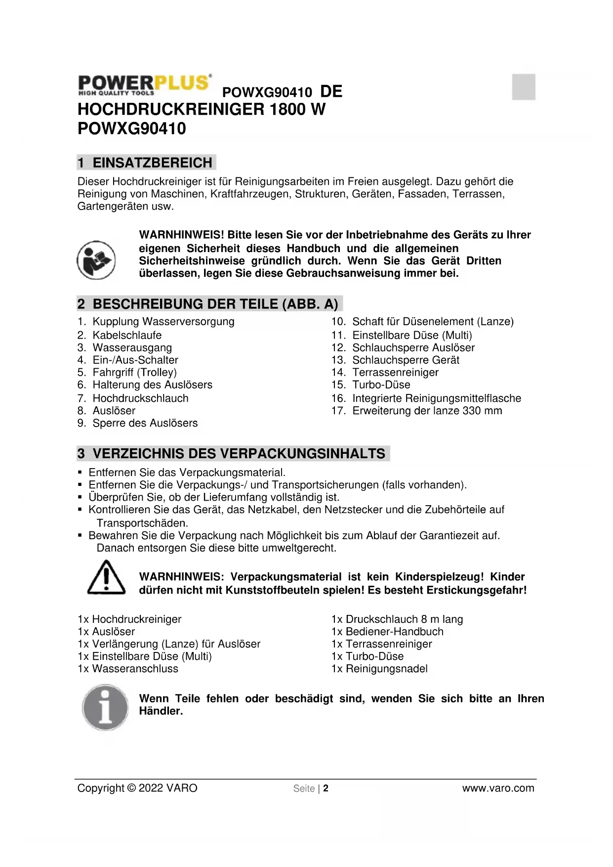 - Bewahren Sie die Verpackung nach Möglichkeit bis zum Ablauf der Garantiezeit auf. Danach entsorgen Sie diese bitte umweltgerecht. WARNHINWEIS: Verpackungsmaterial ist kein Kinderspielzeug! Kinder dürfen nicht mit Kunststoffbeuteln spielen! Es besteht Erstickungsgefahr! 1x Hochdruckreiniger 1x Auslöser 1x Verlängerung (Lanze) für Auslöser 1x Einstellbare Düse (Multi) 1x Wasseranschluss 1x Druckschlauch 8 m lang 1x Bediener-Handbuch 1x Terrassenreiniger 1x Turbo-Düse 1x Reinigungsnadel Wenn Teile fehlen oder beschädigt sind, wenden Sie sich bitte an Ihren Händler.POWXG90410 DE Copyright © 2022 VARO Seite | 3 www.varo.com