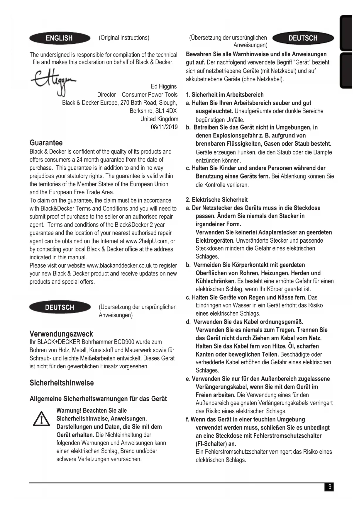 EU-Konformitätserklärung MASCHINENRICHTLINIE BCD900 Bohrhammer Black & Decker erklärt, dass die in den technischen Daten beschriebenen Geräte übereinstimmen mit: EN60745-1:2009+A11:2010, EN60745-2-6:2010. Diese Produkte entsprechen außerdem den Richtlinien 2006/42/EC, 2014/30/EU und 2011/65/EU. Weitere Informa- tionen erhalten Sie von Black & Decker unter der folgenden Adresse. Diese bendet sich auch auf der Rückseite dieser Anleitung. Der Unterzeichnete ist verantwortlich für die Zusammen- stellung der technischen Daten und gibt diese Erklärung im Namen von Black & Decker ab. Ed Higgins Director – Consumer Power Tools Black & Decker Europe, 270 Bath Road, Slough, Berkshire, SL1 4DX Vereinigtes Königreich 08/11/2019 Garantie Black & Decker vertraut auf die Qualität der eigenen Geräte und bietet dem Käufer eine außergewöhnliche Garantie von 24 Monaten ab Kaufdatum. Diese Garantie versteht sich unbeschadet der gesetzlichen Gewährleistungsansprüche und schränkt diese keinesfalls ein. Diese Garantie gilt innerhalb der Staatsgebiete der Mitgliedstaaten der Europäischen Union und der Europäischen Freihandelszone. Zur Inanspruchnahme dieser Garantie muss sie den allgemeinen Geschäftsbedingungen von Black + Decker entsprechen und dem Verkäufer bzw. der Vertragswerkstatt ist ein Kaufnachweis vorzulegen. Die Bedingungen für die 2-jährige Garantie von Black&Decker und den Standort Ihrer nächstgelegenen Vertragswerkstatt nden Sie im Internet unter www.2helpU.com oder indem Sie sich an die lokale Black&Decker-Niederlassung wenden, deren Adresse Sie in dieser Anleitung nden. Ihr neues Black & Decker Produkt können Sie auf unserer Website unter www.blackanddecker.de registrieren. Dort erhalten Sie auch Informationen über neue Produkte und Sonderangebote. Utilisation prévue Votre marteau perforateur rotatif BLACK+DECKER BCD900 a été conçu pour percer le bois, le métal, les plastiques et les matériaux de maçonnerie ainsi que pour les applications de vissage et de burinage de petite ampleur. Cet outil est destiné à un usage grand public uniquement. Consignes de sécurité Avertissements de sécurité générale propres aux outils électriques