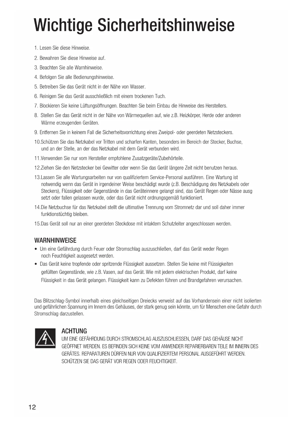 - Das Gerät keine tropfende oder spritzende Flüssigkeit aussetzen. Stellen Sie keine mit Flüssigkeiten gefüllten Gegenstände, wie z.B. Vasen, auf das Gerät. Wie mit jedem elektrischen Produkt, darf keine Flüssigkeit in das Gerät gelangen. Flüssigkeit kann zu Defekten führen und Brandgefahren verursachen. Das Blitzschlag-Symbol innerhalb eines gleichseitigen Dreiecks verweist auf das Vorhandensein einer nicht isolierten und gefährlichen Spannung im Innern des Gehäuses, der stark genug sein könnte, um für Menschen eine Gefahr durch Stromschlag darzustellen. ACHTUNG UM EINE GEFÄHRDUNG DURCH STROMSCHLAG AUSZUSCHLIESSEN, DARF DAS GEHÄUSE NICHT GEÖFFNET WERDEN. ES BEFINDEN SICH KEINE VOM ANWENDER REPARIERBAREN TEILE IM INNERN DES GERÄTES. REPARATUREN DÜRFEN NUR VON QUALIFIZIERTEM PERSONAL AUSGEFÜHRT WERDEN. SCHÜTZEN SIE DAS GERÄT VOR REGEN ODER FEUCHTIGKEIT.