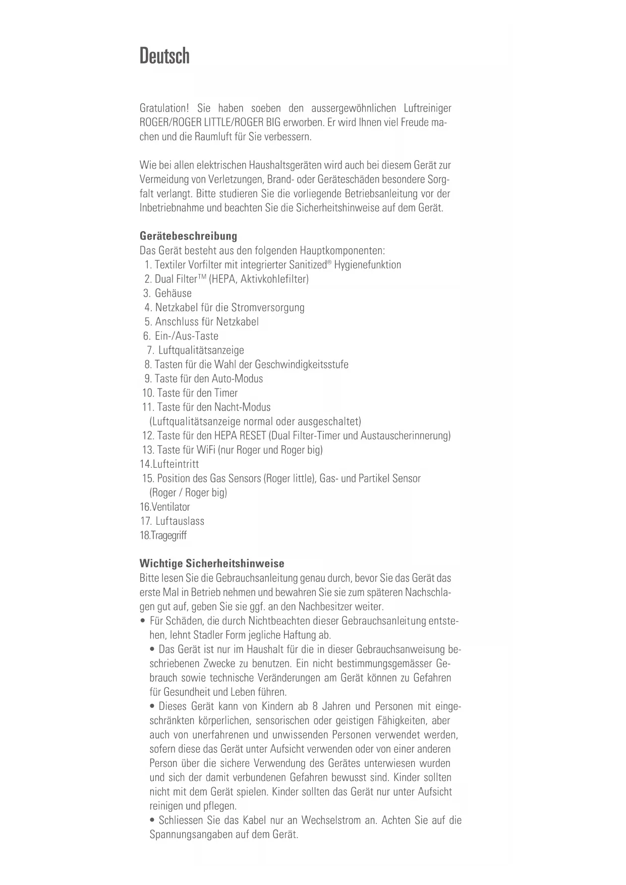 (Clean Air Delivery Rate according to AHAM) Dimensions 420 x 520 x 340 mm (width x height x depth) Weight 10.5 kg Sound level 28–58 dB(A) Complies with EU regulations CE / WEEE / RoHS / EAC This device contains a radio module from Stadler Form Aktiengesellschaft type: WBR3. It operates in the ISM band in the range 2.412 – 2.484 GHz with a maximum power of 56.2 mW and 89.1 mW EIRP. All rights for any technical modifications are reservedGratulation! Sie haben soeben den aussergewöhnlichen Luftreiniger ROGER/ROGER LITTLE/ROGER BIG erworben. Er wird Ihnen viel Freude ma- chen und die Raumluft für Sie verbessern. Wie bei allen elektrischen Haushaltsgeräten wird auch bei diesem Gerät zur Vermeidung von Verletzungen, Brand- oder Geräteschäden besondere Sorg- falt verlangt. Bitte studieren Sie die vorliegende Betriebsanleitung vor der Inbetriebnahme und beachten Sie die Sicherheitshinweise auf dem Gerät. Gerätebeschreibung Das Gerät besteht aus den folgenden Hauptkomponenten: