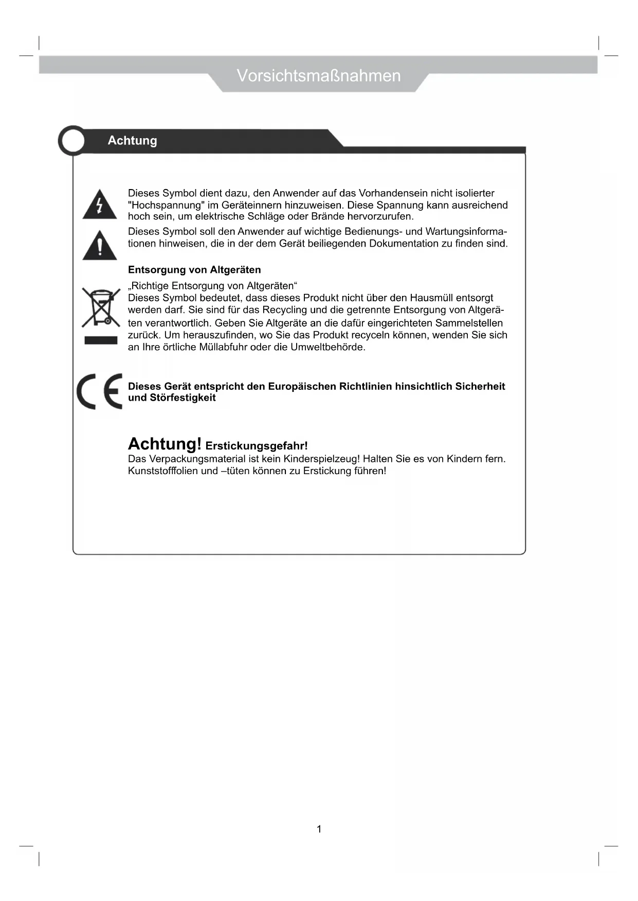 - Reinigen Sie das Produkt niemals mit Politur, Wachs, Waschbenzin, Ferdinand, Schmieröl, Lösungs- mittel oder andere Chemikalien. Ebenso dürfen Sie das Gerät nicht mit einem feuchten Tuch reinigen. Vorsichtsmaßnahmen Vorsichtsmaßnahmen Ziel dieser Sicherheitshinweise ist die Si- cherheit des Benutzers und das Vermeiden von Sachschäden. Lesen Sie sich alle Sicherheitshinweise durch, und befolgen Sie sie.