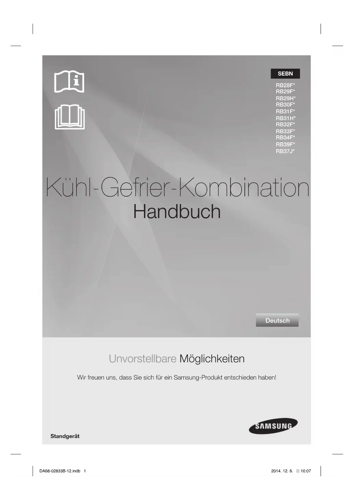 - Bewahren Sie die Lebensmittel stets zugedeckt/verpackt oder in luftundurchlässigen Behältern auf. DA68-02833B-12.indb 31DA68-02833B-12.indb 31 2014. 12. 6. 10:072014. 12. 6. 10:07Schaltplan DA68-02833B-12.indb 32DA68-02833B-12.indb 32 2014. 12. 6. 10:072014. 12. 6. 10:07DA68-02833B-12.indb 33DA68-02833B-12.indb 33 2014. 12. 6. 10:072014. 12. 6. 10:073050 2M A+++ DA68-02833B-12.indb 34DA68-02833B-12.indb 34 2014. 12. 6. 10:072014. 12. 6. 10:073050 2M A++/A+ DA68-02833B-12.indb 35DA68-02833B-12.indb 35 2014. 12. 6. 10:072014. 12. 6. 10:07Raumtemperaturbereich Das Kühl/Gefriergerät ist für einen Betrieb bei Raumtemperaturen entsprechend der auf dem Typenschild angegebenen Klimaklasse ausgelegt. Die Temperaturen im Geräteinnern werden von verschiedenen Faktoren beeinfl usst, wie z.B. dem Aufstellort, der Raumtemperatur und wie häufi g die Gerätetür geöffnet wird. Stellen Sie die Temperatur wie angegeben ein, um so diesen Faktoren Rechnung zu tragen Klimaklasse Symbol Raumtemperaturbereich (°C) IEC 62552 (ISO 15502) Kalt gemäßigt (subnormal) SN +10 bis +32 Warm gemäßigt (Normal) N +16 bis +32 Suptropisch ST +16 bis +38 Tropisch T +16 bis +43 Kontakt zu Samsung Falls Sie Fragen oder Anregungen zu Samsung-Produkten haben, freuen wir uns über Ihre Kontaktaufnahme mit der Samsung-Kundenbetreuung Samsung Electronics GmbH, Am Kronberger Hang 6, 65824 Schwalbach/Taunus 0180 6 SAMSUNG bzw. 0180 6 7267864* (*0,20 €/Anruf aus dem dt. Festnetz, aus dem Mobilfunk max. 0,60 €/Anruf) www.samsung.com/de/support Deutsch Korrekte Entsorgung von Altgeräten (Elektroschrott) (Gilt für Länder mit Abfalltrennsystemen) Die Kennzeichnung auf dem Produkt, Zubehörteilen bzw. auf der dazugehörigen Dokumentation gibt an, dass das Produkt und Zubehörteile (z. B. Ladegerät, Kopfhörer, USB- Kabel) nach ihrer Lebensdauer nicht zusammen mit dem normalen Haushaltsmüll entsorgt werden dürfen. Entsorgen Sie dieses Gerät und Zubehörteile bitte getrennt von anderen Abfällen, um der Umwelt bzw. der menschlichen Gesundheit nicht durch unkontrollierte Müllbeseitigung zu schaden. Helfen Sie mit, das Altgerät und Zubehörteile fachgerecht zu entsorgen, um die nachhaltige Wiederverwertung von stoffl ichen Ressourcen zu fördern. Private Nutzer wenden sich an den Händler, bei dem das Produkt gekauft wurde, oder kontaktieren die zuständigen Behörden, um in Erfahrung zu bringen, wo Sie das Altgerät bzw. Zubehörteile für eine umweltfreundliche Entsorgung abgeben können. Gewerbliche Nutzer wenden sich an ihren Lieferanten und gehen nach den Bedingungen des Verkaufsvertrags vor. Dieses Produkt und elektronische Zubehörteile dürfen nicht zusammen mit anderem Gewerbemüll entsorgt werden. DA68-02833B-12.indb 36DA68-02833B-12.indb 36 2014. 12. 6. 10:072014. 12. 6. 10:07Nederlands Koelkast handleiding bedenk eens wat de mogelijkheden zijn Hartelijk dank voor de aanschaf van dit Samsung-product. Vrijstaand apparaat SEBN RB28F* RB29F* RB29H* RB30F* RB31F* RB31H* RB32F* RB33F* RB34F* RB39F* RB37J* DA68-02833B-12.indb 1DA68-02833B-12.indb 1 2014. 12. 6. 10:072014. 12. 6. 10:0702_ veiligheidsinformatie VEILIGHEIDSINFORMATIE