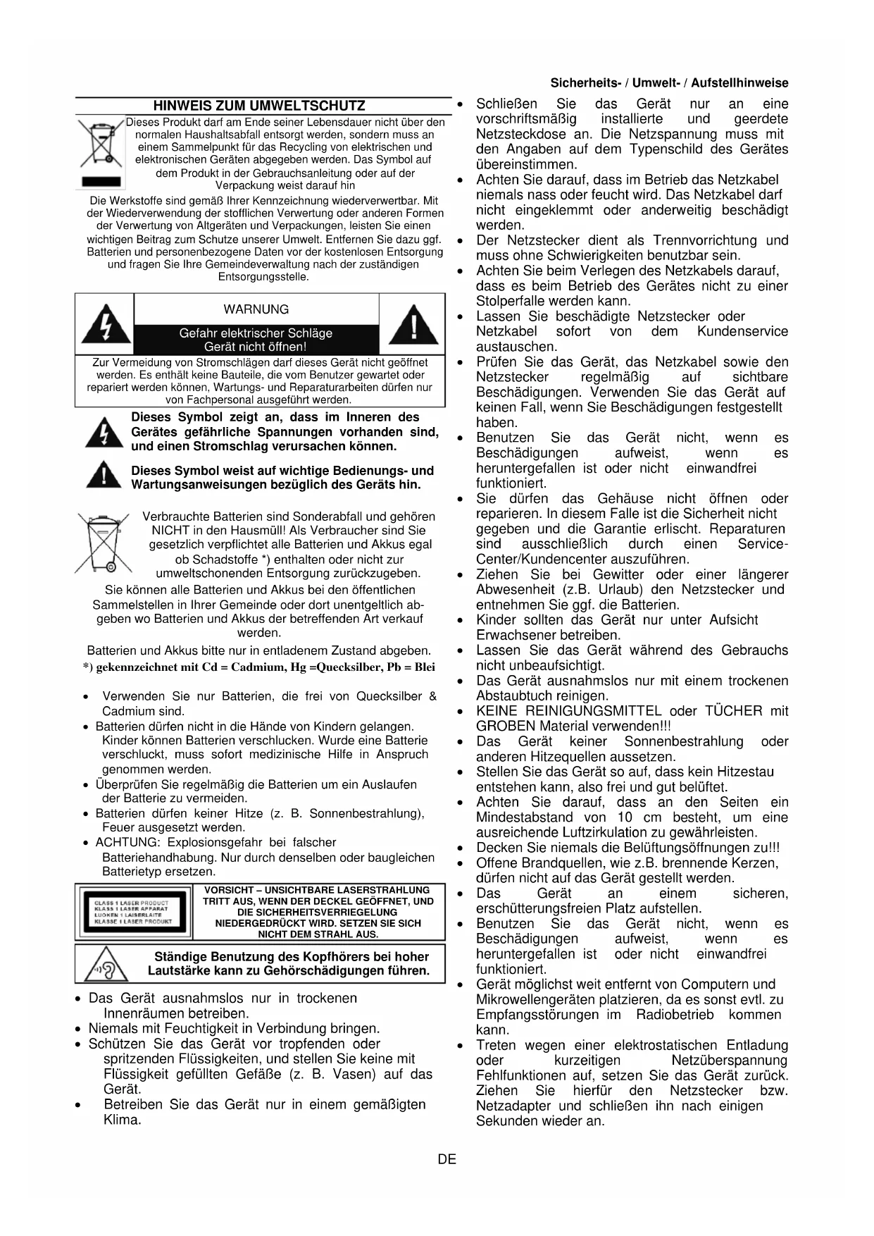 Ständige Benutzung des Kopfhörers bei hoher Lautstärke kann zu Gehörschädigungen führen.