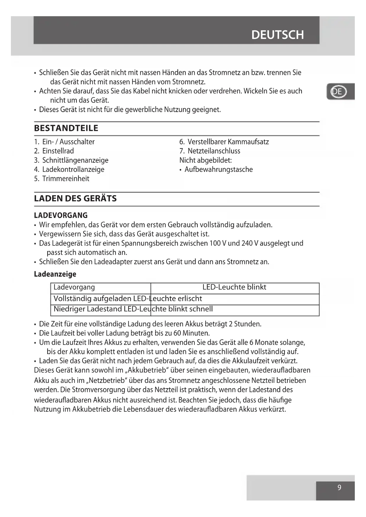 - Bitte beachten Sie, dass der Trimmer selbst nicht abwaschbar ist und halten Sie ihn von Wasser fern.