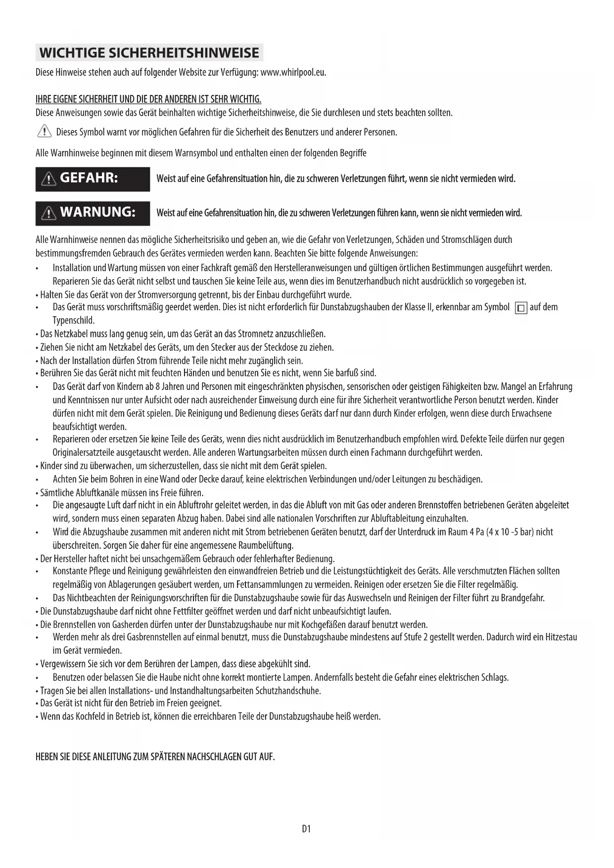 DWICHTIGE SICHERHEITSHINWEISE Diese Hinweise stehen auch auf folgender Website zur Verfügung: www.whirlpool.eu. IHRE EIGENE SICHERHEIT UND DIE DER ANDEREN IST SEHR WICHTIG. Diese Anweisungen sowie das Gerät beinhalten wichtige Sicherheitshinweise, die Sie durchlesen und stets beachten sollten. Dieses Symbol warnt vor möglichen Gefahren für die Sicherheit des Benutzers und anderer Personen. Alle Warnhinweise beginnen mit diesem Warnsymbol und enthalten einen der folgenden Begrie Weist auf eine Gefahrensituation hin, die zu schweren Verletzungen führt, wenn sie nicht vermieden wird. Weist auf eine Gefahrensituation hin, die zu schweren Verletzungen führen kann, wenn sie nicht vermieden wird. Alle Warnhinweise nennen das mögliche Sicherheitsrisiko und geben an, wie die Gefahr von Verletzungen, Schäden und Stromschlägen durch bestimmungsfremden Gebrauch des Gerätes vermieden werden kann. Beachten Sie bitte folgende Anweisungen: