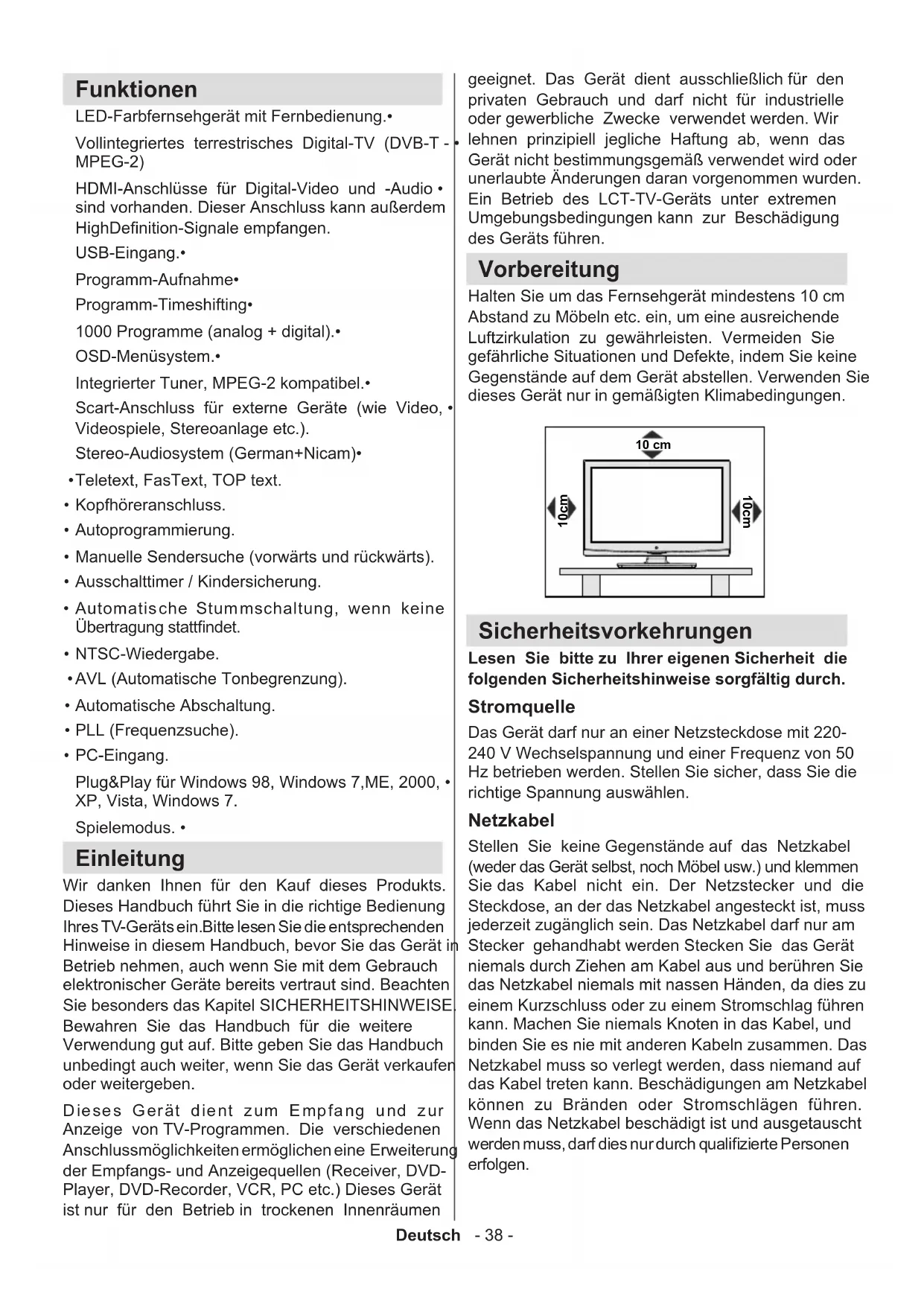 - Technische Daten Deutsch - 38 - Funktionen LED-Farbfernsehgerät mit Fernbedienung.• Vollintegriertes terrestrisches Digital-TV (DVB-T - • MPEG-2) HDMI-Anschlüsse für Digital-Video und -Audio • sind vorhanden. Dieser Anschluss kann außerdem HighDenition-Signale empfangen. USB-Eingang.• Programm-Aufnahme• Programm-Timeshifting• 1000 Programme (analog + digital).• OSD-Menüsystem.• Integrierter Tuner, MPEG-2 kompatibel.• Scart-Anschluss für externe Geräte (wie Video, • Videospiele, Stereoanlage etc.). Stereo-Audiosystem (German+Nicam)• Teletext, FasText, TOP text.• Kopfhöreranschluss.• Autoprogrammierung.• Manuelle Sendersuche (vorwärts und rückwärts).• Ausschalttimer / Kindersicherung.• Automatische Stummschaltung, wenn keine • Übertragung stattndet. NTSC-Wiedergabe. • AVL (Automatische Tonbegrenzung).• Automatische Abschaltung.• PLL (Frequenzsuche).• PC-Eingang. • Plug&Play für Windows 98, Windows 7,ME, 2000, • XP, Vista, Windows 7. Spielemodus. • Einleitung Wir danken Ihnen für den Kauf dieses Produkts. Dieses Handbuch führt Sie in die richtige Bedienung Ihres TV-Geräts ein.Bitte lesen Sie die entsprechenden Hinweise in diesem Handbuch, bevor Sie das Gerät in Betrieb nehmen, auch wenn Sie mit dem Gebrauch elektronischer Geräte bereits vertraut sind. Beachten Sie besonders das Kapitel SICHERHEITSHINWEISE. Bewahren Sie das Handbuch für die weitere Verwendung gut auf. Bitte geben Sie das Handbuch unbedingt auch weiter, wenn Sie das Gerät verkaufen oder weitergeben. Dieses Gerät dient zum Empfang und zur Anzeige von TV-Programmen. Die verschiedenen Anschlussmöglichkeiten ermöglichen eine Erweiterung der Empfangs- und Anzeigequellen (Receiver, DVD- Player, DVD-Recorder, VCR, PC etc.) Dieses Gerät ist nur für den Betrieb in trockenen Innenräumen geeignet. Das Gerät dient ausschließlich für den privaten Gebrauch und darf nicht für industrielle oder gewerbliche Zwecke verwendet werden. Wir lehnen prinzipiell jegliche Haftung ab, wenn das Gerät nicht bestimmungsgemäß verwendet wird oder unerlaubte Änderungen daran vorgenommen wurden. Ein Betrieb des LCT-TV-Geräts unter extremen Umgebungsbedingungen kann zur Beschädigung des Geräts führen. Vorbereitung Halten Sie um das Fernsehgerät mindestens 10 cm Abstand zu Möbeln etc. ein, um eine ausreichende Luftzirkulation zu gewährleisten. Vermeiden Sie gefährliche Situationen und Defekte, indem Sie keine Gegenstände auf dem Gerät abstellen. Verwenden Sie dieses Gerät nur in gemäßigten Klimabedingungen. 10 cm 10 cm 10 cm Sicherheitsvorkehrungen Lesen Sie bitte zu Ihrer eigenen Sicherheit die folgenden Sicherheitshinweise sorgfältig durch. Stromquelle Das Gerät darf nur an einer Netzsteckdose mit 220- 240 V Wechselspannung und einer Frequenz von 50 Hz betrieben werden. Stellen Sie sicher, dass Sie die richtige Spannung auswählen. Netzkabel Stellen Sie keine Gegenstände auf das Netzkabel (weder das Gerät selbst, noch Möbel usw.) und klemmen Sie das Kabel nicht ein. Der Netzstecker und die Steckdose, an der das Netzkabel angesteckt ist, muss jederzeit zugänglich sein. Das Netzkabel darf nur am Stecker gehandhabt werden Stecken Sie das Gerät niemals durch Ziehen am Kabel aus und berühren Sie das Netzkabel niemals mit nassen Händen, da dies zu einem Kurzschluss oder zu einem Stromschlag führen kann. Machen Sie niemals Knoten in das Kabel, und binden Sie es nie mit anderen Kabeln zusammen. Das Netzkabel muss so verlegt werden, dass niemand auf das Kabel treten kann. Beschädigungen am Netzkabel können zu Bränden oder Stromschlägen führen. Wenn das Netzkabel beschädigt ist und ausgetauscht werden muss, darf dies nur durch qualizierte Personen erfolgen.Deutsch - 39 - Feuchtigkeit und Wasser Verwenden Sie dieses Gerät nicht in feuchter oder dunstiger Umgebung (vermeiden Sie das Badezimmer, die Spüle in der Küche oder die Umgebung der Waschmaschine). Achten Sie darauf, dass dieses Gerät niemals Regen oder Wasser ausgesetzt ist, und stellen Sie keine mit Flüssigkeit gefüllten Gefäße, wie zum Beispiel Blumenvasen, auf dem Gerät ab. Meiden Sie Tropf- und Spritzwasser. Sollte ein harter Gegenstand auf das Gerät fallen oder Flüssigkeit in das Gerät eindringen, müssen Sie das Gerät ausstecken und durch eine qualizierte Fachkraft überprüfen lassen, bevor es wieder betrieben werden kann. Reinigung Ziehen Sie vor der Reinigung des Geräts den Netzstecker aus der Steckdose. Verwenden Sie keine üssigen oder Sprühreiniger. Benutzen Sie ein weiches und trockenes Tuch. Belüftung Die Schlitze und Öffnungen des Empfängers dienen der Belüftung und sollen einen reibungslosen Betrieb gewährleisten. Um eine Überhitzung zu vermeiden, sollten diese Öffnungen niemals blockiert oder abgedeckt werden. Hitze und offenes Feuer Das Gerät darf weder offenem Feuer noch anderen Quellen intensiver Hitzestrahlung, wie elektrischen Radiatoren, ausgesetzt werden. Stellen Sie sicher, dass keine offenen Flammen, wie z. B. brennende Kerzen, auf das Gerät gestellt werden. Batterien dürfen niemals zu großer Hitze wie direkter Sonneneinstrahlung, Feuer od. dgl. ausgesetzt werden. Gewitter Trennen Sie das Netzkabel von der Steckdose, falls es Sturm oder Gewitter gibt oder das Gerät längere Zeit nicht benutzt wird (z. B., wenn Sie in den Urlaub fahren). Ersatzteile Falls Ihr Gerät ein Ersatzteil benötigt, stellen Sie sicher, dass die Person, die die Reparatur vornimmt, Teile verwendet, die vom Hersteller spezifiziert wurden oder die gleiche Spezikation haben wie das Originalteil. Nicht zugelassene Ersatzteile könnten Brand, elektrische Schläge oder andere Gefahren verursachen. Servicearbeiten Ü b e r l a s s e n S i e a l l e Wartungsarbeiten dem qualizierten Kundendienstpersonal. Öffnen Sie das Gehäuse nicht selbst, da dies einen elektrischen Schlag nach sich ziehen kann. Entsorgung Hinweise zur Entsorgung:• Verpackung und Verpackungshilfen sind recyclebar u