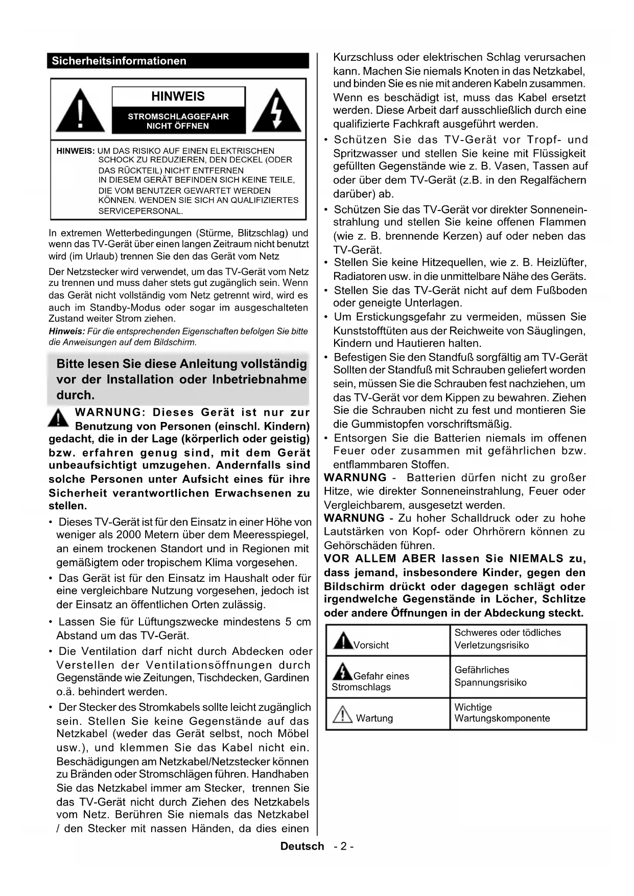 HBBTV-System...................................................... 31 Smart Center ......................................................... 32Deutsch - 2 - Sicherheitsinformationen HINWEIS STROMSCHLAGGEFAHRNICHT ÖFFNENHINWEIS: UM DAS RISIKO AUF EINEN ELEKTRISCHEN SCHOCK ZU REDUZIEREN, DEN DECKEL (ODER DAS RÜCKTEIL) NICHT ENTFERNEN IN DIESEM GERÄT BEFINDEN SICH KEINE TEILE, DIE VOM BENUTZER GEWARTET WERDEN KÖNNEN. WENDEN SIE SICH AN QUALIFIZIERTES SERVICEPERSONAL. Hinweis: Für die entsprechenden Eigenschaften befolgen Sie bitte die Anweisungen auf dem Bildschirm. In extremen Wetterbedingungen (Stürme, Blitzschlag) und wenn das TV-Gerät über einen langen Zeitraum nicht benutzt wird (im Urlaub) trennen Sie den das Gerät vom Netz Der Netzstecker wird verwendet, um das TV-Gerät vom Netz zu trennen und muss daher stets gut zugänglich sein. Wenn das Gerät nicht vollständig vom Netz getrennt wird, wird es auch im Standby-Modus oder sogar im ausgeschalteten Zustand weiter Strom ziehen. Bitte lesen Sie diese Anleitung vollständig vor der Installation oder Inbetriebnahme durch. WARNUNG: Dieses Gerät ist nur zur Benutzung von Personen (einschl. Kindern) gedacht, die in der Lage (körperlich oder geistig) bzw. erfahren genug sind, mit dem Gerät unbeaufsichtigt umzugehen. Andernfalls sind solche Personen unter Aufsicht eines für ihre Sicherheit verantwortlichen Erwachsenen zu stellen.