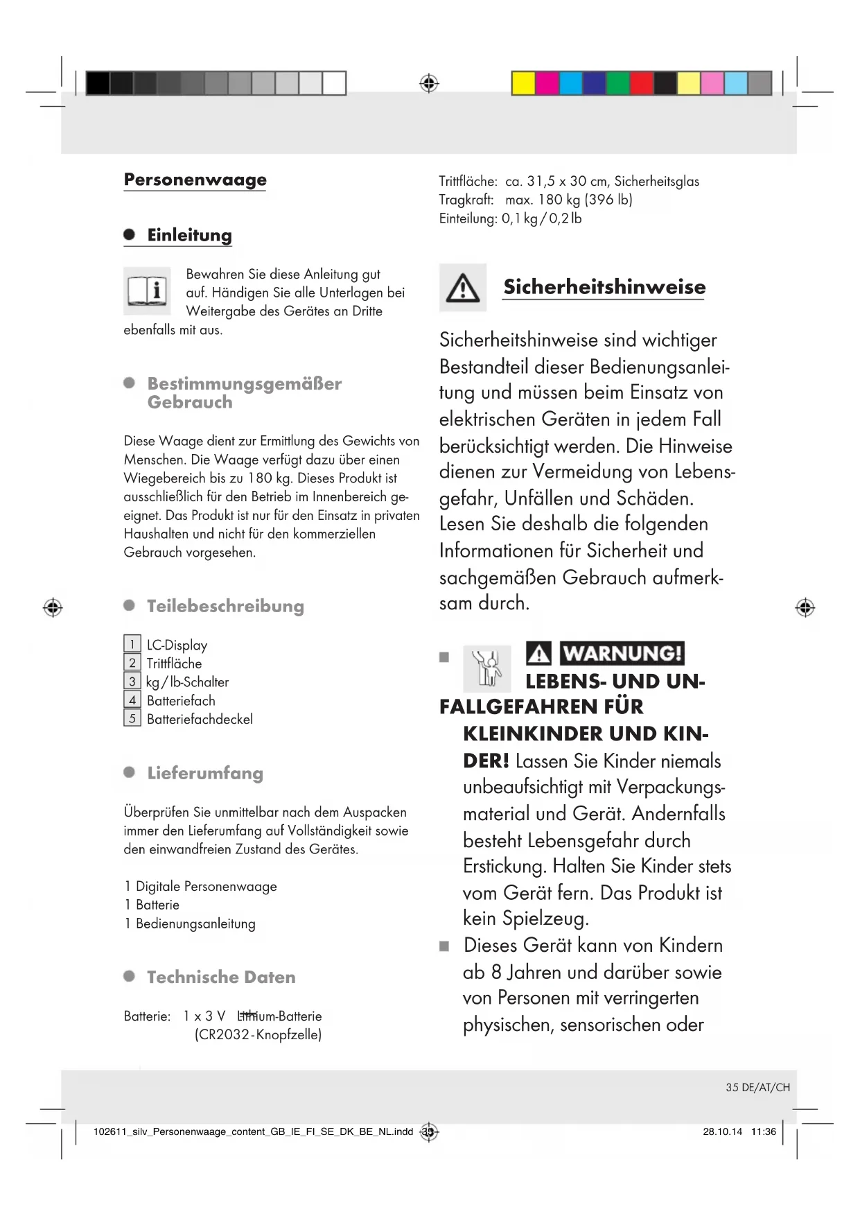 Deze garantie is niet van toepassing op producton- derdelen, die onderhevig zijn aan normale slijtage en hierdoor als aan slijtage onderhevige onderdelen gelden (bijv. batterijen) of voor beschadigingen aan breekbare onderdelen, zoals bijv. schakelaars, ac cu’s of dergelijke onderdelen, die gemaakt zijn van glas. 102611_silv_Personenwaage_content_GB_IE_FI_SE_DK_BE_NL.indd 34 28.10.14 11:3635 DE/AT/CH Personenwaage Einleitung Bewahren Sie diese Anleitung gut auf. Händigen Sie alle Unterlagen bei Weitergabe des Gerätes an Dritte ebenfalls mit aus. Bestimmungsgemäßer Gebrauch Diese Waage dient zur Ermittlung des Gewichts von Menschen. Die Waage verfügt dazu über einen Wiegebereich bis zu 180 kg. Dieses Produkt ist ausschließlich für den Betrieb im Innenbereich ge- eignet. Das Produkt ist nur für den Einsatz in privaten Haushalten und nicht für den kommerziellen Gebrauch vorgesehen. Teilebeschreibung
