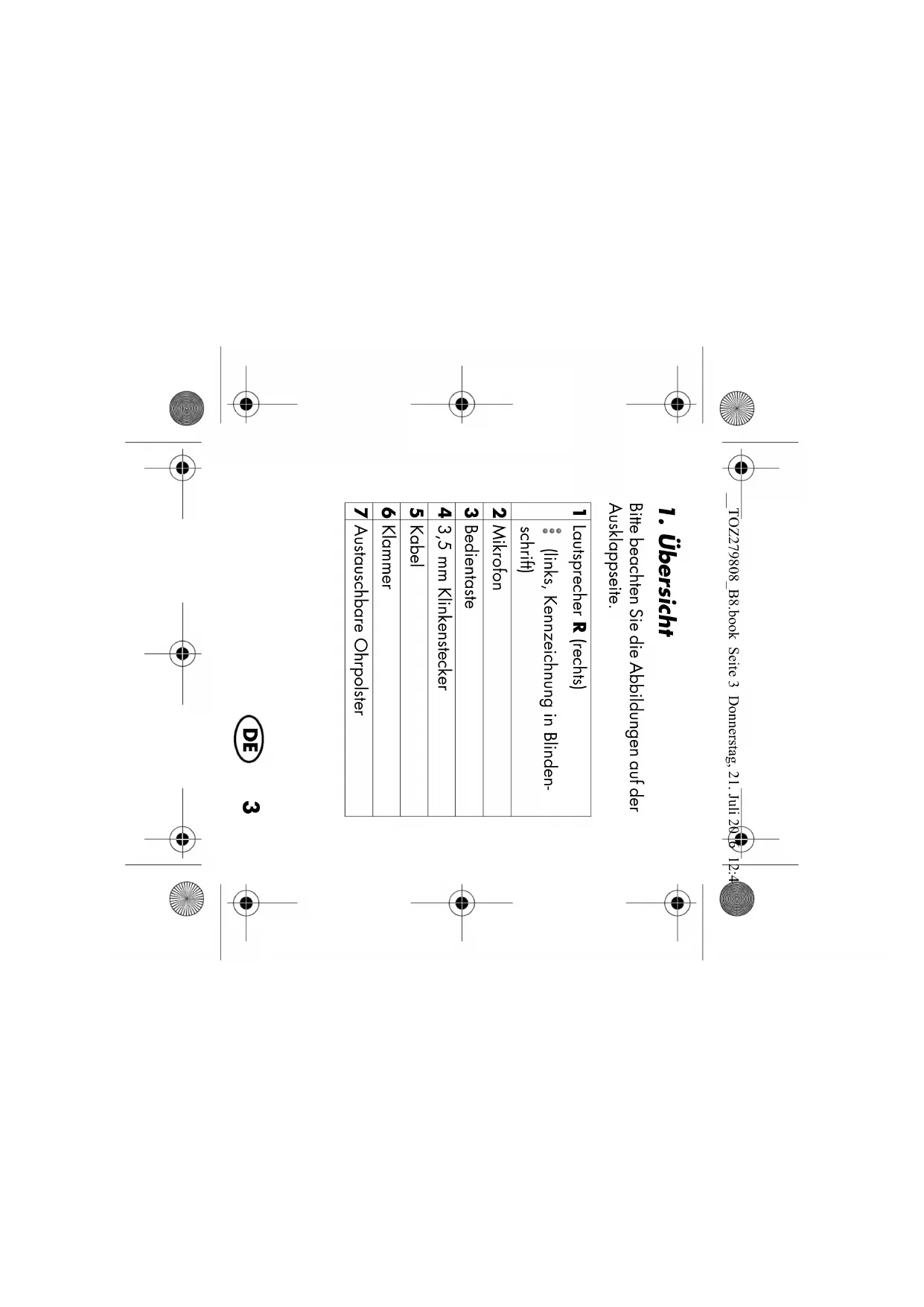 Bitte beachten Sie die Abbildungen auf der Ausklappseite. 1 Lautsprecher R (rechts) (links, Kennzeichnung in Blinden- schrift) 2 Mikrofon 3 Bedientaste 4 3,5 mm Klinkenstecker 5 Kabel 6 Klammer 7 Austauschbare Ohrpolster