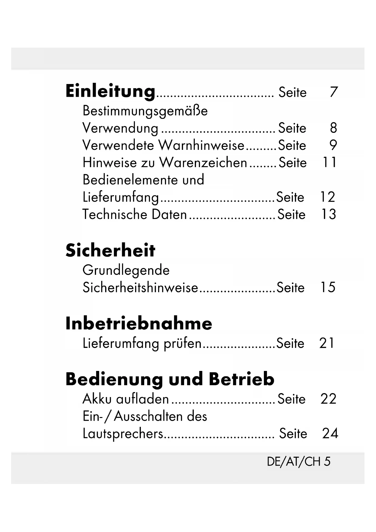 7DE/AT/CH 5 Einleitung.................................. Seite 7 Bestimmungsgemäße Verwendung ................................. Seite 8 Verwendete Warnhinweise ......... Seite 9 Hinweise zu Warenzeichen ........ Seite 11 Bedienelemente und Lieferumfang ................................. Seite 12 Technische Daten ......................... Seite 13 Sicherheit Grundlegende Sicherheitshinweise ...................... Seite 15 Inbetriebnahme Lieferumfang prüfen ..................... Seite 21 Bedienung und Betrieb Akku aufladen .............................. Seite 22 Ein- / Ausschalten des Lautsprechers................................ Seite 24DE/AT/CH6 Lautsprecher mit einem Bluetooth