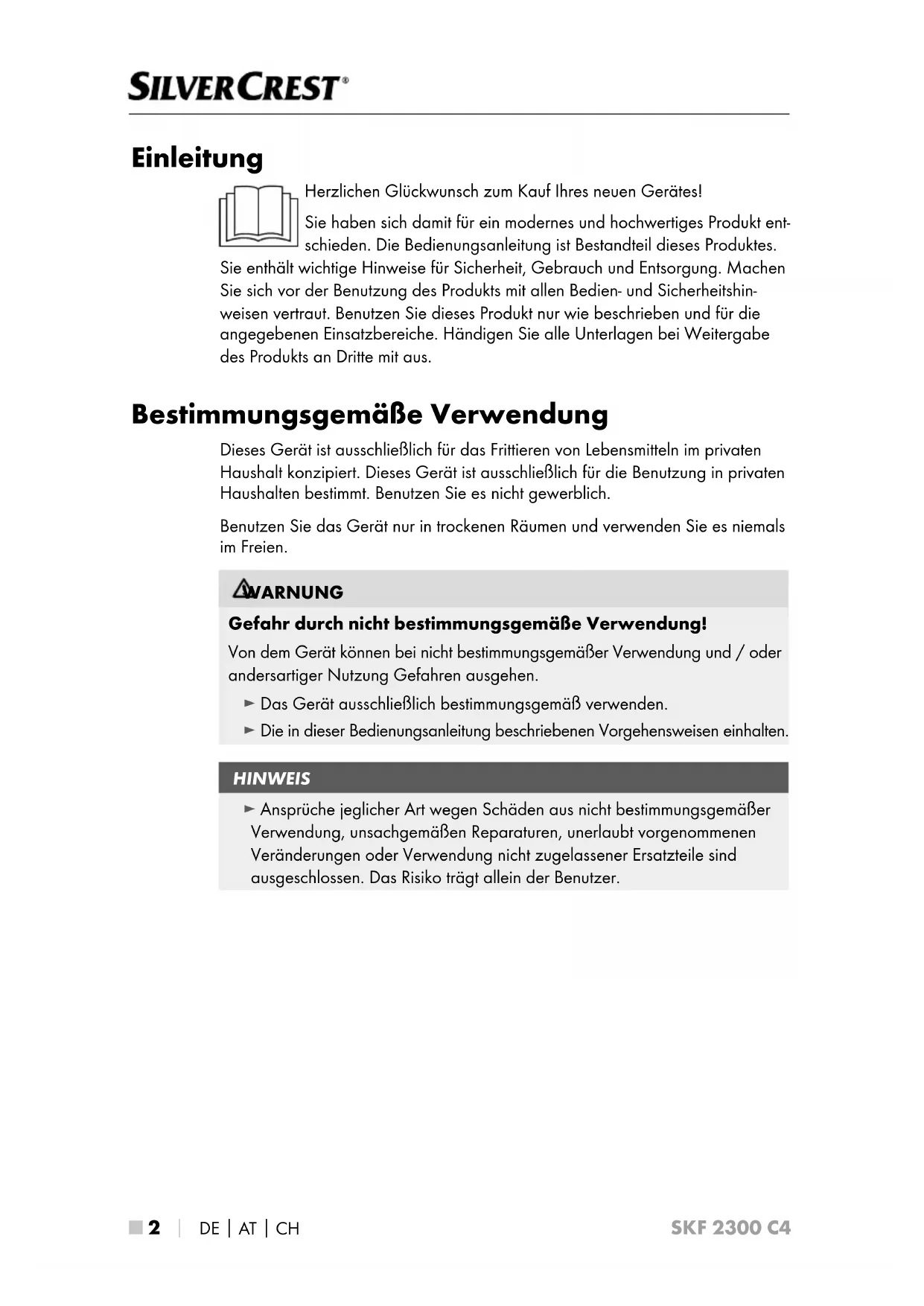 SKF 2300 C4 Einleitung Herzlichen Glückwunsch zum Kauf Ihres neuen Gerätes! Sie haben sich damit für ein modernes und hochwertiges Produkt ent- schieden. Die Bedienungsanleitung ist Bestandteil dieses Produktes. Sie enthält wichtige Hinweise für Sicherheit, Gebrauch und Entsorgung. Machen Sie sich vor der Benutzung des Produkts mit allen Bedien- und Sicherheitshin- weisen vertraut. Benutzen Sie dieses Produkt nur wie beschrieben und für die angegebenen Einsatzbereiche. Händigen Sie alle Unterlagen bei Weitergabe des Produkts an Dritte mit aus. Bestimmungsgemäße Verwendung Dieses Gerät ist ausschließlich für das Frittieren von Lebensmitteln im privaten Haushalt konzipiert. Dieses Gerät ist ausschließlich für die Benutzung in privaten Haushalten bestimmt. Benutzen Sie es nicht gewerblich. Benutzen Sie das Gerät nur in trockenen Räumen und verwenden Sie es niemals im Freien. WARNUNG Gefahr durch nicht bestimmungsgemäße Verwendung! Von dem Gerät können bei nicht bestimmungsgemäßer Verwendung und / oder andersartiger Nutzung Gefahren ausgehen. ► Das Gerät ausschließlich bestimmungsgemäß verwenden. ► Die in dieser Bedienungsanleitung beschriebenen Vorgehensweisen einhalten. HINWEIS ► Ansprüche jeglicher Art wegen Schäden aus nicht bestimmungsgemäßer Verwendung, unsachgemäßen Reparaturen, unerlaubt vorgenommenen Veränderungen oder Verwendung nicht zugelassener Ersatzteile sind ausgeschlossen. Das Risiko trägt allein der Benutzer.DE
