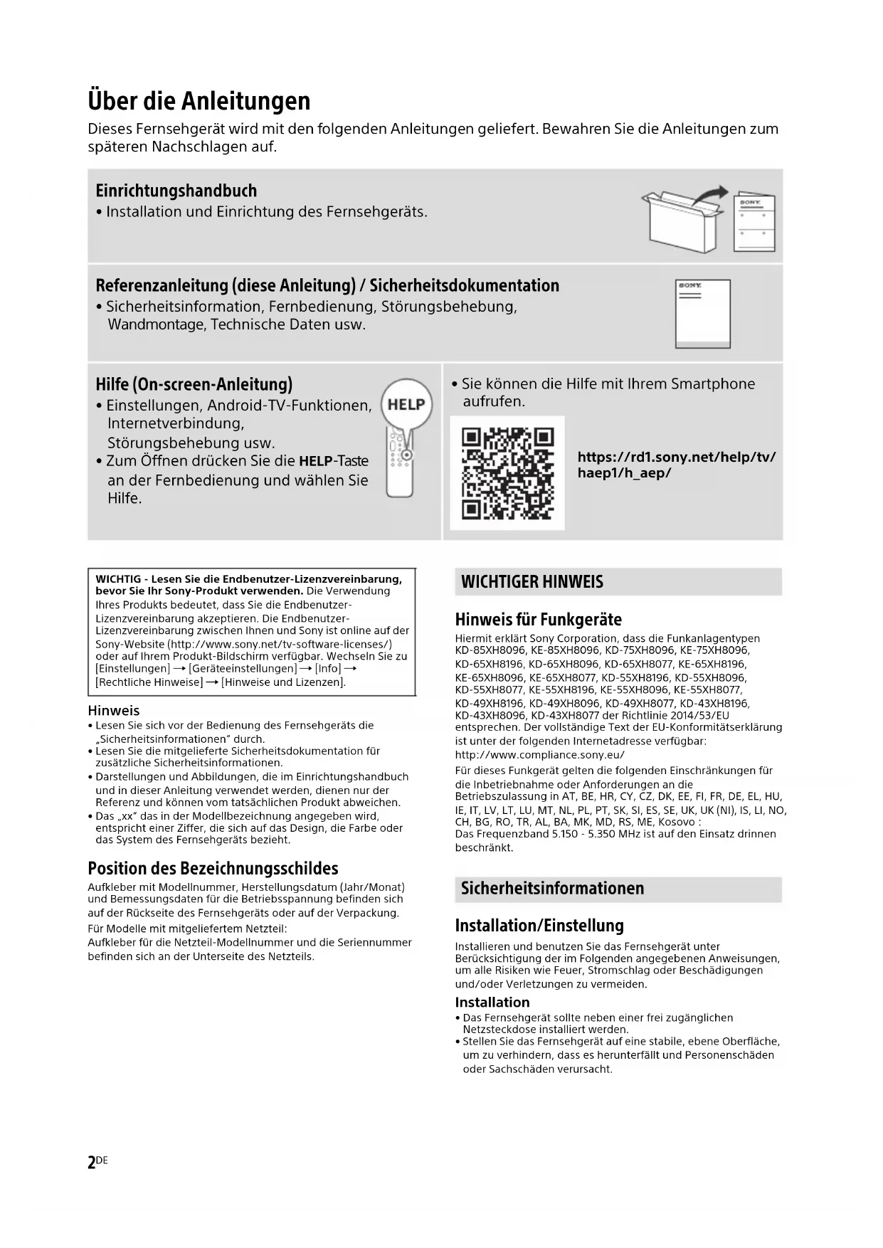 - Sie können die Hilfe mit Ihrem Smartphone aufrufen. https://rd1.sony.net/help/tv/ haep1/h_aep/ WICHTIG - Lesen Sie die Endbenutzer-Lizenzvereinbarung, bevor Sie Ihr Sony-Produkt verwenden. Die Verwendung Ihres Produkts bedeutet, dass Sie die Endbenutzer- Lizenzvereinbarung akzeptieren. Die Endbenutzer- Lizenzvereinbarung zwischen Ihnen und Sony ist online auf der Sony-Website (http://www.sony.net/tv-software-licenses/) oder auf Ihrem Produkt-Bildschirm verfügbar. Wechseln Sie zu [Einstellungen] [Geräteeinstellungen] [Info] [Rechtliche Hinweise] [Hinweise und Lizenzen]. WICHTIGER HINWEIS Sicherheitsinformationen3