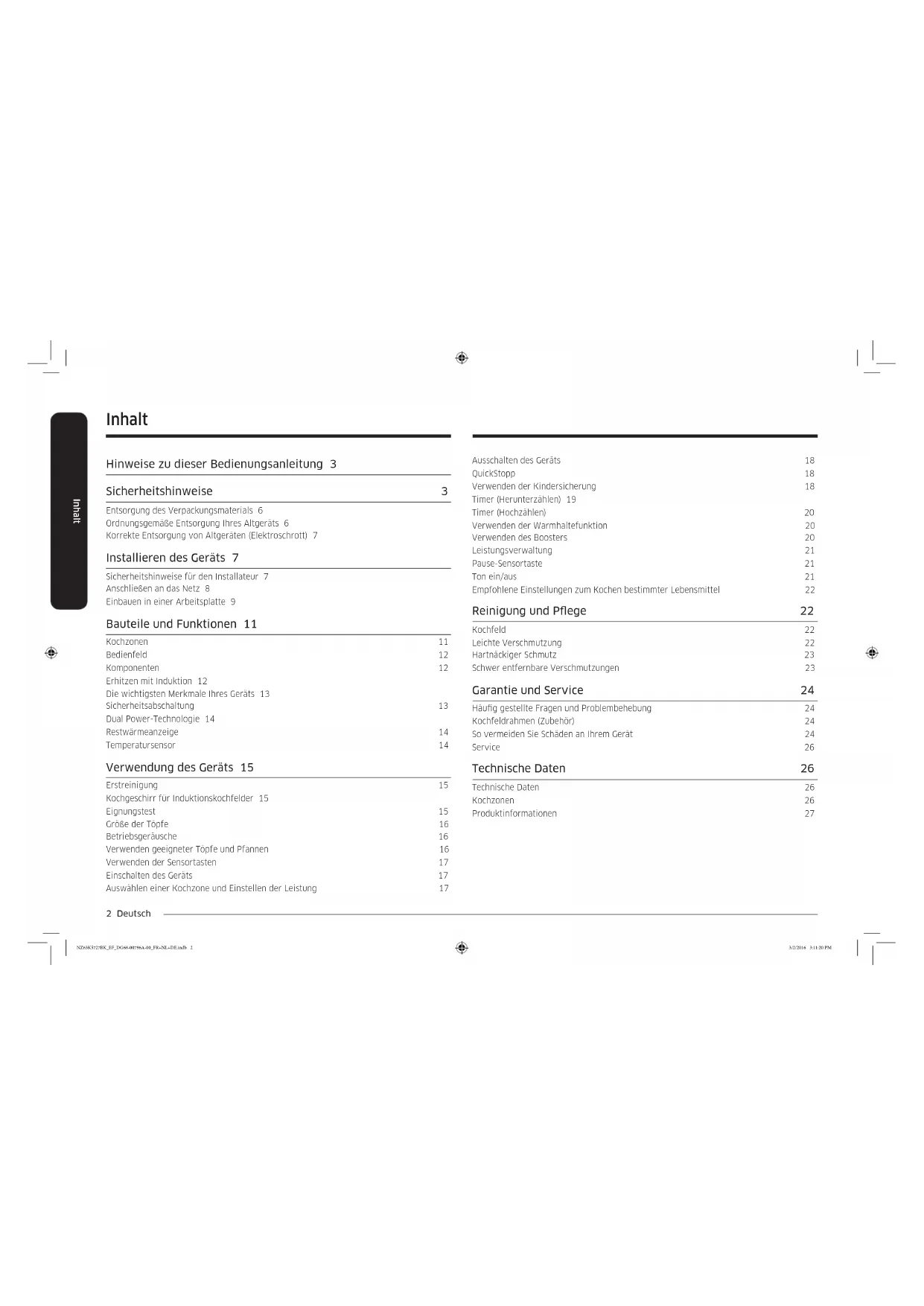 www.samsung.com/be/support (Dutch) www.samsung.com/be_fr/support (French) DENMARK 70 70 19 70 www.samsung.com/dk/support FINLAND 030-6227 515 www.samsung.com//support FRANCE 01 48 63 00 00 www.samsung.com/fr/support GERMANY 0180 6 SAMSUNG bzw. 0180 6 7267864* (*0,20 €/Anruf aus dem dt. Festnetz, aus dem Mobilfunk max. 0,60 €/Anruf) www.samsung.com/de/support ITALIA 800-SAMSUNG (800.7267864) www.samsung.com/it/support CYPRUS 8009 4000 only from landline, toll free www.samsung.com/gr/support GREECE 80111-SAMSUNG (80111 726 7864) only from land line (+30) 210 6897691 from mobile and land line LUXEMBURG 261 03 710 www.samsung.com/be_fr/support NETHERLANDS 0900-SAMSUNG (0900-7267864) (€ 0,10/Min) www.samsung.com/nl/support NORWAY 815 56480 www.samsung.com/no/support PORTUGAL 808 20 7267 www.samsung.com/pt/support SPAIN 0034902172678 www.samsung.com/es/support SWEDEN 0771 726 7864 (0771-SAMSUNG) www.samsung.com/se/support SWITZERLAND 0800 726 78 64 (0800-SAMSUNG) www.samsung.com/ch/support (German) www.samsung.com/ch_fr/support (French) UK 0330 SAMSUNG (7267864) www.samsung.com/uk/support EIRE 0818 717100 www.samsung.com/ie/support DG68-00796A-00 NZ63K5727BK_EF_DG68-00796A-00_FR+NL+DE.indb 28 3/2/2016 3:11:18 PMInduktionskochfeld Benutzerhandbuch NZ63K5727BK NZ63K5727BK_EF_DG68-00796A-00_FR+NL+DE.indb 1 3/2/2016 3:11:20 PM2 Deutsch Inhalt Inhalt Hinweise zu dieser Bedienungsanleitung 3 Sicherheitshinweise 3 Entsorgung des Verpackungsmaterials 6 Ordnungsgemäße Entsorgung Ihres Altgeräts 6 Korrekte Entsorgung von Altgeräten (Elektroschrott) 7 Installieren des Geräts 7 Sicherheitshinweise für den Installateur 7 Anschließen an das Netz 8 Einbauen in einer Arbeitsplatte 9 Bauteile und Funktionen 11 Kochzonen 11 Bedienfeld 12 Komponenten 12 Erhitzen mit Induktion 12 Die wichtigsten Merkmale Ihres Geräts 13 Sicherheitsabschaltung 13 Dual Power-Technologie 14 Restwärmeanzeige 14 Temperatursensor 14 Verwendung des Geräts 15 Erstreinigung 15 Kochgeschirr für Induktionskochfelder 15 Eignungstest 15 Größe der Töpfe 16 Betriebsgeräusche 16 Verwenden geeigneter Töpfe und Pfannen 16 Verwenden der Sensortasten 17 Einschalten des Geräts 17 Auswählen einer Kochzone und Einstellen der Leistung 17 Ausschalten des Geräts 18 QuickStopp 18 Verwenden der Kindersicherung 18 Timer (Herunterzählen) 19 Timer (Hochzählen) 20 Verwenden der Warmhaltefunktion 20 Verwenden des Boosters 20 Leistungsverwaltung 21 Pause-Sensortaste 21 Ton ein/aus 21 Empfohlene Einstellungen zum Kochen bestimmter Lebensmittel 22 Reinigung und Pege 22 Kochfeld 22 Leichte Verschmutzung 22 Hartnäckiger Schmutz 23 Schwer entfernbare Verschmutzungen 23 Garantie und Service 24 Häug gestellte Fragen und Problembehebung 24 Kochfeldrahmen (Zubehör) 24 So vermeiden Sie Schäden an Ihrem Gerät 24 Service 26 Technische Daten 26 Technische Daten 26 Kochzonen 26 Produktinformationen 27 NZ63K5727BK_EF_DG68-00796A-00_FR+NL+DE.indb 2 3/2/2016 3:11:20 PMDeutsch 3 Hinweise zu dieser Bedienungsanleitung Hinweise zu dieser Bedienungsanleitung Bitte nehmen Sie sich die Zeit, um diese Bedienungsanleitung sorgfältig zu lesen. Achten Sie insbesondere auf die im folgenden Abschnitt enthaltenen Sicherheitsinformationen, bevor Sie Ihr Gerät in Betrieb nehmen. Bewahren Sie diese Bedienungsanleitung zur späteren Verwendung auf. Wenn Sie das Gerät an eine andere Person weitergeben, vergessen Sie bitte nicht, auch das Handbuch an den neuen Besitzer weiterzugeben. In diesem Benutzerhandbuch werden folgende Symbole verwendet: WARNUNG Gefahren oder unsichere Verhaltensweisen, die zu schweren Verletzungen oder zum Tod führen können. VORSICHT Gefährliche bzw. unsichere Praktiken, die zu leichten Verletzungen oder Sachschäden führen können. VORSICHT Um die Gefahr von Bränden und Explosionen, elektrischem Schlag und anderen Verletzungen beim Einsatz Ihres Geräts zu vermindern, beachten Sie folgende Sicherheitsregeln: HINWEIS Nützliche Tipps, Empfehlungen oder Informationen, die Ihnen den Umgang mit dem Gerät erleichtern. Sicherheitshinweise Dieses Gerät erfüllt die technischen Normen und Sicherheitsbestimmungen, die für diesen Gerätetyp gelten. Bitte beachten Sie die folgenden Sicherheitshinweise, um die Gefahr von Verletzungen des Benutzers oder Schäden am Gerät zu minimieren. WARNUNG Dieses Gerät ist nicht zur Verwendung durch Personen (einschließlich Kindern) mit verringerten körperlichen, sensorischen oder mentalen Fähigkeiten oder einem Mangel an Erfahrung und Wissen bestimmt, sofern sie nicht von einer für ihre Sicherheit verantwortlichen Person im Umgang mit dem Gerät unterwiesen wurden und von dieser beaufsichtigt werden. Kinder müssen beaufsichtigt werden, um zu verhindern, dass sie mit dem Gerät spielen. Falls das Netzkabel beschädigt ist, muss es vom Hersteller oder vom Kundendienst bzw. von einer entsprechend qualizierten Fachkraft ausgetauscht werden, um Gefährdungen auszuschließen. Das Gerät muss so aufgestellt werden, dass es auch nach der Installation vom Netz getrennt werden kann. Dies kann erreicht werden, indem der Stecker stets zugänglich bleibt oder in die fest verlegte Leitung ein den Anschlussvorschriften entsprechender Schalter eingebaut wird. WARNUNG: Wenn die Oberäche einen Riss aufweist, schalten Sie das Gerät aus, um die Möglichkeit von Stromschlägen auszuschließen. NZ63K5727BK_EF_DG68-00796A-00_FR+NL+DE.indb 3 3/2/2016 3:11:20 PM4 Deutsch Sicherheitshinweise Sicherheitshinweise Dieses Gerät darf von Kindern ab 8 Jahren und Personen mit verminderten körperlichen, sensorischen oder geistigen Fähigkeiten oder einem Mangel an Erfahrung und Wissen bedient werden, wenn sie unter Aufsicht stehen oder eine Unterweisung zum sicheren Umgang mit dem Gerät erhalten haben und die damit verbundenen Gefahren verstehen. Kinder dürfen nicht mit dem Gerät spielen. Kinder dürfen bei Reinigung und Wartung nur dann helfen, wenn sie dabei beaufsichtigt werden. WARNUNG: Wenn Sie das Gerät beim Zubereite