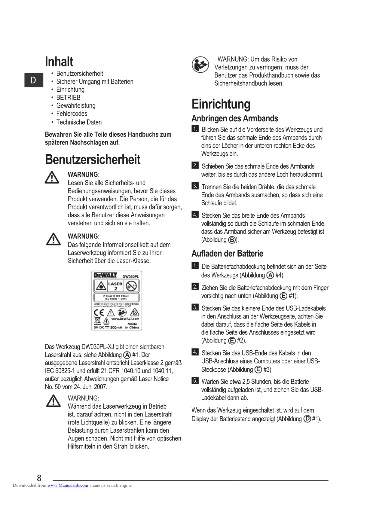 #1. Der ausgegebene Laserstrahl entspricht Laserklasse 2 gemäß IEC 60825-1 und erfüllt 21 CFR 1040.10 und 1040.11, außer bezüglich Abweichungen gemäß Laser Notice No. 50 vom 24. Juni 2007. WARNUNG: Während das Laserwerkzeug in Betrieb ist, darauf achten, nicht in den Laserstrahl (rote Lichtquelle) zu blicken. Eine längere Belastung durch Laserstrahlen kann den Augen schaden. Nicht mit Hilfe von optischen Hilfsmitteln in den Strahl blicken. WARNUNG: Um das Risiko von Verletzungen zu verringern, muss der Benutzer das Produkthandbuch sowie das Sicherheitshandbuch lesen. Einrichtung Anbringen des Armbands