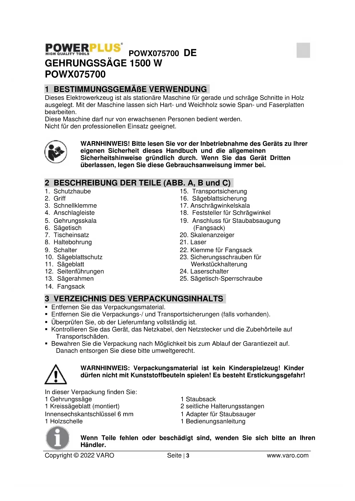 - Bewahren Sie die Verpackung nach Möglichkeit bis zum Ablauf der Garantiezeit auf. Danach entsorgen Sie diese bitte umweltgerecht. WARNHINWEIS: Verpackungsmaterial ist kein Kinderspielzeug! Kinder dürfen nicht mit Kunststoffbeuteln spielen! Es besteht Erstickungsgefahr! In dieser Verpackung finden Sie: 1 Gehrungssäge 1 Kreissägeblatt (montiert) Innensechskantschlüssel 6 mm 1 Holzschelle 1 Staubsack 2 seitliche Halterungsstangen 1 Adapter für Staubsauger 1 Bedienungsanleitung Wenn Teile fehlen oder beschädigt sind, wenden Sie sich bitte an Ihren Händler.POWX075700 DE Copyright © 2022 VARO Seite | 4 www.varo.com