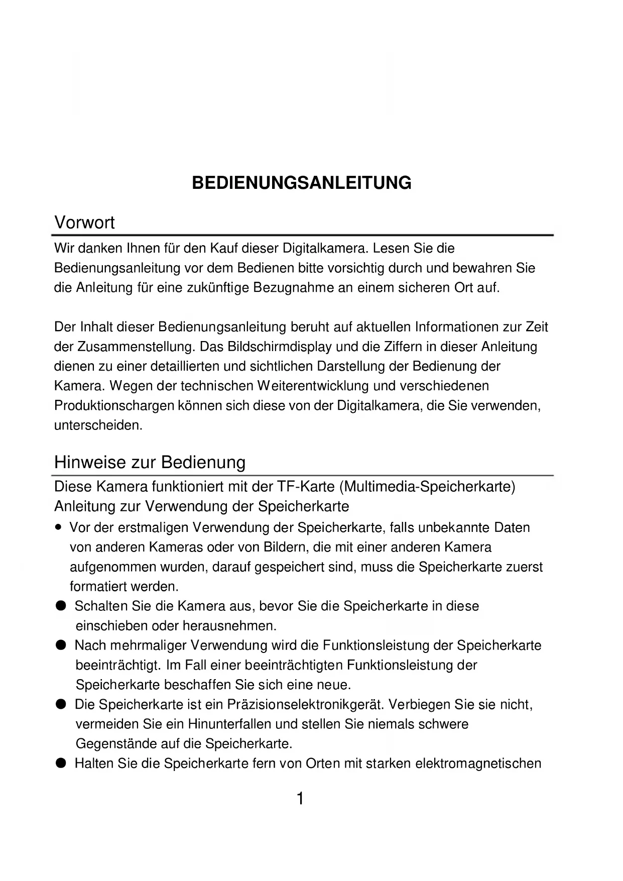 BEDIENUNGSANLEITUNG Vorwort Wir danken Ihnen für den Kauf dieser Digitalkamera. Lesen Sie die Bedienungsanleitung vor dem Bedienen bitte vorsichtig durch und bewahren Sie die Anleitung für eine zukünftige Bezugnahme an einem sicheren Ort auf. Der Inhalt dieser Bedienungsanleitung beruht auf aktuellen Informationen zur Zeit der Zusammenstellung. Das Bildschirmdisplay und die Ziffern in dieser Anleitung dienen zu einer detaillierten und sichtlichen Darstellung der Bedienung der Kamera. Wegen der technischen Weiterentwicklung und verschiedenen Produktionschargen können sich diese von der Digitalkamera, die Sie verwenden, unterscheiden. Hinweise zur Bedienung Diese Kamera funktioniert mit der TF-Karte (Multimedia-Speicherkarte) Anleitung zur Verwendung der Speicherkarte ● Vor der erstmaligen Verwendung der Speicherkarte, falls unbekannte Daten von anderen Kameras oder von Bildern, die mit einer anderen Kamera aufgenommen wurden, darauf gespeichert sind, muss die Speicherkarte zuerst formatiert werden. ● Schalten Sie die Kamera aus, bevor Sie die Speicherkarte in diese einschieben oder herausnehmen. ● Nach mehrmaliger Verwendung wird die Funktionsleistung der Speicherkarte beeinträchtigt. Im Fall einer beeinträchtigten Funktionsleistung der Speicherkarte beschaffen Sie sich eine neue. ● Die Speicherkarte ist ein Präzisionselektronikgerät. Verbiegen Sie sie nicht, vermeiden Sie ein Hinunterfallen und stellen Sie niemals schwere Gegenstände auf die Speicherkarte. ● Halten Sie die Speicherkarte fern von Orten mit starken elektromagnetischen2 Feldern, z.B. in unmittelbarer Nähe von Lautsprechern oder TV-Empfängern. ● Halten Sie die Speicherkarte fern von Orten mit extrem hohen oder niedrigen Temperaturen. ● Halten Sie die Speicherkarte sauber und schützen Sie sie vor Flüssigkeiten. Falls sie mit einer Flüssigkeit in Berührung gekommen ist, wischen Sie sie sauber und trocknen sie mit einem weichen Lappen. ● Bei Nichtgebrauch bewahren Sie die Speicherkarte in deren Schutzhülle auf. ● Beachten Sie bitte, dass die Speicherkarte bei längerem Gebrauch heiss anlaufen kann. Dies ist normal. ● Die Speicherkarte darf in keinem Fall verwendet werden, falls diese in anderen Digitalvideorekorder oder Digitalkameras benutzt wurde. Vor der Verwendung der Speicherkarte muss diese zuerst formatiert werden. ● Keine Speicherkarte verwenden, die für andere Digitalvideorekorder oder Digitalkameras formatiert wurde. ● Die aufgezeichneten Daten können unter einigen der folgenden Umstände zerstört werden: - Unsachgemäße Verwendung der Speicherkarte; - Ausschalten oder Entfernen der Speicherkarte während dem Aufzeichnen, Löschen (formatieren) oder Lesen; ● Es wird empfohlen, Reservekopien der wichtigen Daten oder anderer Medien, z.B. Softdiskette, Festplatte oder CD, anzufertigen. ● Für die beste Bildqualität verwenden Sie eine Hochgeschwindigkeits-TF-Karte mindestens der Klasse 4. Die Kamera warten ● Schützen Sie das Objektiv und das Display mit der Schutzhülle, um Kratzer zu vermeiden. ● Pusten Sie Staub und Sand von der Oberfläche des Objektivs, bevor Sie dieses sauberwischen. Danach das Objektiv vorsichtig mit einem Lappen oder einem Seidenpapier, das zum Sauberwischen von optischen Geräten gedacht ist, sauber wischen. Verwenden Sie ein Reinigungsmittel für Objektive, falls notwendig. Die Kamera darf in keinem Fall mit organischen Reinigungsmitteln saubergewischt werden. ● Die Oberfläche des Objektivs darf in keinem Fall mit dem Finger berührt werden.3 Systemvoraussetzungen Bei der Bedienung und Verwendung dieser Digitalkamera beachten Sie die minimalen Systemvoraussetzungen für die Kamera. Es wird nachdrücklich empfohlen, zum Bedienen der Kamera für einen besseren Effekt einen Computer mit einer besseren Leistung zu benutzen. Die minimalen Systemvoraussetzungen sind unten gegeben: Systemvoraussetzungen Betriebssystem Microsoft Windows 7, 2000, XP, VISTA CPU Intel PIII667 oder höher, oder CPU mit gleichwertiger Leistung Interner Speicher 512 MB oder höher Soundkarte, Grafikkarte Soundkarte oder Grafikkarte, die DirectX8 oder höher