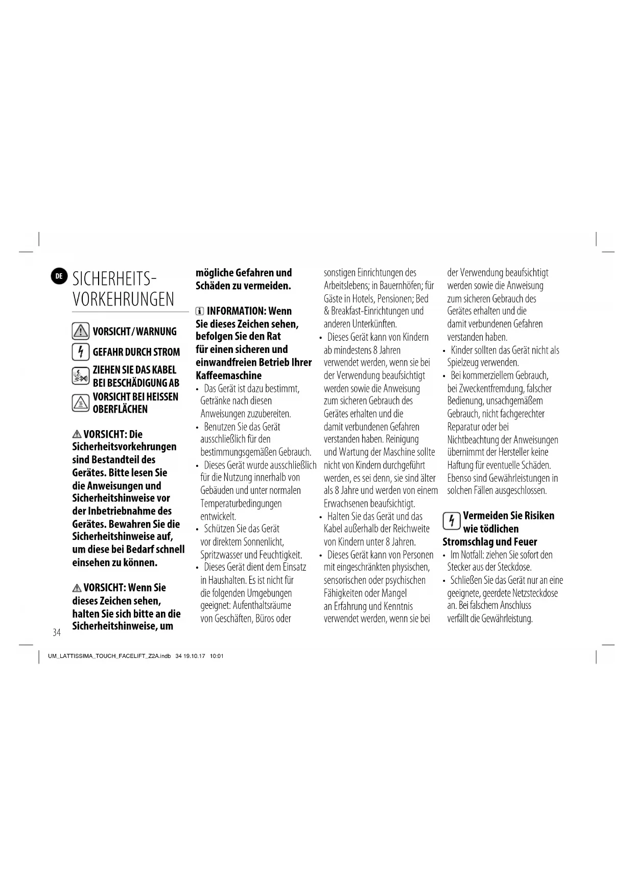 UM_LATTISSIMA_TOUCH_FACELIFT_Z2A.indb 33 19.10.17 10:01DE SICHERHEITS VORKEHRUNGEN VORSICHT / WARNUNG