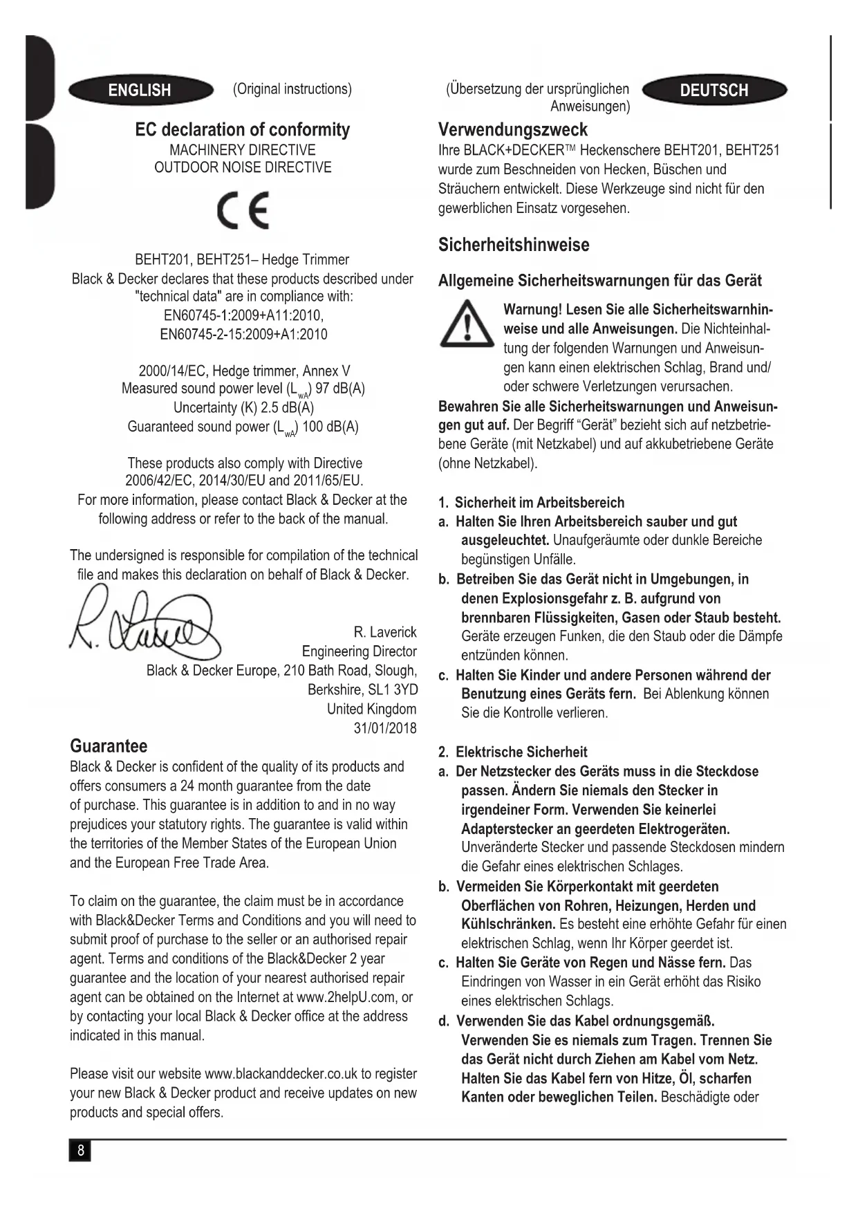 ) 100 dB(A) Diese Produkte entsprechen außerdem den Richtlinien 2006/42/EC, 2014/30/EU und 2011/65/EU. Weitere Informationen erhalten Sie von Black & Decker unter der folgenden Adresse. Diese bendet sich auch auf der Rückseite dieser Anleitung. Der Unterzeichnete ist verantwortlich für die Zusammenstellung der technischen Daten und gibt diese Erklärung im Namen von Black & Decker ab. R. Laverick Engineering Director Black & Decker Europe, 210 Bath Road, Slough, Berkshire, SL1 3YD Vereinigtes Königreich