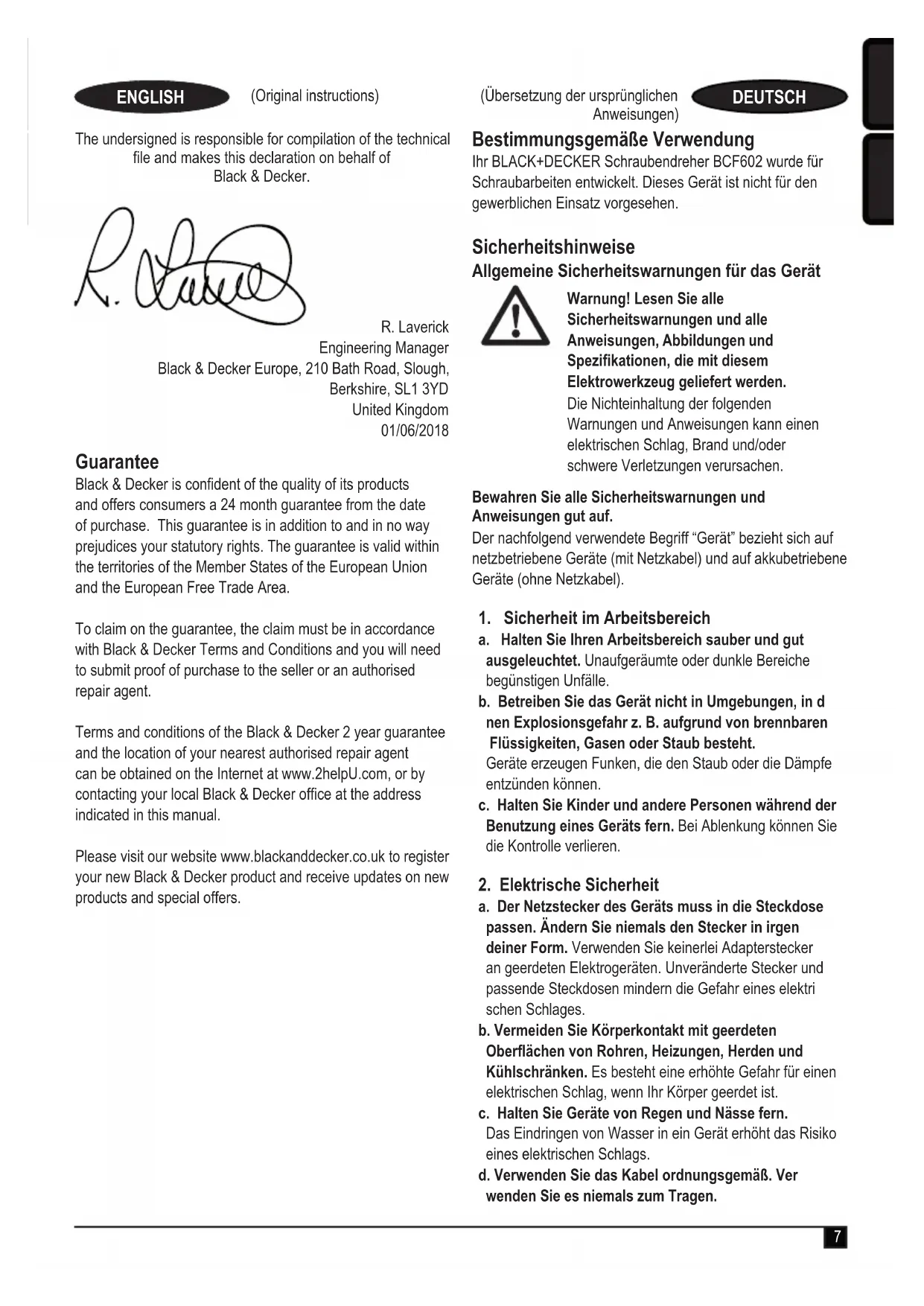 BCF602 - Schraubendreher Black & Decker erklärt, dass die in den „Technischen Daten“ beschriebenen Geräte übereinstimmen mit: 2006/42/EC, EN62841-1:2015, EN62841-2-2:2014. Diese Produkte entsprechen außerdem den Richtlinien 2014/30/EU und 2011/65/EU. Weitere Informationen erhalten Sie von Black & Decker unter der folgenden Adresse. Diese bendet sich auch auf der Rückseite dieser Anleitung. Der Unterzeichnete ist verantwortlich für die Zusammenstellung der technischen Daten und gibt diese Erklärung im Namen von Black & Decker ab. R. Laverick Engineering Manager Black & Decker Europe, 210 Bath Road, Slough, Berkshire, SL1 3YD Vereinigtes Königreich