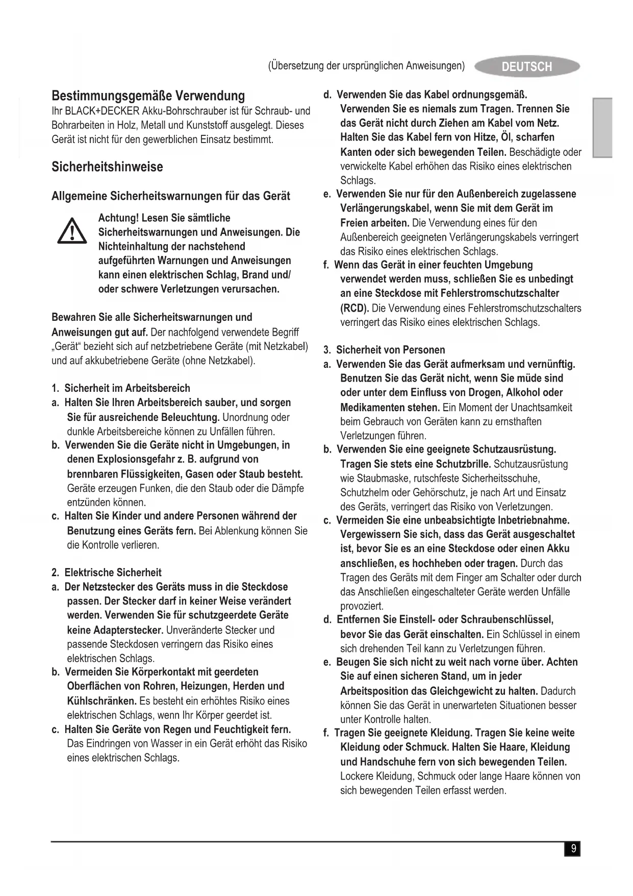 ein, um Bohrungen in Holz, Metall oder Kunststoff vorzunehmen. u Stellen Sie zum Ausführen von Schraubarbeiten an der Drehmomentvorwahl die gewünschte Position ein. Sollten Ihnen die jeweils erforderlichen Einstellungen noch nicht bekannt sein, gehen Sie wie folgt vor: - Stellen Sie die Drehmomentvorwahl (4) auf die niedrigste Drehmomenteinstellung ein. - Ziehen Sie mit dieser Einstellung die erste Schraube fest. - Wenn die Einstellung nicht zum gewünschten Ergebnis führt, erhöhen Sie die Drehmomenteinstellung, und fahren Sie fort. Wiederholen Sie diesen Vorgang bis Sie die richtige Einstellung gefunden haben. Verwenden Sie die Einstellung auch für die übrigen Schrauben. Bohren/Schrauben u Wählen Sie mithilfe des Vor/Zurückwahlschalter (2) die Vorwärts- bzw. Rückwärtsdrehung aus. u Drücken Sie zum Einschalten des Geräts den Schalter (1). Die Geschwindigkeit des Werkzeugs hängt davon ab, wie weit Sie den Schalter eindrücken. u Lassen Sie zum Ausschalten des Geräts den Schalter los. Hinweise für optimale Arbeitsergebnisse Bohrarbeiten u Stets mit leichtem Druck in gerader Linie mit dem Bohreinsatz arbeiten. u Verringern Sie den Druck kurz bevor der Bohreinsatz das Werkstück durchbricht. u Verwenden Sie einen Holzklotz als Unterlage unter Werkstücken, die möglicherweise splittern. u Verwenden Sie Spitzbohrer, wenn Sie Löcher mit großem Durchmesser in Holz bohren. u Verwenden Sie HSS-Bohreinsätze zum Bohren im Metall. u Verwenden Sie zum Bohren in Mauerwerk einen geeigneten Bohreinsatz. u Verwenden Sie ein Schmiermittel, wenn Sie in Metall bohren (ausgenommen Gusseisen und Messing). u Erzeugen Sie mithilfe eines Körners eine Vertiefung in der Mitte des zu bohrenden Lochs, um die Genauigkeit der Bohrung zu erhöhen. Schraubarbeiten u Verwenden Sie stets Schraubendrehereinsätze der richtigen Art und Größe. u Sollten beim Festziehen von Schrauben Schwierigkeiten auftreten, verwenden Sie etwas Spülmittel oder Seife als Schmiermittel. u Halten Sie das Gerät und den Schraubendrehereinsatz stets in gerader Linie zur Schraube. Wartung Ihr BLACK+DECKER Gerät wurde im Hinblick auf eine lange Lebensdauer und einen möglichst geringen Wartungsaufwand entwickelt. Ein dauerhafter, einwandfreier Betrieb setzt eine regelmäßige Pege und Reinigung voraus. Das Ladegerät benötigt keine Wartung, es sollte aber regelmäßig gereinigt werden. Achtung! Entfernen Sie vor jeglichen Wartungsarbeiten am Gerät den Akku aus dem Gerät. Ziehen Sie das Ladegerät aus der Netzsteckdose, bevor Sie es reinigen. u Reinigen Sie regelmäßig die Lüftungsschlitze des Geräts und des Ladegeräts mit einer weichen Bürste oder einem trockenen Tuch. u Reinigen Sie regelmäßig das Motorgehäuse mit Hilfe eines feuchten Tuchs. Verwenden Sie keine scheuernden Reinigungsmittel oder Reinigungsmittel auf Lösungsmittelbasis. u Öffnen Sie regelmäßig das Spannfutter, und entfernen Sie durch Klopfen Staub aus dem Inneren des Geräts.14 (Übersetzung der ursprünglichen Anweisungen) DEUTSCH Umweltschutz