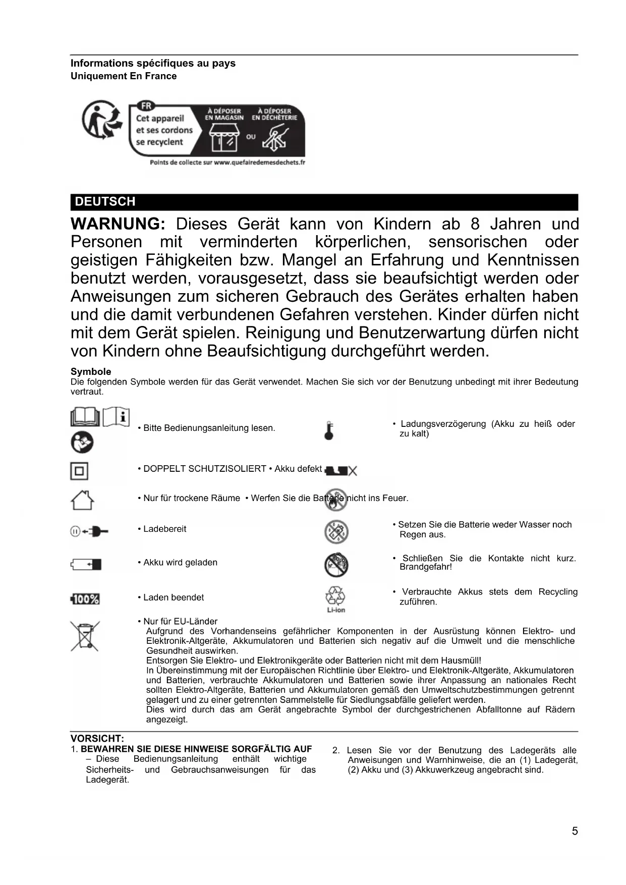 - Pour les pays de l’Union européenne uniquement En raison de la présence de composants dangereux dans l’équipement, les déchets d’équipements électriques et électroniques, les accumulateurs et les batteries peuvent avoir un impact négatif sur l’environnement et la santé humaine. Ne jetez pas les appareils électriques et électroniques ou les batteries avec les ordures ménagères ! Conformément à la directive européenne relative aux déchets d’équipements électriques et électroniques et aux déchets d’accumulateurs et de batteries, ainsi qu’à son adaptation à la législation nationale, les déchets d’équipements électriques, les batteries et les accumulateurs doivent être collectés séparément et déposés dans un point de collecte distinct pour déchets urbains, conformément aux réglementations en matière de protection de l’environnement. Cela est indiqué par le symbole de la poubelle à roulettes barrée sur l’équipement. Type de batterie Tension (V) Nombre de cellules Capacité (Ah) Temps de charge (en minutes) BL7010 7,2 2 1,0 30 BL0715 7,2 2 1,5 35 BL1013 10,8 3 1,3 50 BL1015K 10,8 3 1,5 555 Informations spécifiques au pays Uniquement En France WARNUNG: Dieses Gerät kann von Kindern ab 8 Jahren und Personen mit verminderten körperlichen, sensorischen oder geistigen Fähigkeiten bzw. Mangel an Erfahrung und Kenntnissen benutzt werden, vorausgesetzt, dass sie beaufsichtigt werden oder Anweisungen zum sicheren Gebrauch des Gerätes erhalten haben und die damit verbundenen Gefahren verstehen. Kinder dürfen nicht mit dem Gerät spielen. Reinigung und Benutzerwartung dürfen nicht von Kindern ohne Beaufsichtigung durchgeführt werden. Symbole Die folgenden Symbole werden für das Gerät verwendet. Machen Sie sich vor der Benutzung unbedingt mit ihrer Bedeutungvertraut. VORSICHT: 1. BEWAHREN SIE DIESE HINWEISE SORGFÄLTIG AUF– Diese Bedienungsanleitung enthält wichtigeSicherheits- und Gebrauchsanweisungen für dasLadegerät. 2. Lesen Sie vor der Benutzung des Ladegeräts alleAnweisungen und Warnhinweise, die an (1) Ladegerät,(2) Akku und (3) Akkuwerkzeug angebracht sind. DEUTSCH