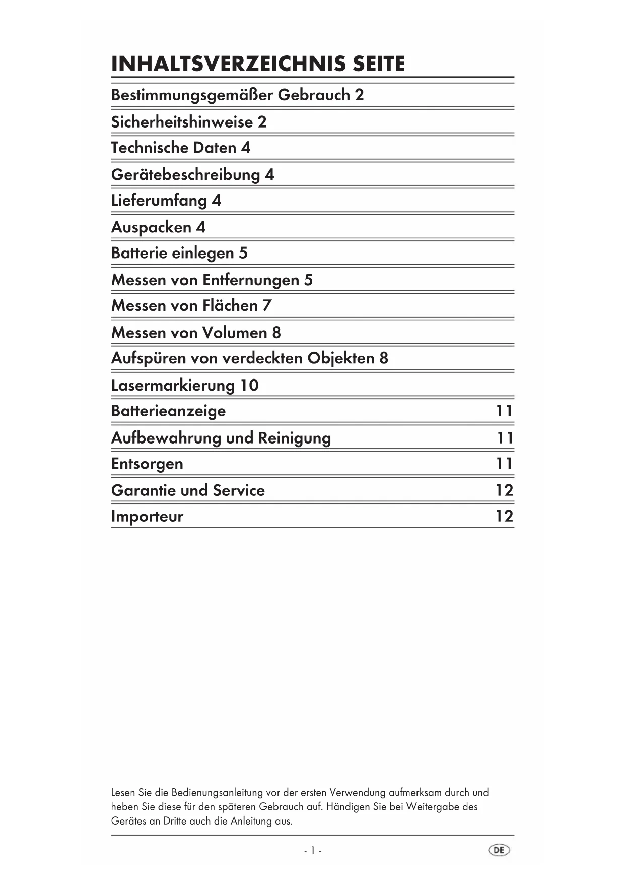 MULTIFUNKTIONSDETEKTOR Bedienungsanleitung RILEVATORE MUTIFUNZIONE Istruzioni per l'uso DÉTECTEUR MULTIFONCTION Mode d'emploi MULTI-FUNCTION DETECTOR Operating instructionsDE / AT / CH Bedienungsanleitung Seite 1 FR / CH Mode d'emploi Page 13 IT / CH Istruzioni per l'uso Pagina 25 GB Operating instructions Page 37 Klappen Sie vor dem Lesen die Seite mit den Abbildungen aus und machen Sie sich anschließend mit allen Funktionen des Gerätes vertraut. Avant de lire le mode d'emploi, ouvrez la page contenant les illustrations et familiarisez-vous ensuite avec toutes les fonctions de l'appareil. Prima di leggere aprire la pagina con le immagini e prendere confidenza con le diverse funzioni dell'apparecchio. Before reading, unfold the page containing the illustrations and familiarise yourself with all functions of the device.- 1 - INHALTSVERZEICHNIS SEITE Bestimmungsgemäßer Gebrauch 2 Sicherheitshinweise 2 Technische Daten 4 Gerätebeschreibung 4 Lieferumfang 4 Auspacken 4 Batterie einlegen 5 Messen von Entfernungen 5 Messen von Flächen 7 Messen von Volumen 8 Aufspüren von verdeckten Objekten 8 Lasermarkierung 10 Batterieanzeige 11 Aufbewahrung und Reinigung 11 Entsorgen 11 Garantie und Service 12 Importeur 12 Lesen Sie die Bedienungsanleitung vor der ersten Verwendung aufmerksam durch und heben Sie diese für den späteren Gebrauch auf. Händigen Sie bei Weitergabe des Gerätes an Dritte auch die Anleitung aus.- 2 - MULTIFUNKTIONSDETEKTOR PMDL 5 A1 Bestimmungsgemäßer Gebrauch Der Multidetektor mit Laser ist zur Ortung von elektrischen Leitungen, von Metall- und Holzobjekten, zum Projizieren von Laserlinien, zum Berechnen von Flächen und Volumina, sowie zum Messen von Entfernungen konzipiert. Dieses Gerät ist nur für private Zwecke bestimmt. Gebrauchen Sie es nicht gewerblich. Eine ande- re oder darüber hinausgehende Benutzung gilt als nicht bestimmungsgemäß und kann zu Beschädigungen und Verletzungen führen. Für Schäden durch Manipula- tion an der Lasereinrichtung, sowie am Ultraschallsender/-empfänger und bei Nichtbefolgen der Sicherheitshinweise wird keine Haftung übernommen. Sicherheitshinweise Optimales und sicheres Arbeiten mit dem Multidetektor ist nur möglich, wenn Sie die Bedienungsanleitung und die Sicherheitshinweise vollständig lesen und die darin enthaltenen Anweisungen strikt befolgen. Verletzungsgefahr!