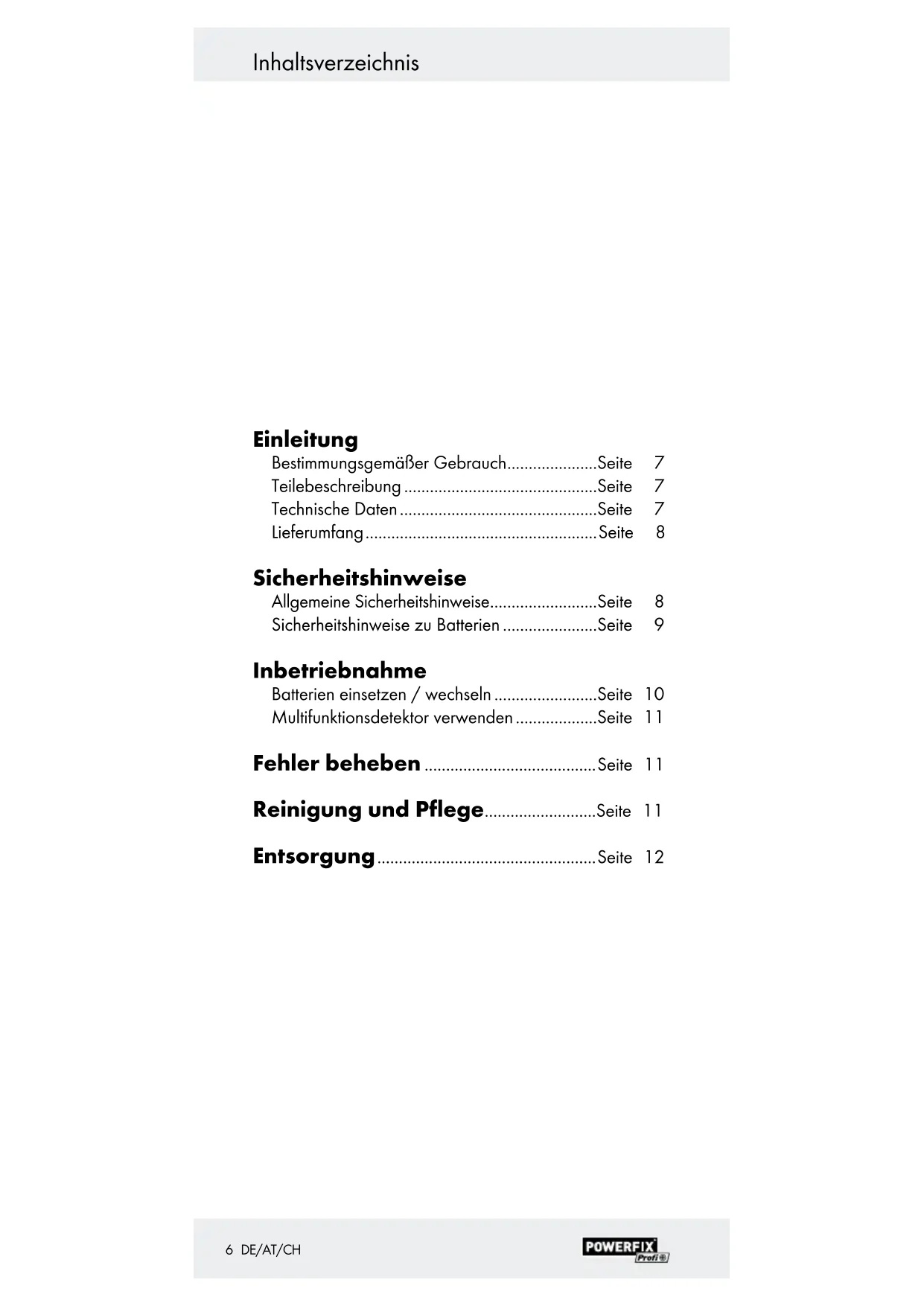 56 DE/AT/CH Inhaltsverzeichnis Einleitung Bestimmungsgemäßer Gebrauch .....................Seite 7 Teilebeschreibung .............................................Seite 7 Technische Daten ..............................................Seite 7 Lieferumfang ......................................................Seite 8 Sicherheitshinweise Allgemeine Sicherheitshinweise .........................Seite 8 Sicherheitshinweise zu Batterien ......................Seite 9 Inbetriebnahme Batterien einsetzen / wechseln ........................Seite 10 Multifunktionsdetektor verwenden ...................Seite 11 Fehler beheben ........................................Seite 11 Reinigung und Pflege ..........................Seite 11 Entsorgung ...................................................Seite 127 DE/AT/CH Einleitung Multifunktionsdetektor
