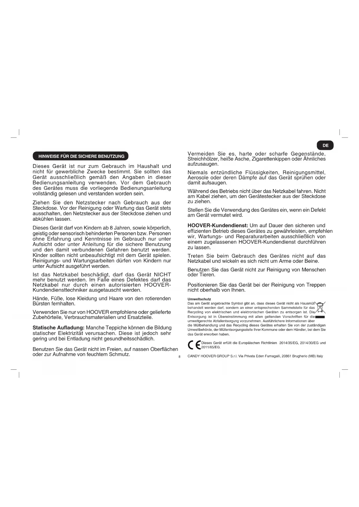 Dieses Gerät ist nur zum Gebrauch im Haushalt und nicht für gewerbliche Zwecke bestimmt. Sie sollten das Gerät ausschließlich gemäß den Angaben in dieser Bedienungsanleitung verwenden. Vor dem Gebrauch des Gerätes muss die vorliegende Bedienungsanleitung vollständig gelesen und verstanden worden sein. Ziehen Sie den Netzstecker nach Gebrauch aus der Steckdose. Vor der Reinigung oder Wartung das Gerät stets ausschalten, den Netzstecker aus der Steckdose ziehen und abkühlen lassen. Dieses Gerät darf von Kindern ab 8 Jahren, sowie körperlich, geistig oder sensorisch behinderten Personen bzw. Personen ohne Erfahrung und Kenntnisse im Gebrauch nur unter Aufsicht oder unter Anleitung für die sichere Benutzung und den damit verbundenen Gefahren benutzt werden. Kinder sollten nicht unbeaufsichtigt mit dem Gerät spielen. Reinigungs- und Wartungsarbeiten dürfen von Kindern nur unter Aufsicht ausgeführt werden. Ist das Netzkabel beschädigt, darf das Gerät NICHT mehr benutzt werden. Im Falle eines Defektes darf das Netzkabel nur durch einen autorisierten HOOVER- Kundendiensttechniker ausgetauscht werden. Hände, Füße, lose Kleidung und Haare von den rotierenden Bürsten fernhalten. Verwenden Sie nur von HOOVER empfohlene oder gelieferte Zubehörteile, Verbrauchsmaterialien und Ersatzteile. Statische Auadung: Manche Teppiche können die Bildung statischer Elektrizität verursachen. Diese ist jedoch sehr gering und bei Entladung nicht gesundheitsschädlich. Benutzen Sie das Gerät nicht im Freien, auf nassen Oberächen oder zur Aufnahme von feuchtem Schmutz. Vermeiden Sie es, harte oder scharfe Gegenstände, Streichhölzer, heiße Asche, Zigarettenkippen oder Ähnliches aufzusaugen. Niemals entzündliche Flüssigkeiten, Reinigungsmittel, Aerosole oder deren Dämpfe auf das Gerät sprühen oder damit aufsaugen. Während des Betriebs nicht über das Netzkabel fahren. Nicht am Kabel ziehen, um den Gerätestecker aus der Steckdose zu ziehen. Stellen Sie die Verwendung des Gerätes ein, wenn ein Defekt am Gerät vermutet wird. HOOVER-Kundendienst: Um auf Dauer den sicheren und efzienten Betrieb dieses Gerätes zu gewährleisten, empfehlen wir, Wartungs- und Reparaturarbeiten ausschließlich von einem zugelassenen HOOVER-Kundendienst durchführen zu lassen. Treten Sie beim Gebrauch des Gerätes nicht auf das Netzkabel und wickeln es sich nicht um Arme oder Beine. Benutzen Sie das Gerät nicht zur Reinigung von Menschen oder Tieren. Positionieren Sie das Gerät bei der Reinigung von Treppen nicht oberhalb von Ihnen. Umweltschutz Das am Gerät angebrachte Symbol gibt an, dass dieses Gerät nicht als Hausmüll behandelt werden darf, sondern an einer entsprechenden Sammelstelle für das Recycling von elektrischen und elektronischen Geräten zu entsorgen ist. Die Entsorgung ist in Übereinstimmung mit allen geltenden Vorschriften für die umweltgerechte Abfallentsorgung vorzunehmen. Ausführlichere Informationen über die Müllbehandlung und das Recycling dieses Gerätes erhalten Sie von der zuständigen Umweltbehörde, der Müllentsorgungsstelle Ihrer Kommune oder dem Händler, bei dem Sie das Gerät erworben haben. Dieses Gerät erfüllt die Europäischen Richtlinien 2014/35/EG, 2014/30/EG und 2011/65/EG. CANDY HOOVER GROUP S.r.l. Via Privata Eden Fumagalli, 20861 Brugherio (MB) Italy DE9 *Geräteausstattung ist modellabhängig ** Nur bei bestimmten Modellen können die Düsen modellabhängig sein