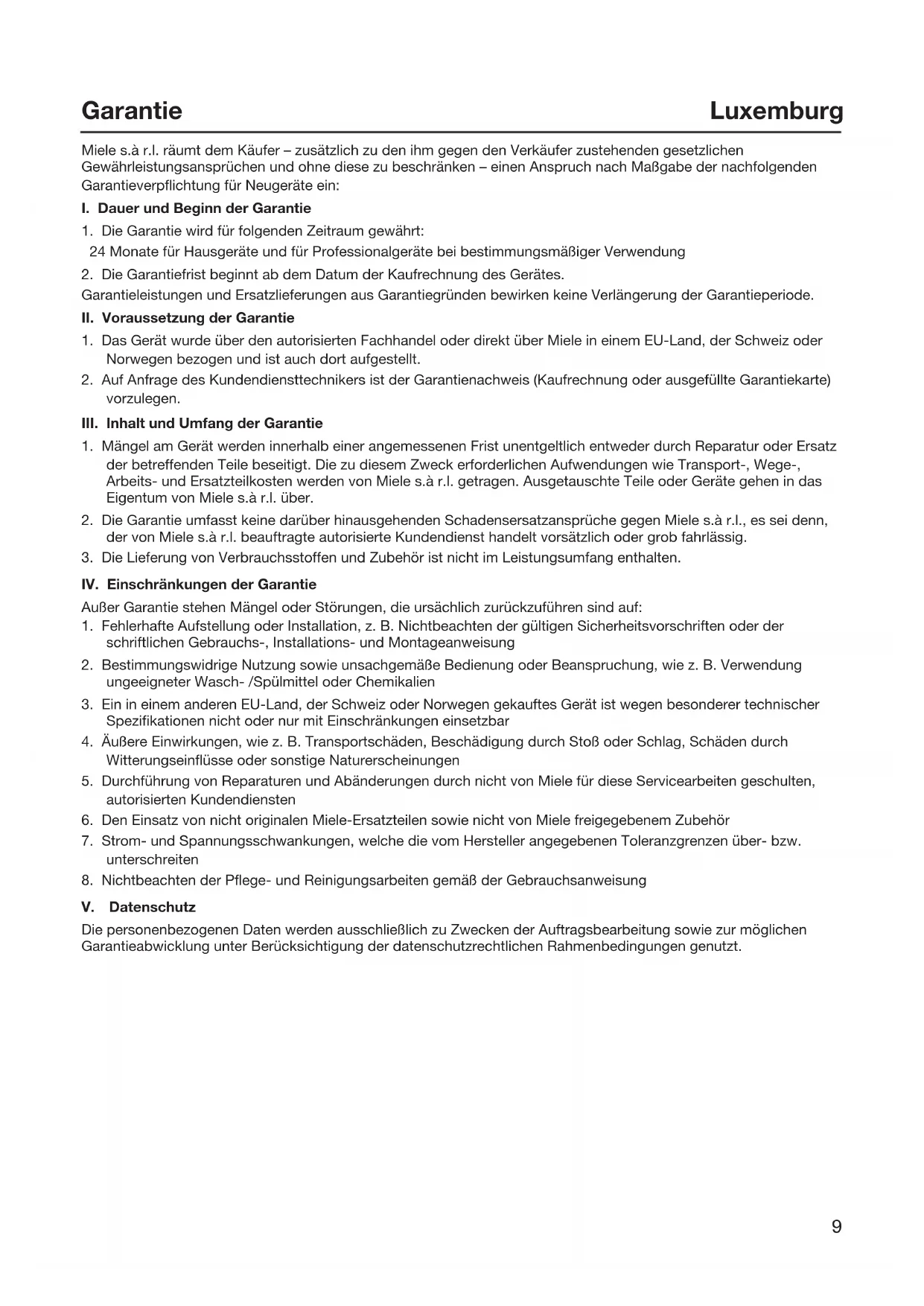 Die personenbezogenen Daten werden ausschließlich zu Zwecken der Auftragsbearbeitung sowie zur möglichen Garantieabwicklung unter Berücksichtigung der datenschutzrechtlichen Rahmenbedingungen genutzt.10 Wasserschutzgarantiebedingungen Luxemburg Miele räumt dem Käufer – zusätzlich zu den ihm gegen den Verkäufer und Miele zustehenden gesetzlichen und vertraglichen Rechten und ohne diese zu beschränken –unentgeltlich einen Anspruch nach Maßgabe der nachfolgenden Wasserschutzgarantiebedingungen für neue Hausgeräte mit Wasserschutzsystem (nachfolgend: „Gerät/e“) ein: