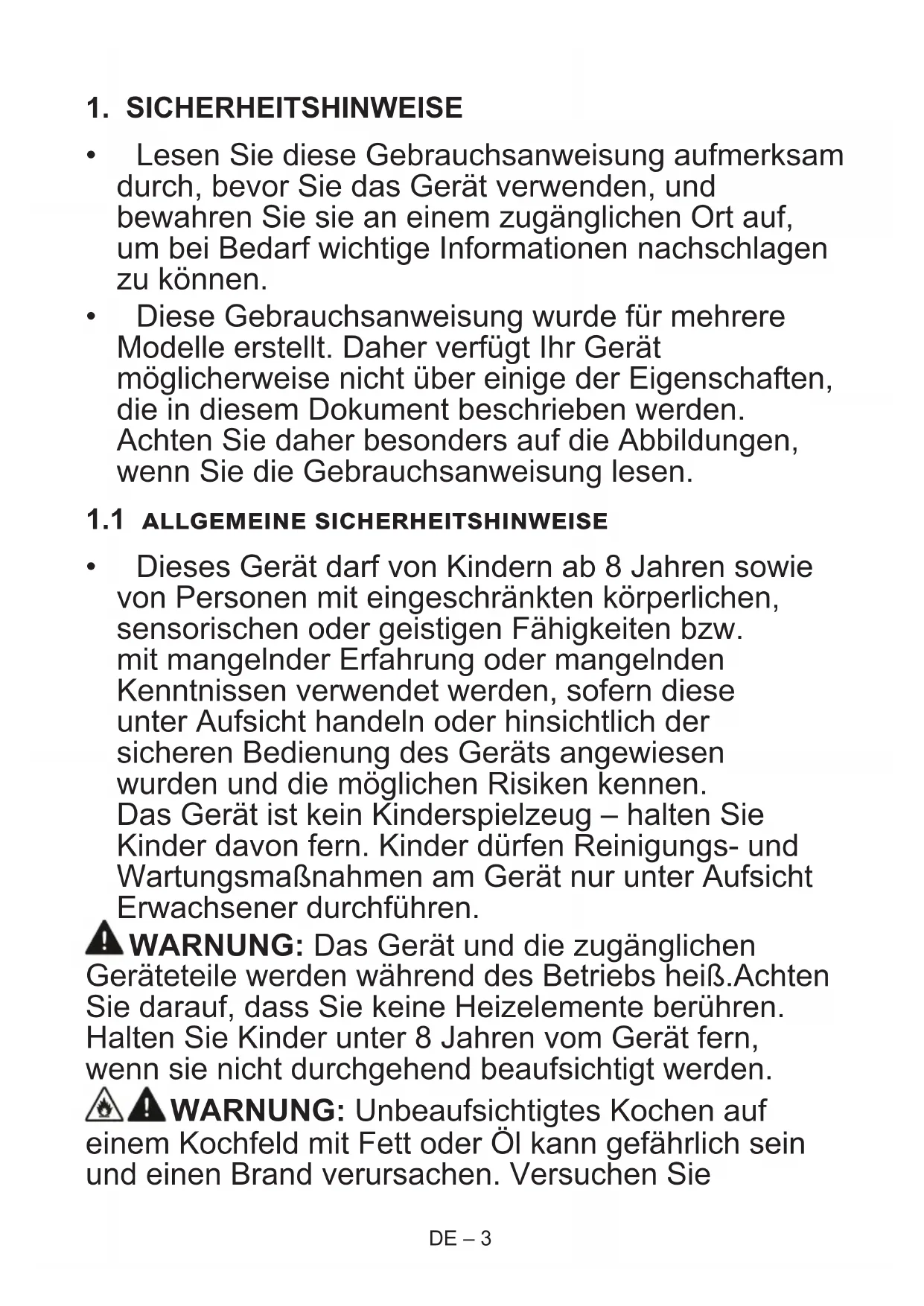 - Dieses Gerät darf von Kindern ab 8 Jahren sowie von Personen mit eingeschränkten körperlichen, sensorischen oder geistigen Fähigkeiten bzw. mit mangelnder Erfahrung oder mangelnden Kenntnissen verwendet werden, sofern diese unter Aufsicht handeln oder hinsichtlich der sicheren Bedienung des Geräts angewiesen wurden und die möglichen Risiken kennen. Das Gerät ist kein Kinderspielzeug – halten Sie Kinder davon fern. Kinder dürfen Reinigungs- und Wartungsmaßnahmen am Gerät nur unter Aufsicht Erwachsener durchführen. WARNUNG: Das Gerät und die zugänglichen Geräteteile werden während des Betriebs heiß.Achten Sie darauf, dass Sie keine Heizelemente berühren. Halten Sie Kinder unter 8 Jahren vom Gerät fern, wenn sie nicht durchgehend beaufsichtigt werden. WARNUNG: Unbeaufsichtigtes Kochen auf einem Kochfeld mit Fett oder Öl kann gefährlich sein und einen Brand verursachen. Versuchen SieDE – 4 NIEMALS einen Brand mit Wasser zu löschen. Schalten Sie stattdessen den Herd aus, und bedecken Sie die Flamme mit einem Deckel oder einer Feuerdecke. VORSICHT: Die Garvorgang muss überwacht werden. Ein kurzfristiger Garvorgang muss ständig überwacht werden. WARNUNG: Brandgefahr: Legen Sie keine Gegenstände auf dem Kochfeld ab. WARNUNG: Hat die Oberfläche Sprünge, müssen Sie das Gerät sofort ausschalten. Es besteht Stromschlaggefahr.