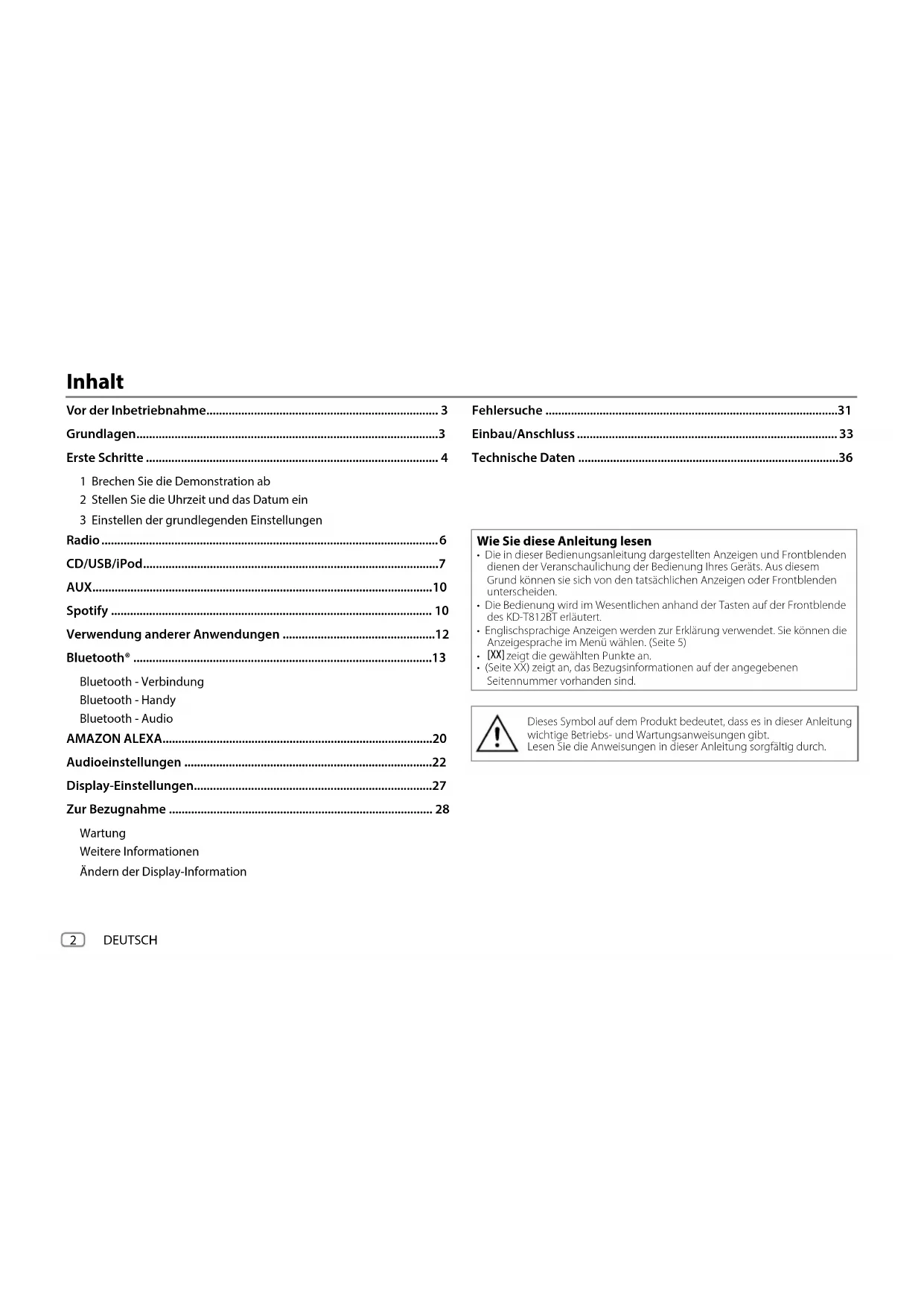 - (SeiteXX) zeigt an, das Bezugsinformationen auf der angegebenen Seitennummer vorhanden sind. Dieses Symbol auf dem Produkt bedeutet, dass es in dieser Anleitung wichtige Betriebs- und Wartungsanweisungen gibt. Lesen Sie die Anweisungen in dieser Anleitung sorgfältig durch. JS_JVC_KD_T812BT_E_GE.indd 2JS_JVC_KD_T812BT_E_GE.indd 2 24/7/2019 2:23:50 PM24/7/2019 2:23:50 PMDEUTSCH