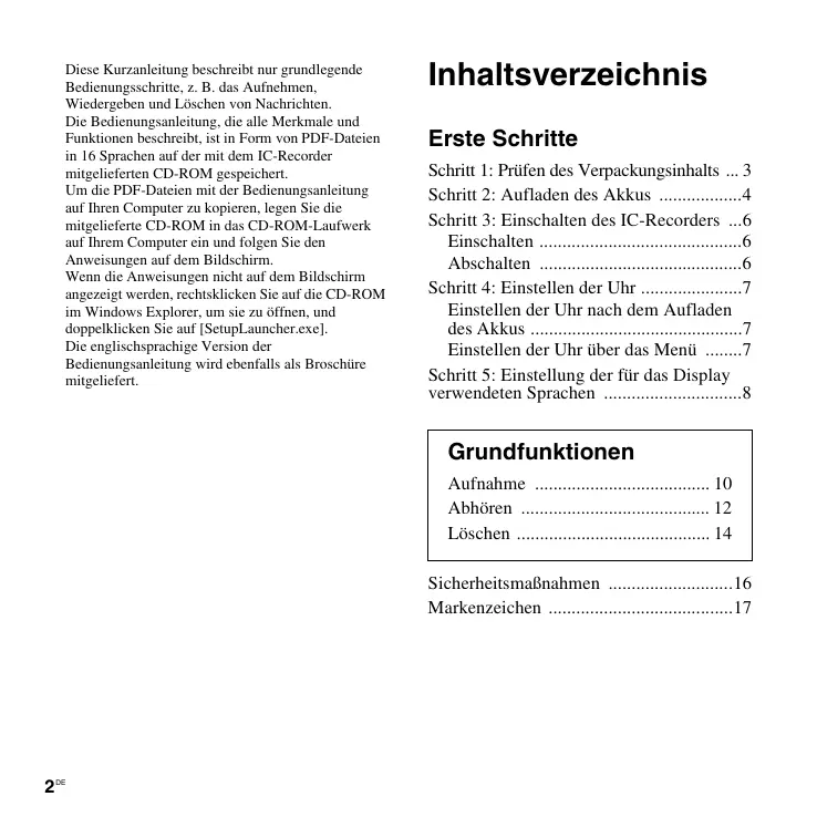 - Diese Kurzanleitung beschreibt nur grundlegende Bedienungsschritte, z. B. das Aufnehmen, Wiedergeben und Löschen von Nachrichten. Die Bedienungsanleitung, die alle Merkmale und Funktionen beschreibt, ist in Form von PDF-Dateien in 16 Sprachen auf der mit dem IC-Recorder mitgelieferten CD-ROM gespeichert. Um die PDF-Dateien mit der Bedienungsanleitung auf Ihren Computer zu kopieren, legen Sie die mitgelieferte CD-ROM in das CD-ROM-Laufwerk auf Ihrem Computer ein und folgen Sie den Anweisungen auf dem Bildschirm. Wenn die Anweisungen nicht auf dem Bildschirm angezeigt werden, rechtsklicken Sie auf die CD-ROM im Windows Explorer, um sie zu öffnen, und doppelklicken Sie auf [SetupLauncher.exe]. Die englischsprachige Version der Bedienungsanleitung wird ebenfalls als Broschüre mitgeliefert. Inhaltsverzeichnis Erste Schritte Schritt 1: Prüfen des Verpackungsinhalts p. 3
