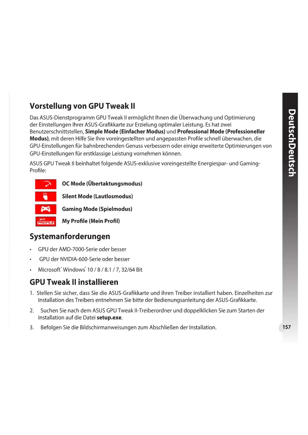 Ярлики клавіатури Увімкнути/вимкнутиЯрликиКлавіатури,щобшвидкопоказувтаиголовнийекранішвидковносити певні корективи. Налаштування ярликів клавіатури157 DeutschDeutsch Vorstellung von GPU Tweak II Das ASUS-Dienstprogramm GPU Tweak II ermöglicht Ihnen die Überwachung und Optimierung der Einstellungen Ihrer ASUS-Grakkarte zur Erzielung optimaler Leistung. Es hat zwei Benutzerschnittstellen, Simple Mode (Einfacher Modus) und Professional Mode (Professioneller Modus), mit deren Hilfe Sie Ihre voreingestellten und angepassten Prole schnell überwachen, die GPU-Einstellungen für bahnbrechenden Genuss verbessern oder einige erweiterte Optimierungen von GPU-Einstellungen für erstklassige Leistung vornehmen können. ASUS GPU Tweak II beinhaltet folgende ASUS-exklusive voreingestellte Energiespar- und Gaming- Prole: OC Mode (Übertaktungsmodus) Silent Mode (Lautlosmodus) Gaming Mode (Spielmodus) My Prole (Mein Prol) Systemanforderungen