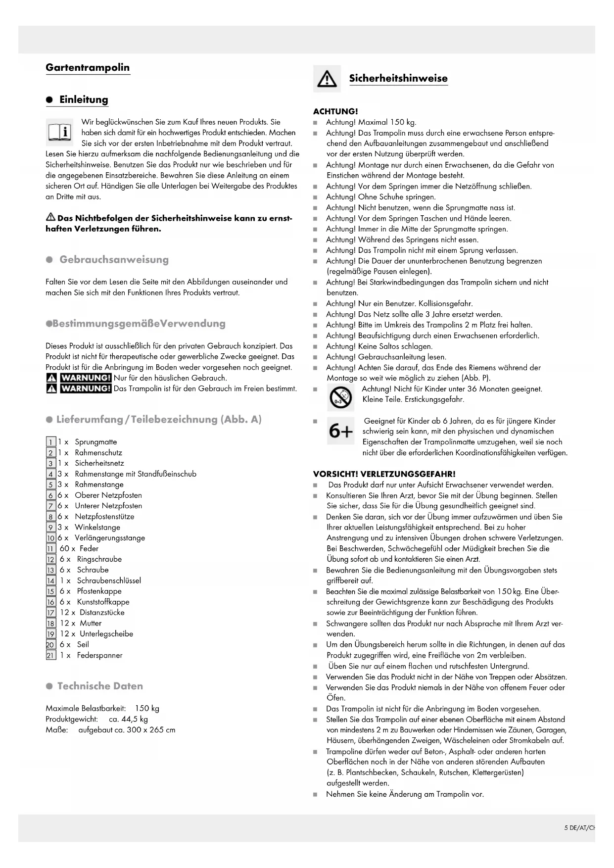 1 x Federspanner Technische Daten Maximale Belastbarkeit: 150 kg Produktgewicht: ca. 44,5 kg Maße: aufgebaut ca. 300 x 265 cm Sicherheitshinweise ACHTUNG! Achtung! Maximal 150 kg. Achtung! Das Trampolin muss durch eine erwachsene Person entspre- chend den Aufbauanleitungen zusammengebaut und anschließend vor der ersten Nutzung überprüft werden. Achtung! Montage nur durch einen Erwachsenen, da die Gefahr von Einstichen während der Montage besteht. Achtung! Vor dem Springen immer die Netzöffnung schließen. Achtung! Ohne Schuhe springen. Achtung! Nicht benutzen, wenn die Sprungmatte nass ist. Achtung! Vor dem Springen Taschen und Hände leeren. Achtung! Immer in die Mitte der Sprungmatte springen. Achtung! Während des Springens nicht essen. Achtung! Das Trampolin nicht mit einem Sprung verlassen. Achtung! Die Dauer der ununterbrochenen Benutzung begrenzen (regelmäßige Pausen einlegen). Achtung! Bei Starkwindbedingungen das Trampolin sichern und nicht benutzen. Achtung! Nur ein Benutzer. Kollisionsgefahr. Achtung! Das Netz sollte alle 3 Jahre ersetzt werden. Achtung! Bitte im Umkreis des Trampolins 2 m Platz frei halten. Achtung! Beaufsichtigung durch einen Erwachsenen erforderlich. Achtung! Keine Saltos schlagen. Achtung! Gebrauchsanleitung lesen. Achtung! Achten Sie darauf, das Ende des Riemens während der Montage so weit wie möglich zu ziehen (Abb. P). Achtung! Nicht für Kinder unter 36 Monaten geeignet. Kleine Teile. Erstickungsgefahr. Geeignet für Kinder ab 6 Jahren, da es für jüngere Kinder schwierig sein kann, mit den physischen und dynamischen Eigenschaften der Trampolinmatte umzugehen, weil sie noch nicht über die erforderlichen Koordinationsfähigkeiten verfügen. VORSICHT! VERLETZUNGSGEFAHR! Das Produkt darf nur unter Aufsicht Erwachsener verwendet werden. Konsultieren Sie Ihren Arzt, bevor Sie mit der Übung beginnen. Stellen Sie sicher, dass Sie für die Übung gesundheitlich geeignet sind. Denken Sie daran, sich vor der Übung immer aufzuwärmen und üben Sie Ihrer aktuellen Leistungsfähigkeit entsprechend. Bei zu hoher Anstrengung und zu intensiven Übungen drohen schwere Verletzungen. Bei Beschwerden, Schwächegefühl oder Müdigkeit brechen Sie die Übung sofort ab und kontaktieren Sie einen Arzt. Bewahren Sie die Bedienungsanleitung mit den Übungsvorgaben stets griffbereit auf. Beachten Sie die maximal zulässige Belastbarkeit von 150 kg. Eine Über- schreitung der Gewichtsgrenze kann zur Beschädigung des Produkts sowie zur Beeinträchtigung der Funktion führen. Schwangere sollten das Produkt nur nach Absprache mit Ihrem Arzt ver- wenden. Um den Übungsbereich herum sollte in die Richtungen, in denen auf das Produkt zugegriffen wird, eine Freifläche von 2m verbleiben. Üben Sie nur auf einem flachen und rutschfesten Untergrund. Verwenden Sie das Produkt nicht in der Nähe von Treppen oder Absätzen. Verwenden Sie das Produkt niemals in der Nähe von offenem Feuer oder Öfen. Das Trampolin ist nicht für die Anbringung im Boden vorgesehen. Stellen Sie das Trampolin auf einer ebenen Oberfläche mit einem Abstand von mindestens 2 m zu Bauwerken oder Hindernissen wie Zäunen, Garagen, Häusern, überhängenden Zweigen, Wäscheleinen oder Stromkabeln auf. Trampoline dürfen weder auf Beton-, Asphalt- oder anderen harten Oberflächen noch in der Nähe von anderen störenden Aufbauten (z. B. Plantschbecken, Schaukeln, Rutschen, Klettergerüsten) aufgestellt werden. Nehmen Sie keine Änderung am Trampolin vor.6 DE/AT/CH Die selbstsichernden Muttern
