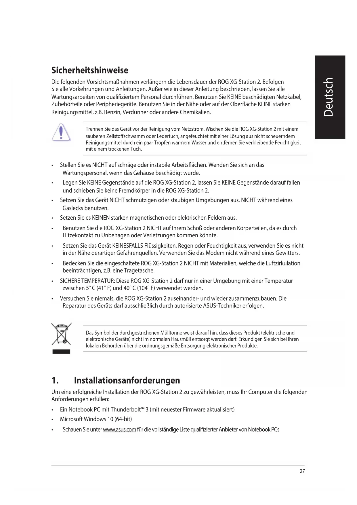 - Versuchen Sie niemals, die ROG XG-Station 2 auseinander- und wieder zusammenzubauen. Die Reparatur des Geräts darf ausschließlich durch autorisierte ASUS-Techniker erfolgen. Das Symbol der durchgestrichenen Mülltonne weist darauf hin, dass dieses Produkt (elektrische und elektronische Geräte) nicht im normalen Hausmüll entsorgt werden darf. Erkundigen Sie sich bei Ihren lokalen Behörden über die ordnungsgemäße Entsorgung elektronischer Produkte. Deutsch