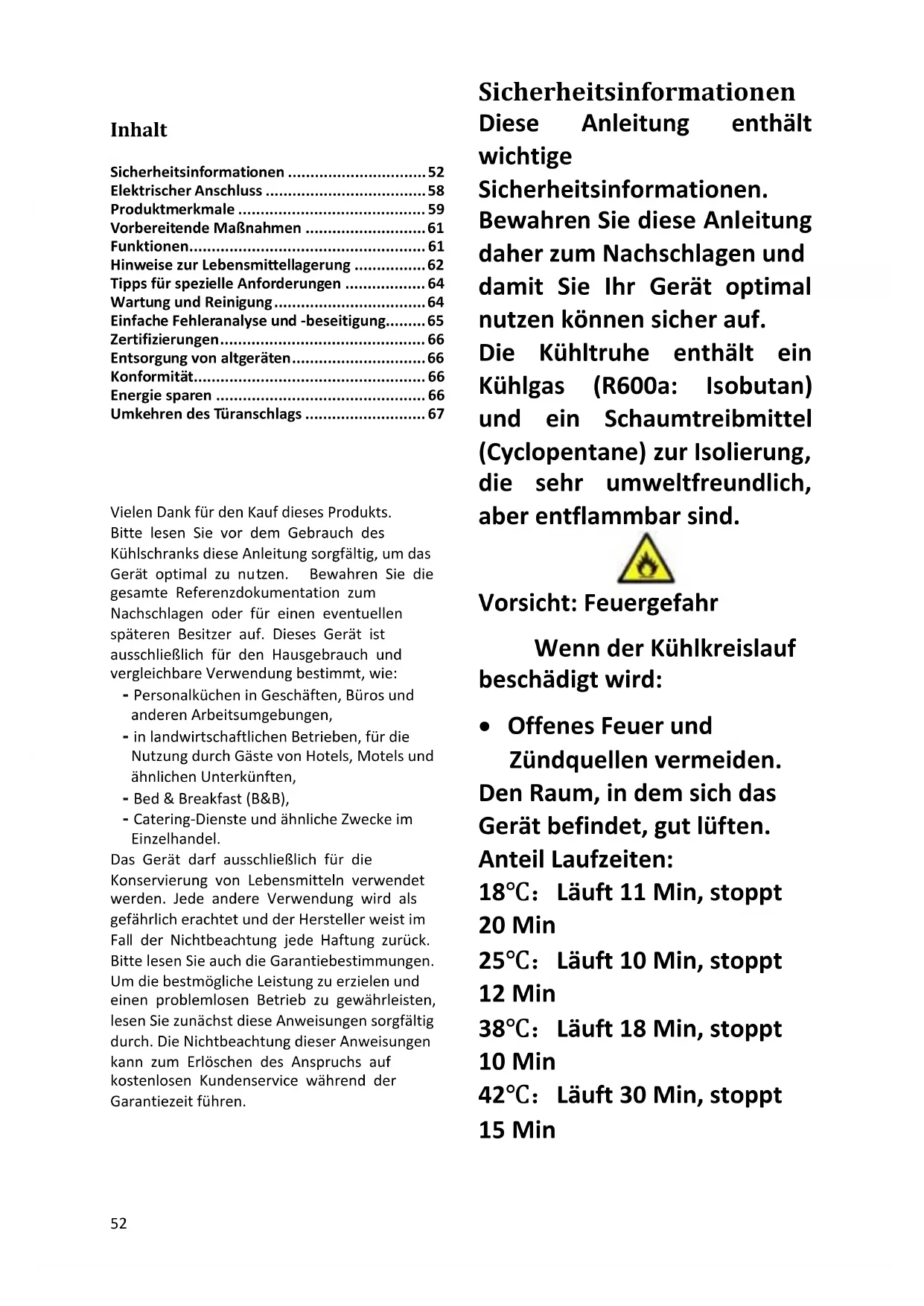 - Offenes Feuer und Zündquellen vermeiden. Den Raum, in dem sich das Gerät befindet, gut lüften. Anteil Laufzeiten: 18℃:Läuft 11 Min, stoppt 20 Min 25℃:Läuft 10 Min, stoppt 12 Min 38℃:Läuft 18 Min, stoppt 10 Min 42℃:Läuft 30 Min, stoppt 15 Min53 WARNUNG!