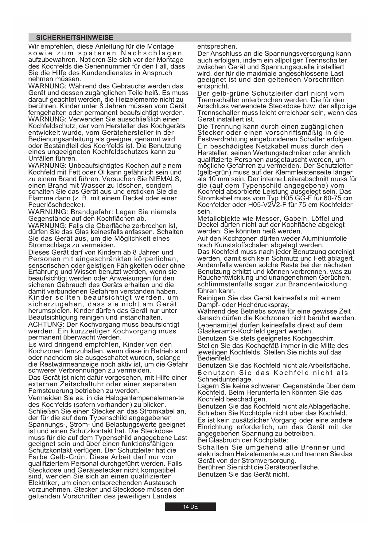 ACHTUNG: Der Kochvorgang muss beaufsichtigt werden. Ein kurzzeitiger Kochvorgang muss permanent überwacht werden. Dieses Gerät darf von Kindern ab 8 Jahren und Personen mit eingeschränkten körperlichen, sensorischen oder geistigen Fähigkeiten oder ohne Erfahrung und Wissen benutzt werden, wenn sie beaufsichtigt werden oder Anweisungen für den sicheren Gebrauch des Geräts erhalten und die damit verbundenen Gefahren verstanden haben. Kinder sollten beaufsichtigt werden, um sicherzugehen, dass sie nicht am Gerät herumspielen. Kinder dürfen das Gerät nur unter Beaufsichtigung reinigen und instandhalten. Das Gerät ist nicht dafür vorgesehen, mit Hilfe einer externen Zeitschaltuhr oder einer separaten Fernsteuerung betrieben zu werden. Es wird dringend empfohlen, Kinder von den Kochzonen fernzuhalten, wenn diese in Betrieb sind oder nachdem sie ausgeschaltet wurden, solange die Restwärmeanzeige noch aktiv ist, um die Gefahr schwerer Verbrennungen zu vermeiden. WARNUNG: Falls die Oberfläche zerbrochen ist, dürfen Sie das Glas keinesfalls anfassen. Schalten Sie das Gerät aus, um die Möglichkeit eines Stromschlags zu vermeiden. SICHERHEITSHINWEISE entsprechen. Ein beschädigtes Netzkabel muss durch den Hersteller, seinen Wartungstechniker oder ähnlich qualifizierte Personen ausgetauscht werden, um mögliche Gefahren zu vermeiden. Der Schutzleiter (gelb-grün) muss auf der Klemmleistenseite länger als 10 mm sein. Der interne Leiterabschnitt muss für die (auf dem Typenschild angegebene) vom Kochfeld absorbierte Leistung ausgelegt sein. Das Stromkabel muss vom Typ H05 GG-F für 60-75 cm Kochfelder oder H05-V2V2-F für 75 cm Kochfelder sein. Der gelb-grüne Schutzleiter darf nicht vom Trennschalter unterbrochen werden. Die für den Anschluss verwendete Steckdose bzw. der allpolige Trennschalter muss leicht erreichbar sein, wenn das Gerät installiert ist. Reinigen Sie das Gerät keinesfalls mit einem Dampf- oder Hochdruckspray. Während des Betriebs sowie für eine gewisse Zeit danach dürfen die Kochzonen nicht berührt werden. Auf den Kochzonen dürfen weder Aluminiumfolie noch Kunststoffschalen abgelegt werden. Lebensmittel dürfen keinesfalls direkt auf dem Glaskeramik-Kochfeld gegart werden. Stellen Sie das Kochgefäß immer in die Mitte des jeweiligen Kochfelds. Stellen Sie nichts auf das Bedienfeld. Das Kochfeld muss nach jeder Benutzung gereinigt werden, damit sich kein Schmutz und Fett ablagert. Andernfalls werden solche Reste bei der nächsten Benutzung erhitzt und können verbrennen, was zu Rauchentwicklung und unangenehmen Gerüchen, schlimmstenfalls sogar zur Brandentwicklung führen kann. Lagern Sie keine schweren Gegenstände über dem Kochfeld. Beim Herunterfallen könnten Sie das Kochfeld beschädigen. Der Anschluss an die Spannungsversorgung kann auch erfolgen, indem ein allpoliger Trennschalter zwischen Gerät und Spannungsquelle installiert wird, der für die maximale angeschlossene Last geeignet ist und den geltenden Vorschriften entspricht. Metallobjekte wie Messer, Gabeln, Löffel und Deckel dürfen nicht auf der Kochfläche abgelegt werden. Sie könnten heiß werden. Benutzen Sie stets geeignetes Kochgeschirr. Benutzen Sie das Kochfeld nicht alsArbeitsfläche. Benutzen Sie das Kochfeld nicht alsAblagefläche. Schieben Sie Kochtöpfe nicht über das Kochfeld. Benutzen Sie das Kochfeld nicht als Schneidunterlage. Es st ken zusätzlcher Vorgang oder ene andere Enrchtung erforderlch, um das Gerät mt der angegebenen Spannung zu betreben. Die Trennung kann durch einen zugänglichen Stecker oder einen vorschriftsmäßig in die Festverdrahtung eingebundenen Schalter erfolgen. BeGlasbruch der Kochplatte: Benutzen Se das Gerät ncht. Berühren Sencht de Geräteoberfläche. Schalten Se umgehend alle Brenner und elektrschen Hezelemente aus und trennen Se das Gerät von der Stromversorgung.15 DE DieArbeitsplatte, in der diese Kochmulde eingebaut werden soll, kann aus beliebigem Material sein, vorausgesetzt, es ist hitzebeständig und kann eine Temperatur von 100°C aushalten. Die Arbeitsplatte kann zwischen 25 und 45 mm dick sein. Die Einbaumaße entnehmen Sie bitte der .Abb. 2 Wenn unter der Kochmulde ein zugängliches Möbelteil vorhanden ist, muss zwischen der Kochmulde und der unteren Möbelnische eine Trennplatte aus isolierendem, hitzebeständigem Material (Holzplatte o.Ä.) dazwischen gebaut werden ( ).s.Abb. 2 Falls an einer Seite der Kochmulde die Wand eines Möbels ist, muss der Abstand der Mulde zur Möbelwand mindestens 17 cm (60 cm) oder 25 cm (75 cm) betragen ( ). Zwischen Küchenwand und Mulde muss einAbstand von mindestens 70 mm eingehalten werden. Der Abstand zwischen der Kochmulde und einem eventuell darüber befindlichen Element (z.B. Dunstabzugshaube) muss mindestens 70 cm betragen ( ). s. Abb. 2 s.Abb. 4 Wichtig: Entnehmen Sie der Abb. 1, wie die Dichtungsstreifen angebracht werden müssen. Die Befestigung an das Möbel erfolgt mit Fixierbügel, die als Zubehör zur Mulde mitgeliefert werden. Am Geräteboden sind die Bohrungen zum Verschrauben der Fixierbügel bereits vorhanden. Unter der Kochmulde mit 60 cm oder 75 cm Breite kann nur ein Backofen mit Kühlungsventilator installiert werden. Metallgegenstände in der Schublade können hohe Temperaturen aufgrund der Luftzirkulierung erreichen. Es wird daher empfohlen, eineAbtrennung aus Holz einzusetzen. 1.1. EINBAU 1.2. GEEIGNETER STANDORT Das Gerät sollte gemäß den Installationsanweisungen installiert werden und genügend Belüftung gewährleistet werden. Lesen Sie bitte dieAnweisungen, bevor Sie das Gerät installieren. Beim Gebrauch eines Gasherdes entstehen Hitze und Feuchtigkeit, die sich im Raum verbreiten. Daher ist es wichtig, eine ausreichende Belüftung des Raumes zu gewährleisten, entweder durch Lüftungsöffnungen oder durch eine Dunstabzugshaube mit Außenanschluss. Bei einem längeren Gebrauch des Gerätes ist es ratsam, die Belüftung zu fördern, z.B. durch zusätzliches Öffnen 