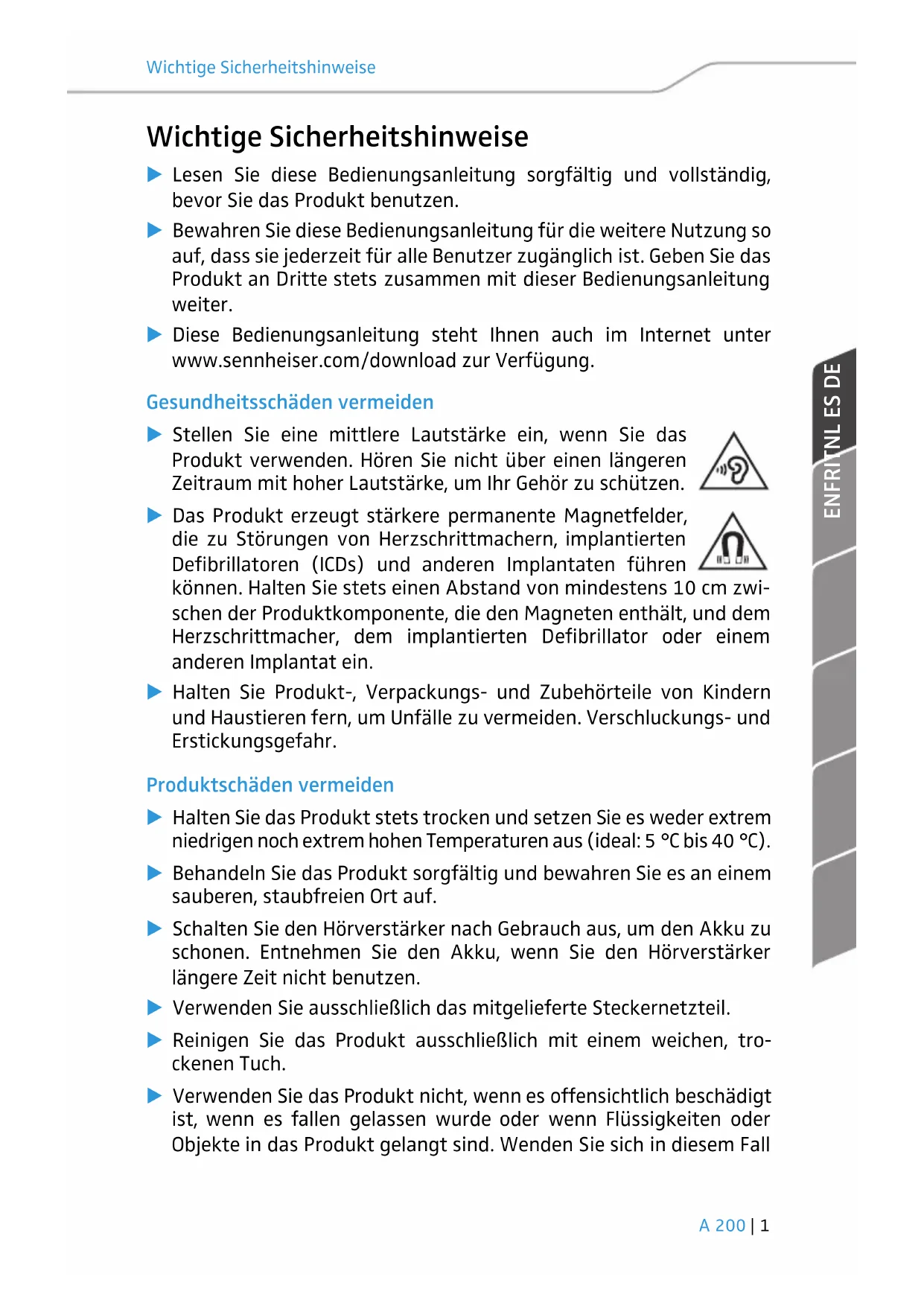 Wichtige Sicherheitshinweise 왘 Lesen Sie diese Bedienungsanleitung sorgfältig und vollständig, bevor Sie das Produkt benutzen. 왘 Bewahren Sie diese Bedienungsanleitung für die weitere Nutzung so auf, dass sie jederzeit für alle Benutzer zugänglich ist. Geben Sie das Produkt an Dritte stets zusammen mit dieser Bedienungsanleitung weiter. 왘 Diese Bedienungsanleitung steht Ihnen auch im Internet unter www.sennheiser.com/download zur Verfügung. Gesundheitsschäden vermeiden 왘 Stellen Sie eine mittlere Lautstärke ein, wenn Sie das Produkt verwenden. Hören Sie nicht über einen längeren Zeitraum mit hoher Lautstärke, um Ihr Gehör zu schützen. 왘 Das Produkt erzeugt stärkere permanente Magnetfelder, die zu Störungen von Herzschrittmachern, implantierten Defibrillatoren (ICDs) und anderen Implantaten führen können. Halten Sie stets einen Abstand von mindestens 10 cm zwi- schen der Produktkomponente, die den Magneten enthält, und dem Herzschrittmach er, dem implantierten Defibrillator oder einem anderen Implantat ein. 왘 Halten Sie Produkt-, Verpackungs- und Zubehörteile von Kindern und Haustieren fern, um Unfälle zu vermeiden. Verschluckungs- und Erstickungsgefahr. Produktschäden vermeiden 왘 Halten Sie das Produkt stets trocken und setzen Sie es weder extrem niedrigen noch extrem hohen Temperaturen aus (ideal: 5 °C bis 40 °C). 왘 Behandeln Sie das Produkt sorgfältig und bewahren Sie es an einem sauberen, staubfreien Ort auf. 왘 Schalten Sie den Hörverstärker nach Gebrauch aus, um den Akku zu schonen. Entnehmen Sie den Akku, wenn Sie den Hörverstärker längere Zeit nicht benutzen. 왘 Verwenden Sie ausschließlich das mitgelieferte Steckernetzteil. 왘 Reinigen Sie das Produkt ausschließlich mit einem weichen, tro- ckenen Tuch. 왘 Verwenden Sie das Produkt nicht, wenn es offensichtlich beschädigt ist, wenn es fallen gelassen wurde oder wenn Flüssigkeiten oder Objekte in das Produkt gelangt sind. Wenden Sie sich in diesem FallWichtige Sicherheitshinweise 2 | A 200 an eine qualifizierte Fachwerkstatt oder Ihren Sennheiser Service- Partner, um das Produkt einer Prüfung zu unterziehen. 왘 Verwenden Sie ausschließlich die von Sennheiser gelieferten oder empfohlenen Zusatzgeräte/Zubehörteile/Ersatzteile. Schäden am Steckernetzteil vermeiden 왘 Setzen Sie das Steckernetzteil keiner Feuchtigkeit aus. Es besteht die Gefahr eines Brands oder Stromschlags. 왘 Ziehen Sie das Steckernetzteil aus der Steckdose, um das Produkt vom Netz zu trennen, wenn Gewitter auftreten oder das Produkt über einen längeren Zeitraum nicht verwendet wird. 왘 Betreiben Sie das Steckernetzteil ausschließlich an Stromquellen- typen, die den Angaben in den Technischen Daten (siehe Seite 9) entsprechen. 왘 Achten Sie immer darauf, dass das Steckernetzteil in ordnungs- gemäßem Zustand und leicht zugänglich ist, fest in der Steckdose steckt, nicht abgedeckt oder längerer Sonnenbestrahlung aus- gesetzt wird, um eine Überhitzung zu verhindern. Bestimmungsgemäßer Gebrauch Dieses Produkt ist für den privaten, häuslichen Bereich vorgesehen. Der Hörverstärker ist ausschließlich zur gelegentlichen Unterstützung Ihres Gehörs konzipiert. Als nicht bestimmungsgemäßer Gebrauch gilt, wenn Sie das Produkt