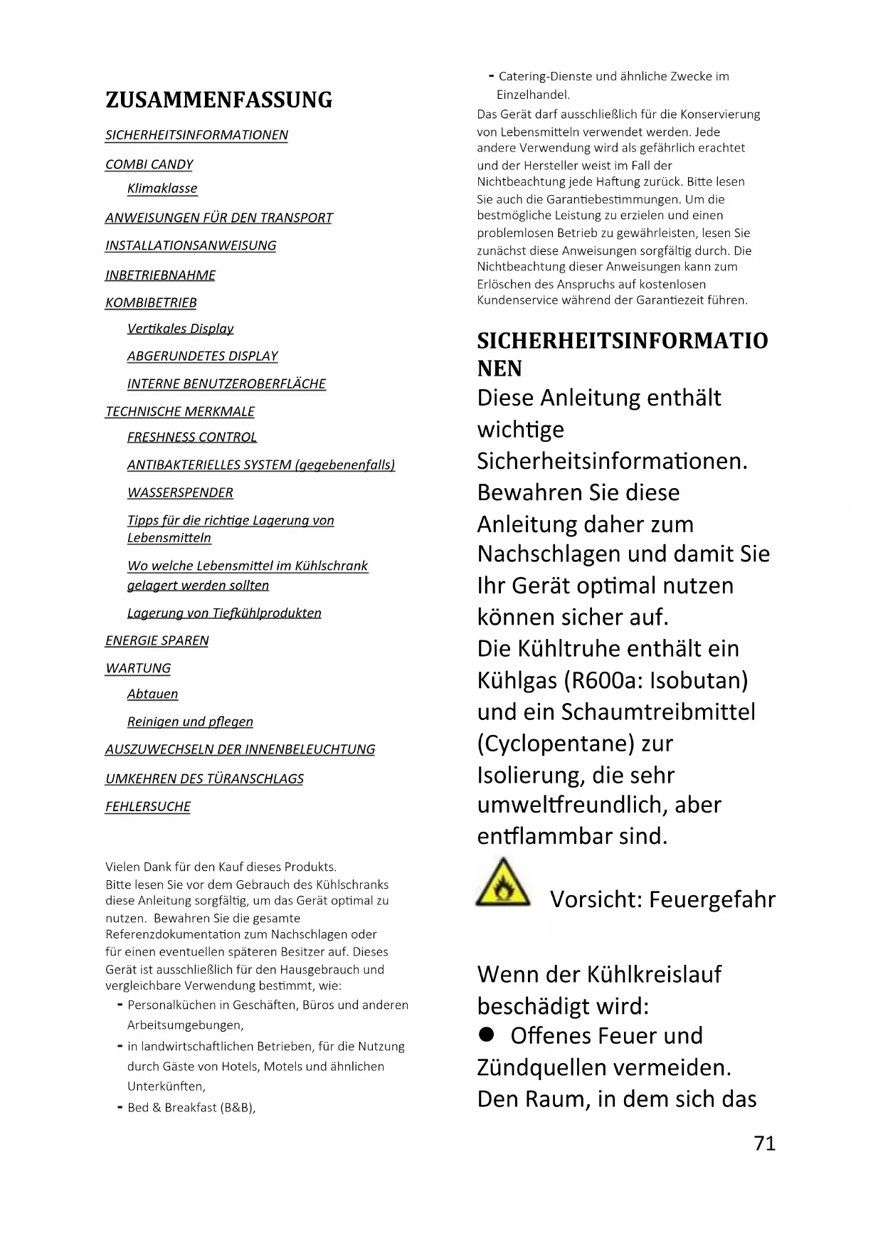 Vielen Dank für den Kauf dieses Produkts. Bitte lesen Sie vor dem Gebrauch des Kühlschranks diese Anleitung sorgfältig, um das Gerät optimal zu nutzen. Bewahren Sie die gesamte Referenzdokumentation zum Nachschlagen oder für einen eventuellen späteren Besitzer auf. Dieses Gerät ist ausschließlich für den Hausgebrauch und vergleichbare Verwendung bestimmt, wie: - Personalküchen in Geschäften, Büros und anderen Arbeitsumgebungen, - in landwirtschaftlichen Betrieben, für die Nutzung durch Gäste von Hotels, Motels und ähnlichen Unterkünften, - Bed & Breakfast (B&B), - Catering-Dienste und ähnliche Zwecke im Einzelhandel. Das Gerät darf ausschließlich für die Konservierung von Lebensmitteln verwendet werden. Jede andere Verwendung wird als gefährlich erachtet und der Hersteller weist im Fall der Nichtbeachtung jede Haftung zurück. Bitte lesen Sie auch die Garantiebestimmungen. Um die bestmögliche Leistung zu erzielen und einen problemlosen Betrieb zu gewährleisten, lesen Sie zunächst diese Anweisungen sorgfältig durch. Die Nichtbeachtung dieser Anweisungen kann zum Erlöschen des Anspruchs auf kostenlosen Kundenservice während der Garantiezeit führen. SICHERHEITSINFORMATIO NEN Diese Anleitung enthält wichtige Sicherheitsinformationen. Bewahren Sie diese Anleitung daher zum Nachschlagen und damit Sie Ihr Gerät optimal nutzen können sicher auf. Die Kühltruhe enthält ein Kühlgas (R600a: Isobutan) und ein Schaumtreibmittel (Cyclopentane) zur Isolierung, die sehr umweltfreundlich, aber entflammbar sind. Vorsicht: Feuergefahr Wenn der Kühlkreislauf beschädigt wird: Offenes Feuer und Zündquellen vermeiden. Den Raum, in dem sich das72 Gerät befindet, gut lüften. WARNUNG! Vorsicht beim Reinigen/Tragen des Geräts, sodass das Metall der Kühlschlaufen nicht berührt wird, da dies Finger und Hände verletzen oder das Gerät beschädigen könnte. Dieses Gerät ist nicht geeignet, um darauf oder darunter weitere Geräte zu stapeln. Nicht auf dem Gerät sitzen oder stehen, da es dafür nicht geeignet ist. Dies könnte zu Personenschäden führen oder das Gerät beschädigen. Darauf achten, dass das Stromkabel während und nach dem Tragen/Verschieben des Geräts nicht darunter stecken bleibt, damit es nicht beschädigt oder zerschnitten wird. Beim Aufstellen des Geräts darauf achten, dass der Fußboden, Leitungen, Wandverkleidungen usw. nicht beschädigt werden. Gerät nicht verschieben, indem an der Klappe oder am Griff gezogen wird. Erlauben Sie Kindern nicht mit dem Gerät zu spielen oder an den Bedienknöpfen herumzuspielen. Unser Unternehmen übernimmt keine Haftung, falls diese Anweisungen nicht befolgt werden. Das Gerät nicht in Umgebungen mit feuchter, öliger oder staubiger Atmosphäre installieren sowie vor direkter Sonneneinstrahlung und Wasser schützen. Das Gerät nicht in der Nähe von Hitzequellen oder entflammbaren Materialien installieren. Bei einem Stromausfall nicht die Klappe öffnen. Dauert der Stromausfall weniger als 20 Stunden an, wird die Tiefkühlware nicht beeinträchtigt. Dauert der Stromausfall länger, sollten die Lebensmittel überprüft und sofort verzehrt oder gekocht und erneut eingefroren werden. Lässt sich die Klappe der73 Kühltruhe schwierig öffnen, nachdem Sie diese gerade geschlossen haben, so ist dies normal. Dies liegt am Druckausgleich, der hergestellt wird. Die Klappe lässt sich normalerweise nach wenigen Minuten wieder öffnen. Das Gerät erst dann an die Stromversorgung anschließen, wenn sämtliches Verpackungsmaterial und Transportschutzvorrichtung en entfernt wurden. Das Gerät vor dem Einschalten mindestens vier Stunden lang stehen lassen, wenn es im Liegen transportiert wurde, damit sich das Kompressoröl absetzen kann. Diese Kühltruhe darf nur für den vorgesehenen Zweck (z.B. Lagern und Einfrieren von Lebensmitteln) verwendet werden. Keine Medikamente oder Materialien für wissenschaftliche Forschungen aufbewahren. Wird Material gelagert, das eine strenge Kontrolle der Lagertemperatur erfordert, so kann sich die Qualität verschlechtern oder es kann eine unvorhergesehene Reaktion auftreten, die zu Risiken führen kann. Vor jedem Eingriff am Gerät den Netzstecker ziehen. Bei der Lieferung überprüfen, ob das Produkt nicht beschädigt ist und ob alle Teile und Zubehör unversehrt sind. Wenn Sie am Kühlsystem ein Leck feststellen, nicht die Netzsteckdose berühren und unbedingt offenes Feuer vermeiden. Das Fenster öffnen und den Raum gut lüften. Wenden Sie sich an den Kundenservice, um das Gerät reparieren zu lassen. Zum Anschluss keine Verlängerungskabel und Adapter verwenden. Das Netzkabel nicht stark spannen oder biegen und den Netzstecker nicht mit nassen Händen berühren. Den Netzstecker und/oder das Netzkabel nicht74 beschädigen - Stromschlag- und Brandgefahr! Ein beschädigtes Netzkabel muss vom Hersteller oder dem zugelassenen Kundendienst oder ähnlich qualifizierter Person ausgewechselt werden, um Gefahren vorzubeugen. Keine brennbaren und hoch flüchtigen Substanzen wie Äther, Benzin, Flüssiggas, Propan, Sprühdosen, Klebstoffe, reinen Alkohol usw. in der Kühltruhe aufbewahren - Explosionsgefahr! In der Nähe der Kühltruhe keine brennbaren Sprays wie z.B. Farbspraydosen aufbewahren. Es besteht Explosions- oder Brandgefahr. Keine Gegenstände oder mit Wasser gefüllten Behälter auf das Gerät stellen. Keine Verlängerungskabel und Mehrfachsteckleisten verwenden. Gerät nicht durch Verbrennen entsorgen. Darauf achten, dass die Kühlschleife des Geräts während des Transports oder im Betrieb nicht beschädigt wird. Bei einer Beschädigung das Gerät keinem offenen Feuer oder möglichen Zündquellen aussetzen und den Raum, in dem sich das Gerät befindet, sofort gut lüften. Das Kühlsystem an der Rückseite und im Inneren des Geräts enthält ein Kältemittel. Es muss daher darauf geachtet werden, die Leitungen nicht zu beschädigen. Im Inneren des Gefriergeräts keine elektrischen Geräte b