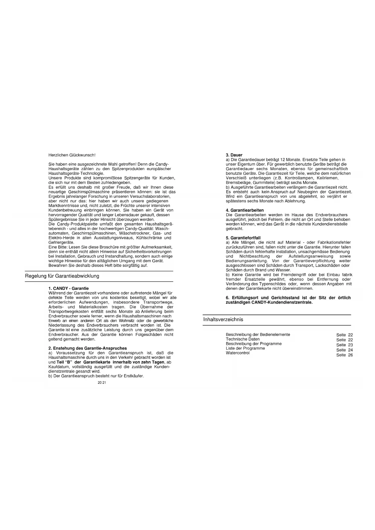 zuständigen CANDY-Kundendienstzentrale. Beschreibung der Bedienelemente Technische Daten Beschreibung der Programme Liste der Programme Watercontrol Regelung für Garantieabwicklung Seite 22 Seite 22 Seite 23 Seite 24 Seite 26 Inhaltsverzeichnis Herzlichen Glückwunsch! Sie haben eine ausgezeichnete Wahl getroffen! Denn die Candy- Haushaltsgeräte zählen zu den Spitzenprodukten europäischer Haushaltsgeräte-Technologie. Unsere Produkte sind kompromißlose Spitzengeräte für Kunden, die sich nur mit dem Besten zufriedengeben. Es erfüllt uns deshalb mit großer Freude, daß wir Ihnen diese neuartige Geschirrspülmaschine präsentieren können: sie ist das Ergebnis jahrelanger Forschung in unseren Versuchslaboratorien, aber nicht nur das: hier haben wir auch unsere gediegenen Marktkenntnisse und, nicht zuletzt, die Früchte unserer intensiven Kundenbetreuung einbringen können. Sie haben ein Gerät von hervorragender Qualität und langer Lebensdauer gekauft, dessen Spülergebnisse Sie in jeder Hinsicht überzeugen werden. Die Candy-Produktpalette umfaßt den gesamten Haushaltsgerä- tebereich - und alles in der hochwertigen Candy-Qualität: Wasch- automaten, Geschirrspülmaschinen, Wäschetrockner, Gas- und Elektro-Herde in allen Ausstattungsniveaus, Kühlschränke und Gefriergeräte. Eine Bitte: Lesen Sie diese Broschüre mit größter Aufmerksamkeit, denn sie enthält nicht allein Hinweise auf Sicherheitsvorkehrungen bei Installation, Gebrauch und Instandhaltung, sondern auch einige wichtige Hinweise für den alltäglichen Umgang mit dem Gerät. Bewahren Sie deshalb dieses Heft bitte sorgfältig auf.