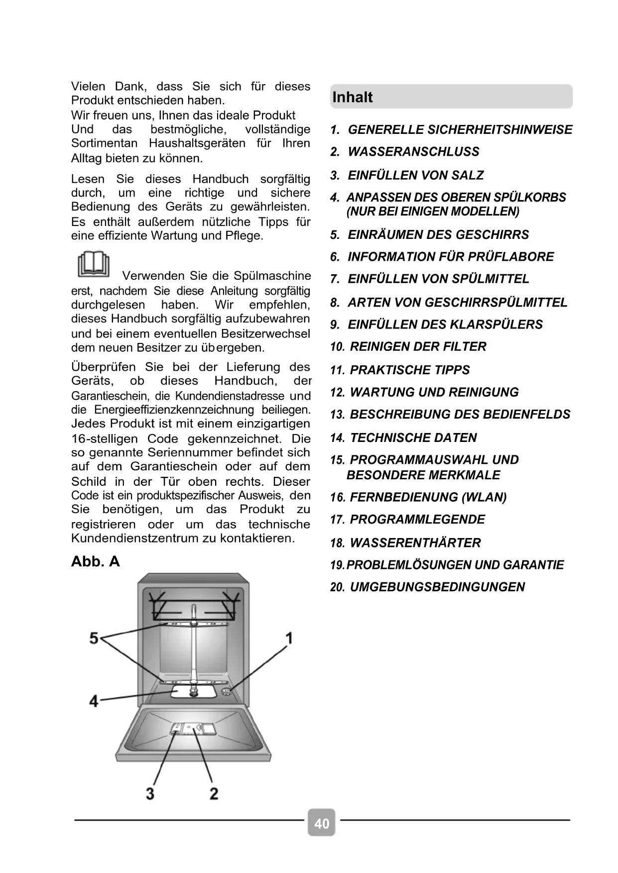 Verwenden Sie die Spülmaschine erst, nachdem Sie diese Anleitung sorgfältig durchgelesen haben. Wir empfehlen, dieses Handbuch sorgfältig aufzubewahren und bei einem eventuellen Besitzerwechsel dem neuen Besitzer zu üb ergeben.