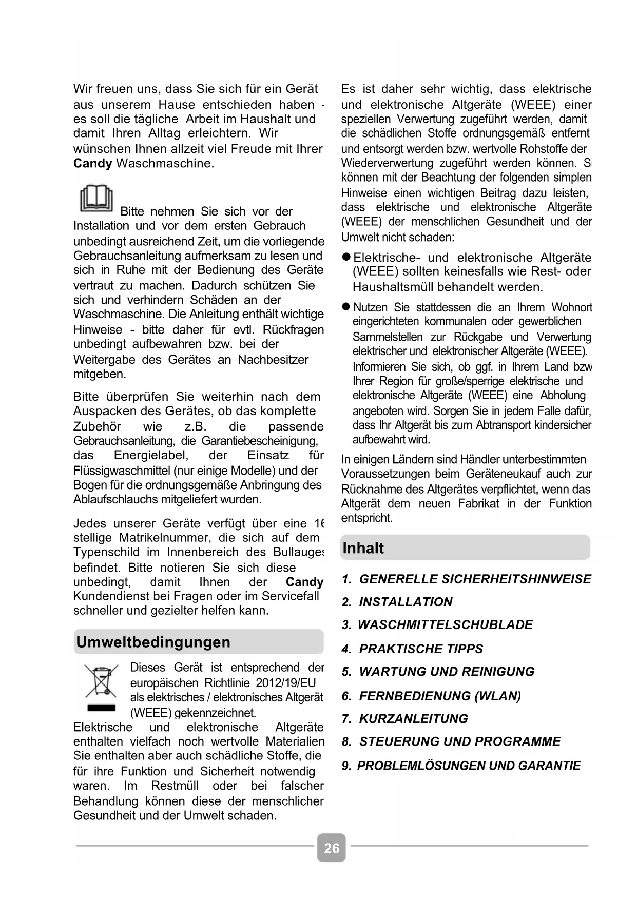 Wir freuen uns, dass Sie sich für ein Gerät aus unserem Hause entschieden haben – es soll die tägliche Arbeit im Haushalt und damit Ihren Alltag erleichtern. Wir wünschen Ihnen allzeit viel Freude mit Ihrer Candy Waschmaschine. Bitte nehmen Sie sich vor der Installation und vor dem ersten Gebrauch unbedingt ausreichend Zeit, um die vorliegende Gebrauchsanleitung aufmerksam zu lesen und sich in Ruhe mit der Bedienung des Gerätes vertraut zu machen. Dadurch schützen Sie sich und verhindern Schäden an der Waschmaschine. Die Anleitung enthält wichtige Hinweise - bitte daher für evtl. Rückfragen unbedingt aufbewahren bzw. bei der Weitergabe des Gerätes an Nachbesitzer mitgeben. Bitte überprüfen Sie weiterhin nach dem Auspacken des Gerätes, ob das komplette Zubehör wie z.B. die passende Gebrauchsanleitung, die Garantiebescheinigung, das Energielabel, der Einsatz für Flüssigwaschmittel (nur einige Modelle) und der Bogen für die ordnungsgemäße Anbringung des Ablaufschlauchs mitgeliefert wurden. Jedes unserer Geräte verfügt über eine 16- stellige Matrikelnummer, die sich auf dem Typenschild im Innenbereich des Bullauges befindet. Bitte notieren Sie sich diese unbedingt, damit Ihnen der Candy Kundendienst bei Fragen oder im Servicefall schneller und gezielter helfen kann.